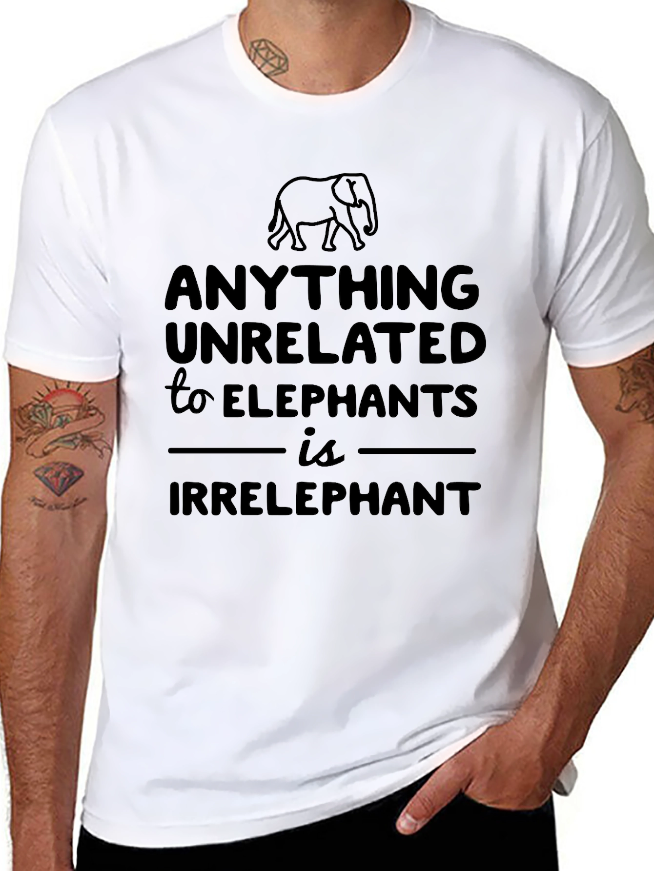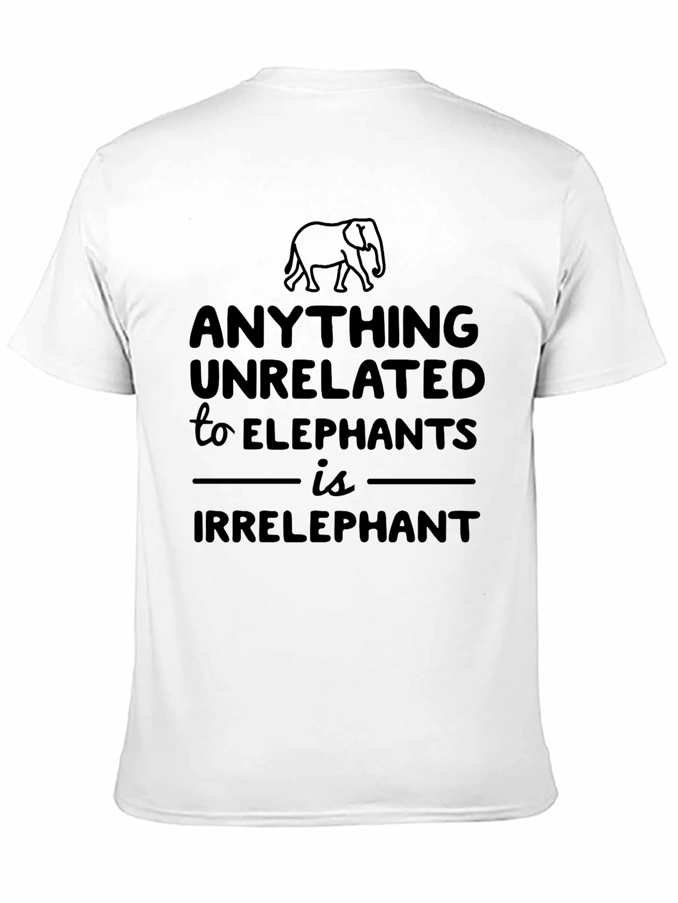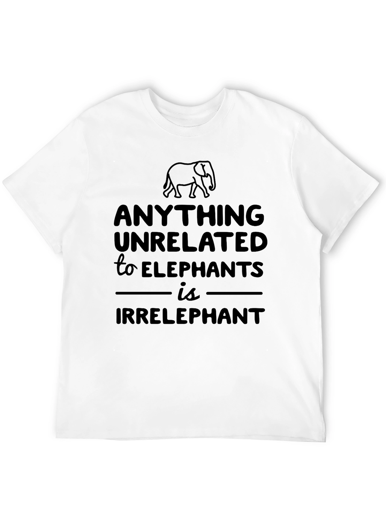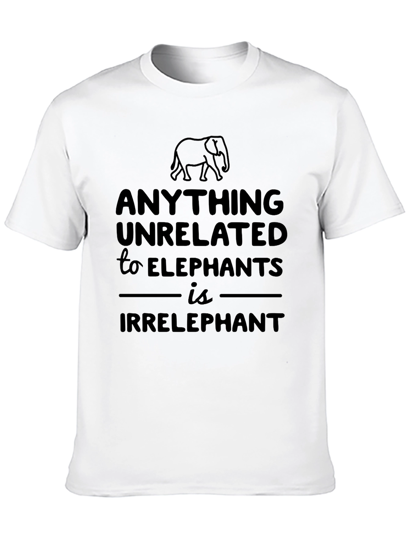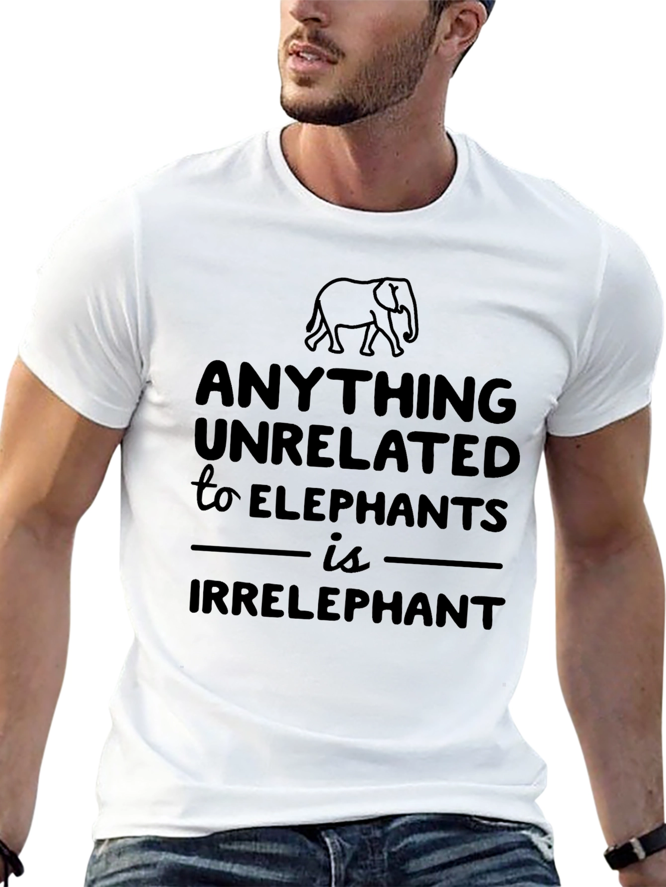 Declare your love for elephants with this stylish black t-shirt. Featuring a playful design with an elephant graphic and the humorous text "Anything Unrelated to ELEPHANTS is IRRELEPHANT", this shirt is sure to spark conversations. Made from a soft, comfortable fabric, it's perfect for casual wear, elephant enthusiasts, or anyone with a fun sense of humor. Great for everyday style or animal-themed events. Show off your irrelephant style!