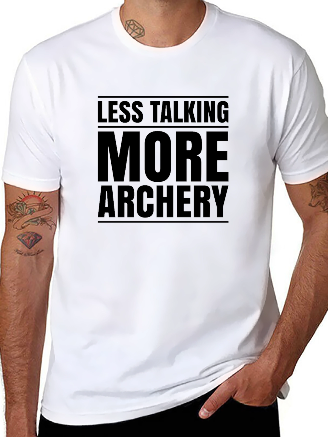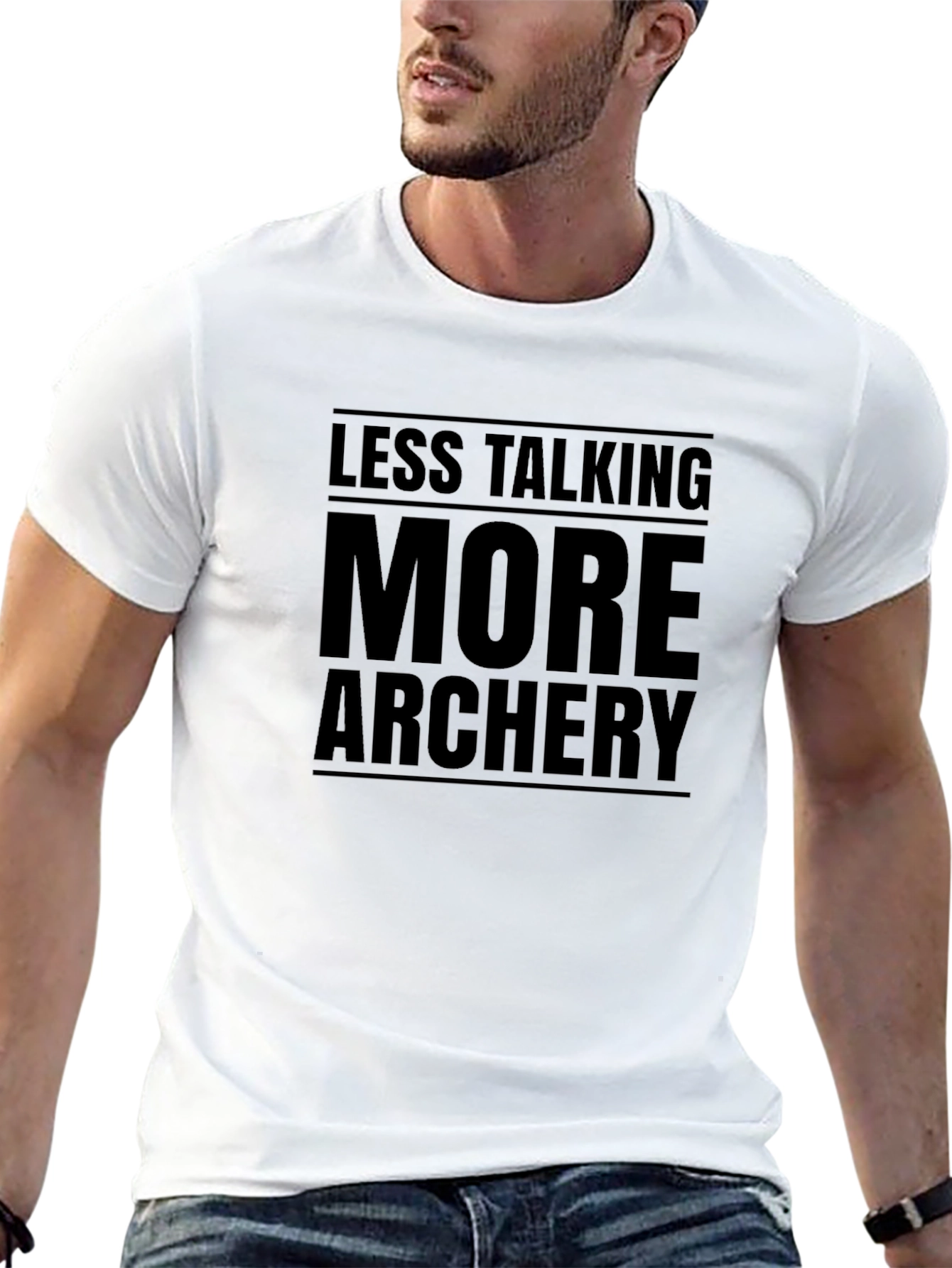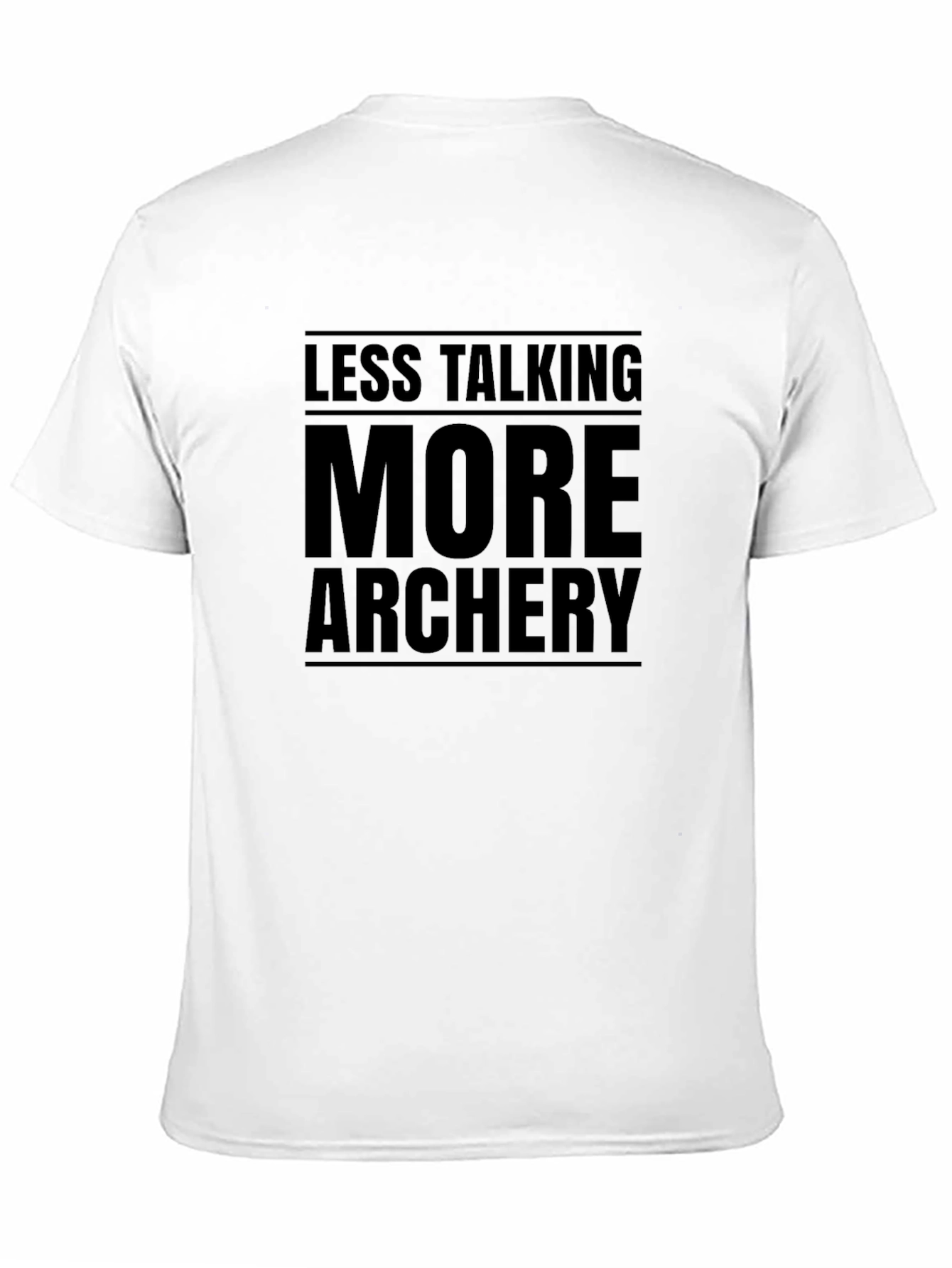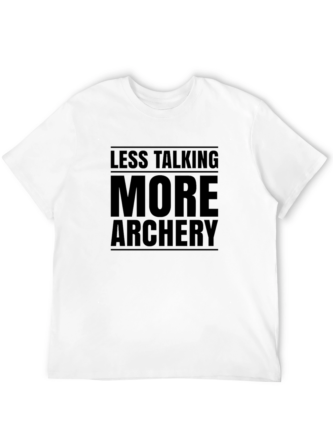 Show off your passion for archery with this stylish black t-shirt. The bold design features the phrase "Less Talking, More Archery," making it clear where your priorities lie. The shirt appears to be made from a comfortable material, perfect for wearing at the range, competitions, or casually around town. Its classic fit makes it a great choice for any archery enthusiast looking to express their love for the sport. This tee is sure to be a conversation starter and a fun way to connect with fellow archers. Get yours today and let your shirt do the talking!