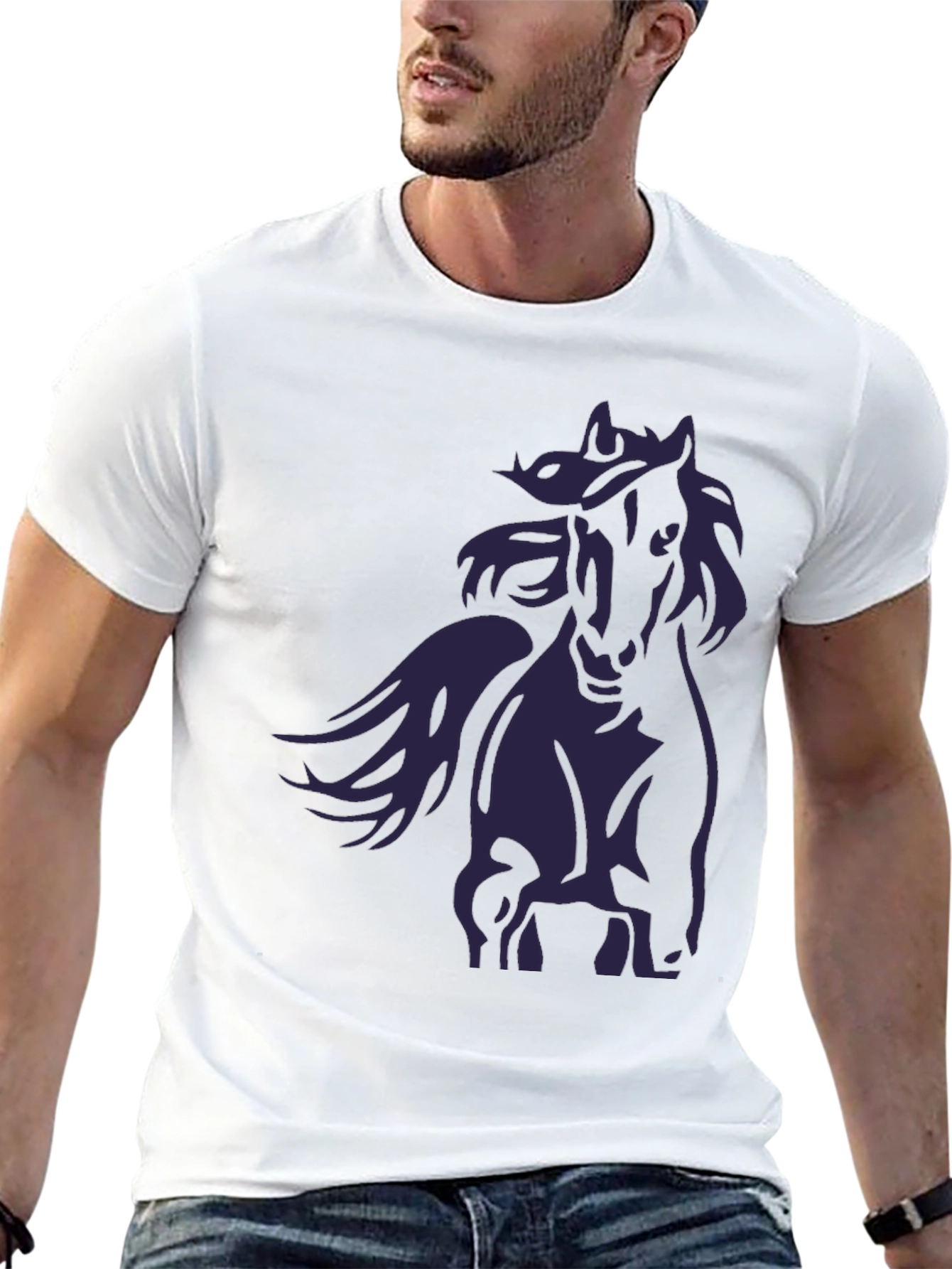 Elevate your casual style with this striking black t-shirt featuring a bold horse graphic. The design showcases a stylized horse silhouette in a contrasting dark color, creating a visually appealing and modern aesthetic. Made from a comfortable-looking fabric, this tee is perfect for everyday wear. Its classic fit makes it versatile for various occasions. Pair it with jeans or chinos for a relaxed yet fashionable look. Show off your unique style with this statement tee.