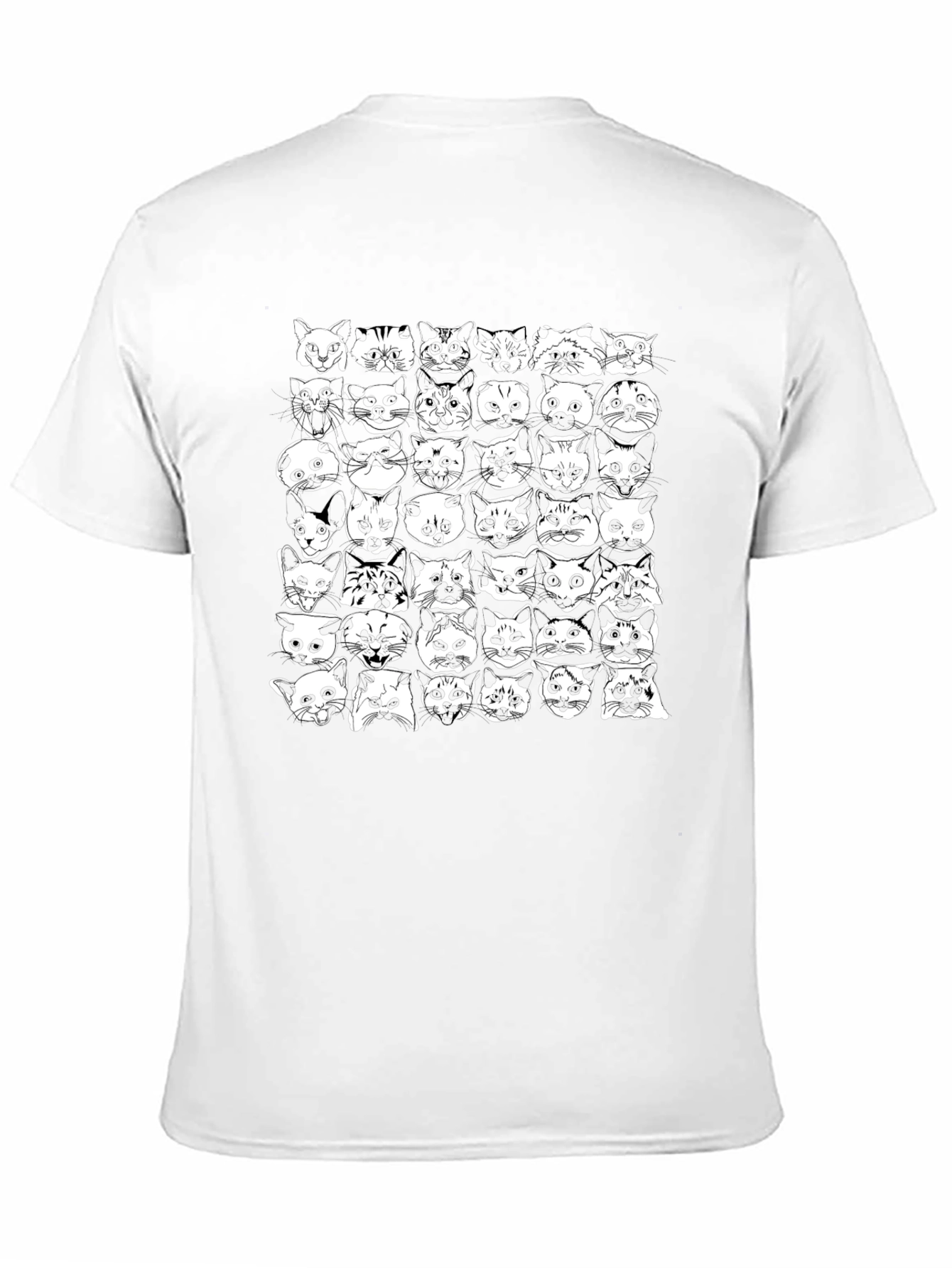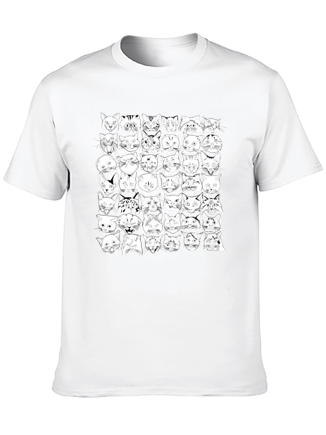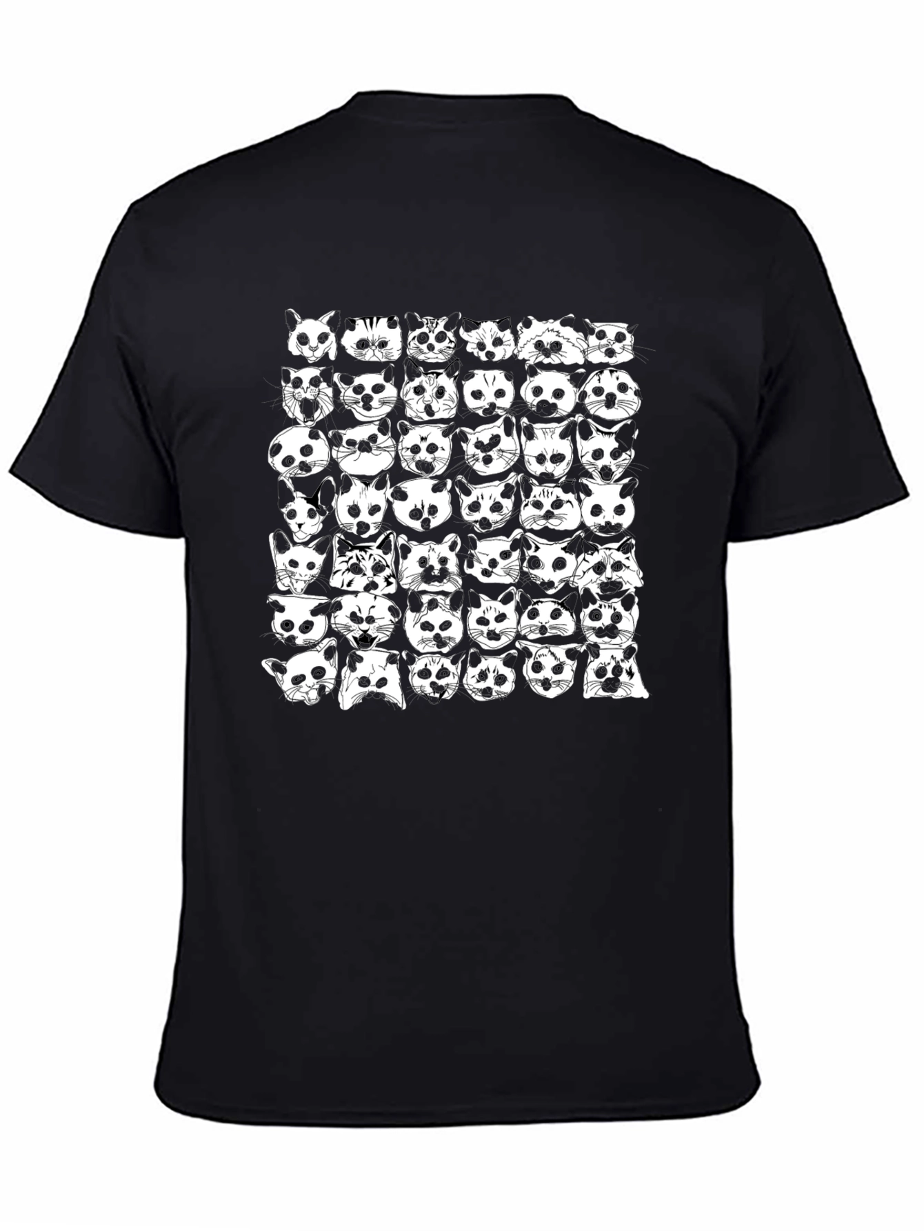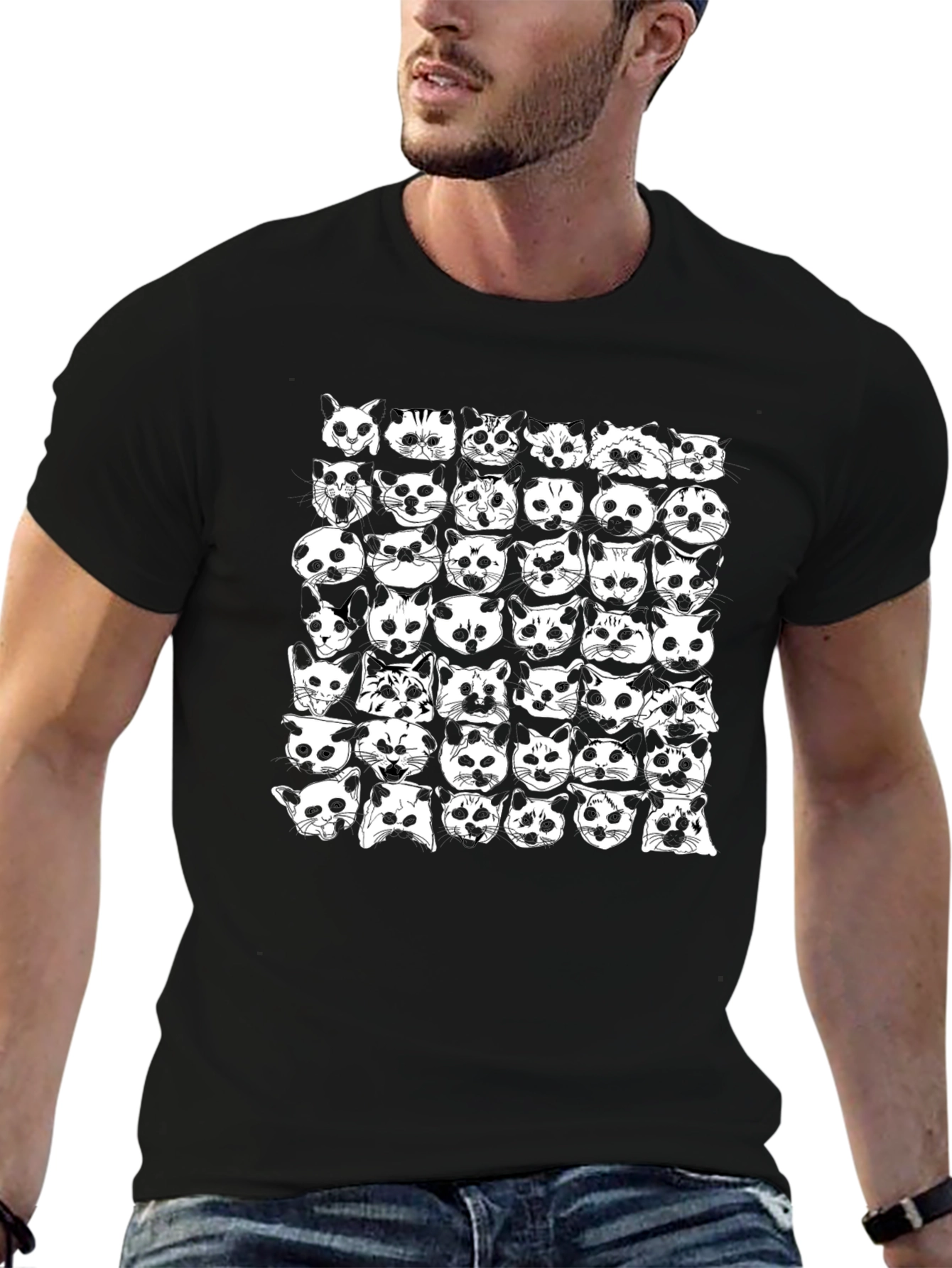 Show your love for cats with this eye-catching black t-shirt. The shirt features a unique, repeating pattern of white cat faces. The design is printed on a soft, comfortable black fabric. The tee has a classic fit that's perfect for everyday wear. Whether you're a cat lover or just appreciate cool designs, this t-shirt is a great way to add some personality to your wardrobe. Dress it up with jeans or keep it casual with shorts - perfect for cat cafes or lounging at home!