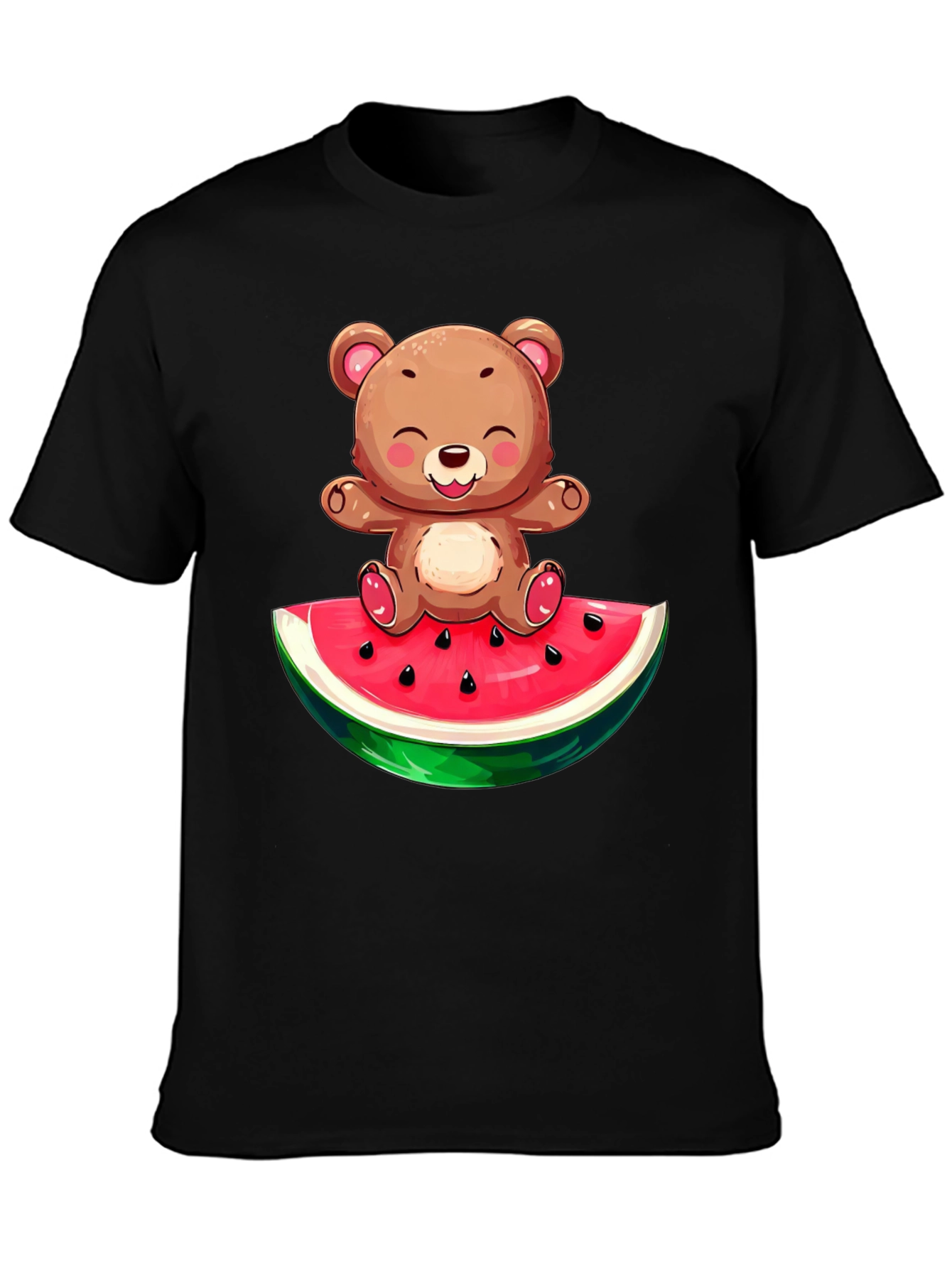 Show off your playful side with this adorable graphic t-shirt! Featuring a charming cartoon bear perched atop a slice of juicy watermelon, this tee is sure to turn heads. The shirt is made from a comfortable, likely cotton blend material in classic black, providing the perfect backdrop for the vibrant and colorful design. Ideal for casual wear, summer outings, or anyone who loves cute and quirky fashion. This t-shirt is a fun way to express your personality and add a touch of sweetness to your everyday look. Get yours today and spread the smiles!