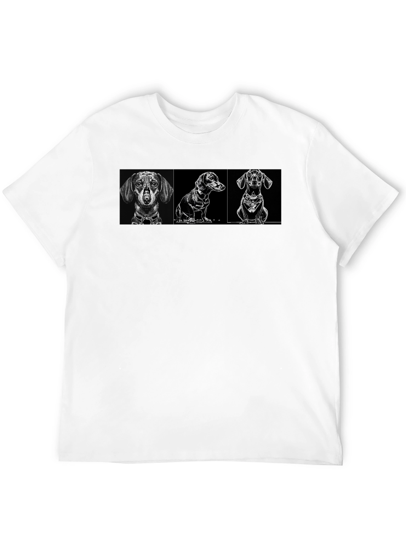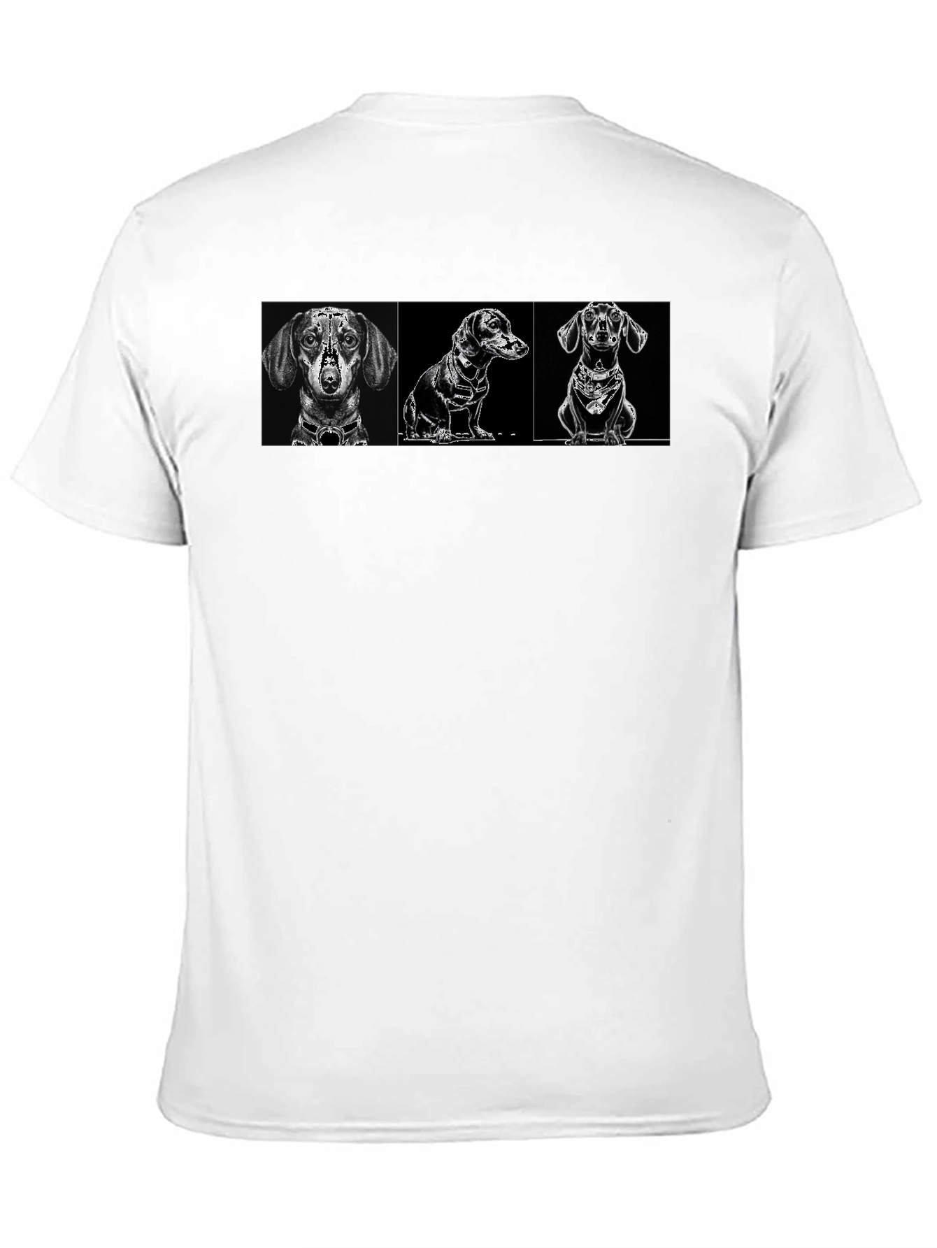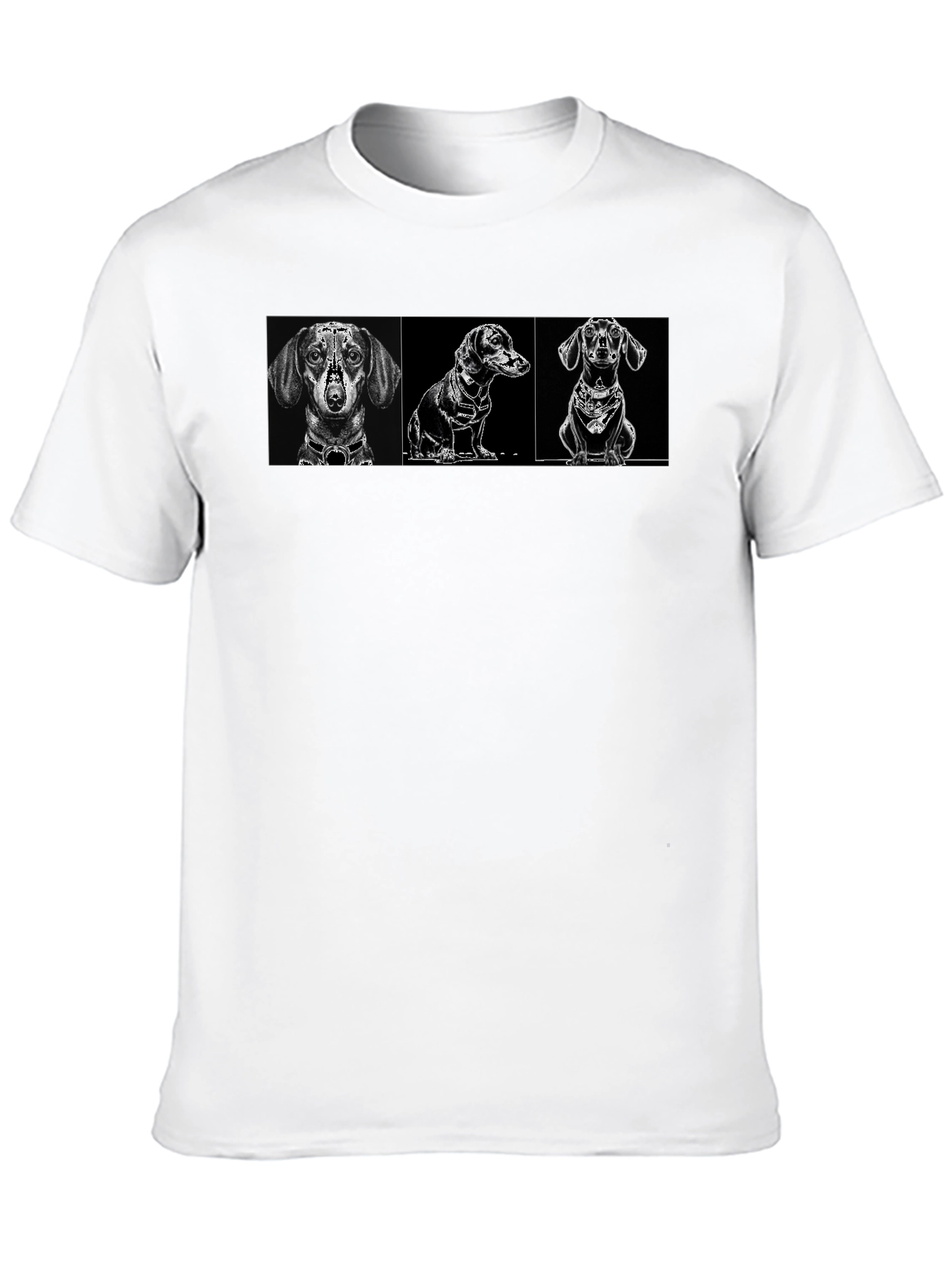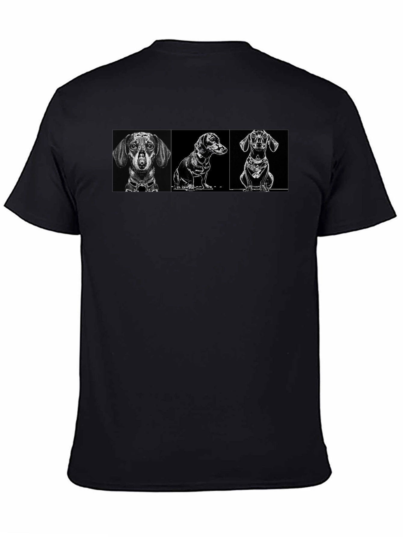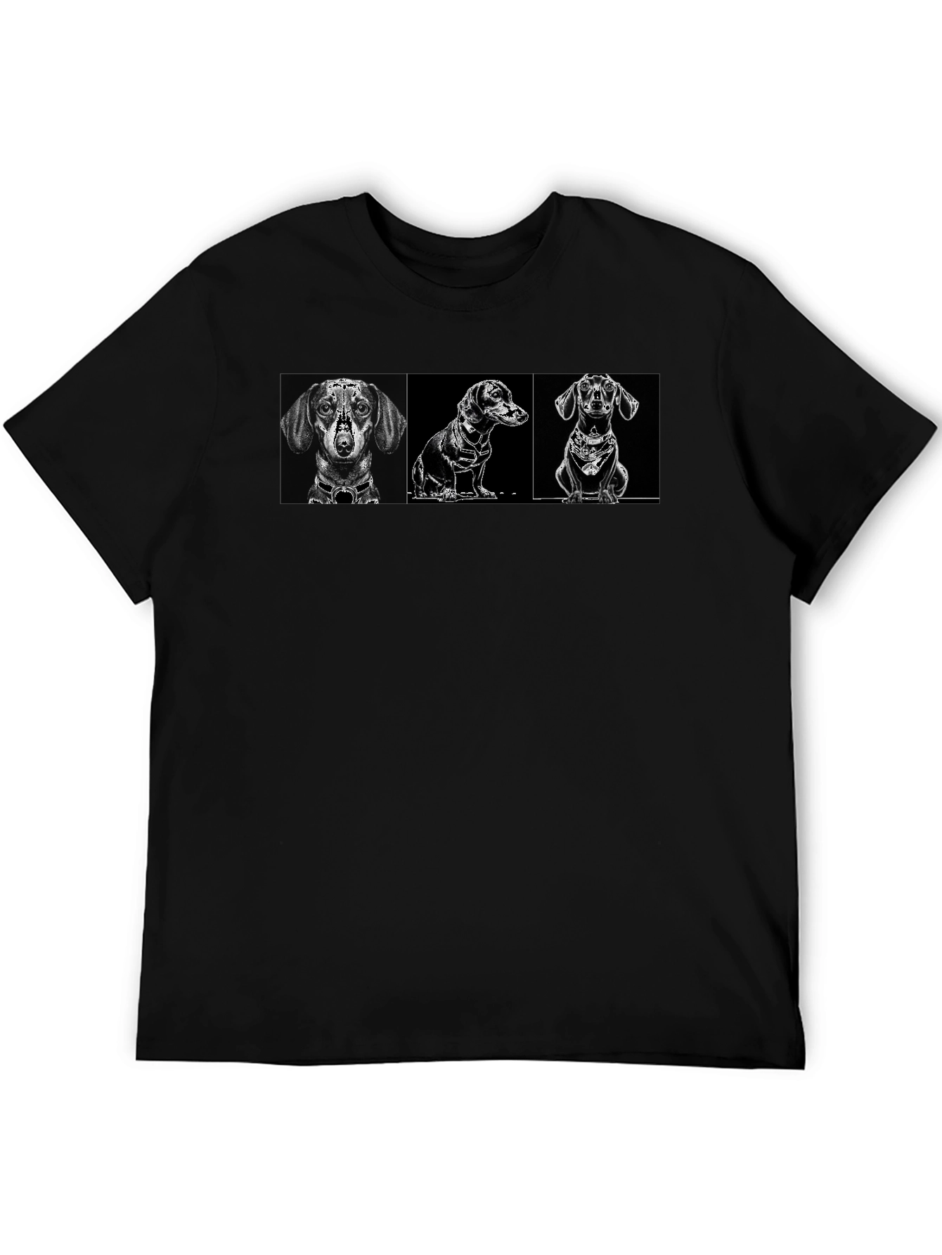Show your love for dachshunds with this stylish black t-shirt! Featuring a unique graphic print of three different dachshund poses, this tee is perfect for dog lovers. The design is eye-catching and the black color makes it versatile for any casual outfit. Made from a soft, comfortable fabric, this t-shirt is great for everyday wear. Whether you're running errands or relaxing at home, this dachshund print tee is sure to become a favorite in your wardrobe. Grab one for yourself or as a thoughtful gift for the dachshund enthusiast in your life!