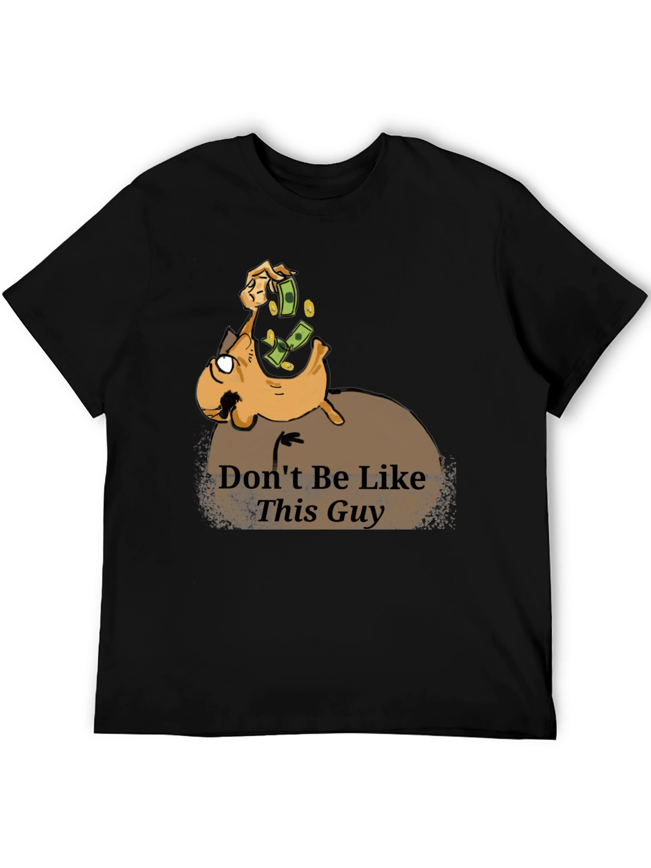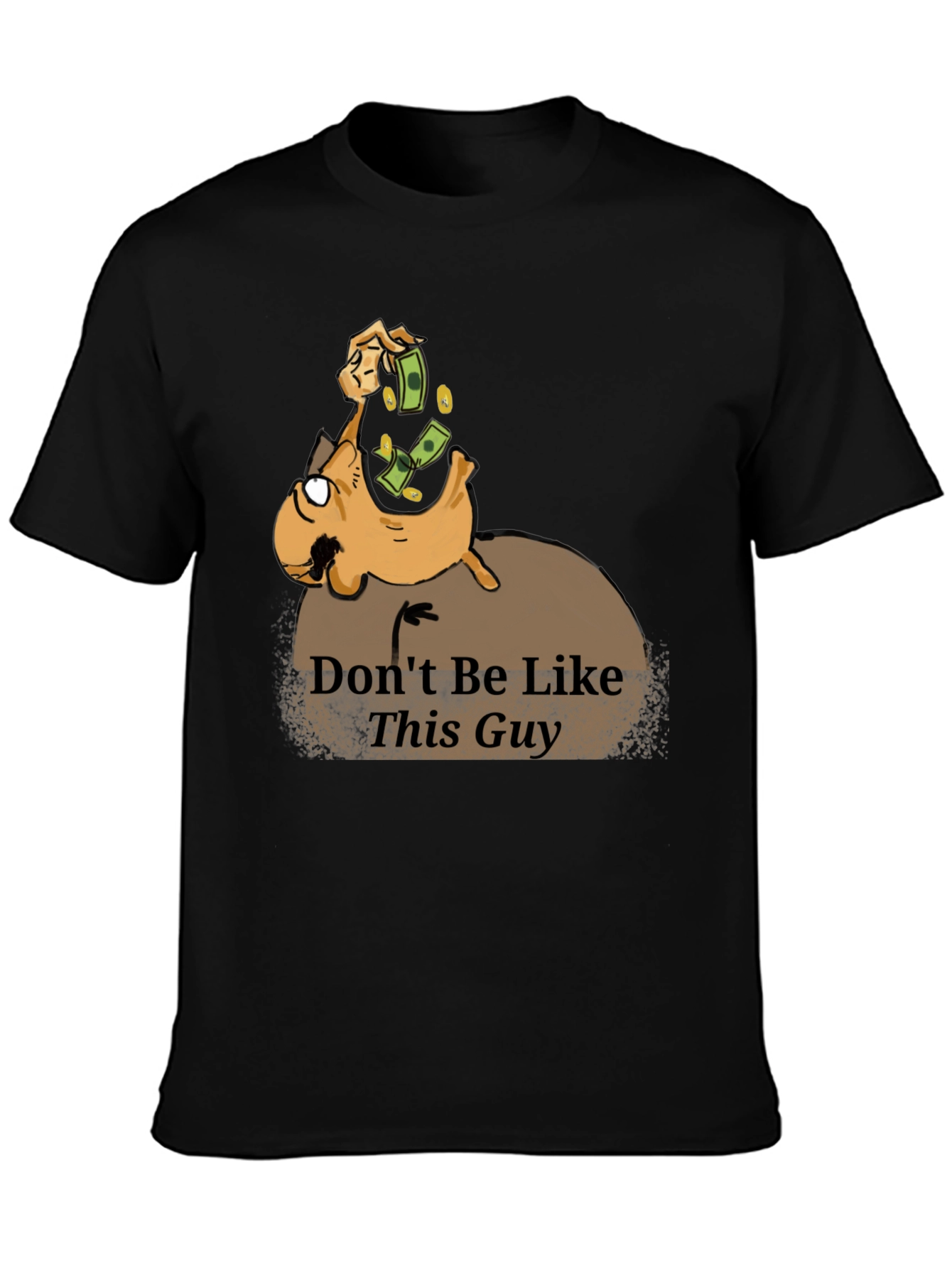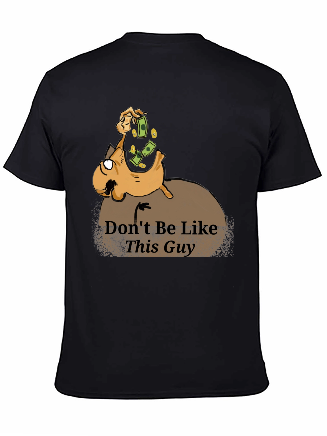 This black graphic t-shirt features a unique and humorous design with the phrase 'Don't Be Like This Guy'. The cartoon image shows a character weighed down with money, cautioning against greed. Made from a comfortable-looking fabric, this tee is perfect for casual wear. The shirt has a classic crew neck and short sleeves, offering a relaxed fit. It's ideal for anyone with a sense of humor who wants to make a statement. Wear it while hanging out with friends, running errands, or just lounging at home. Get yours today!
