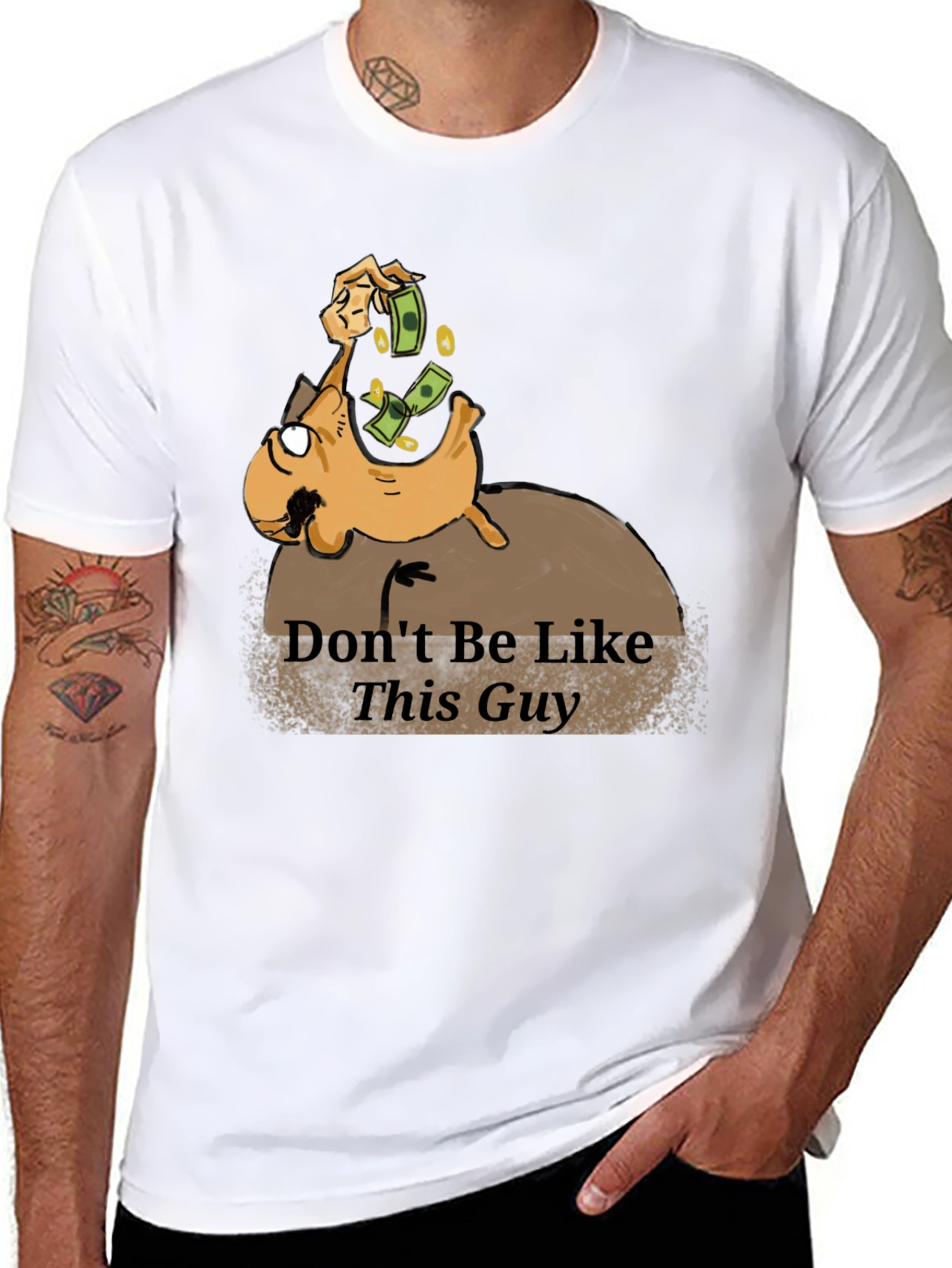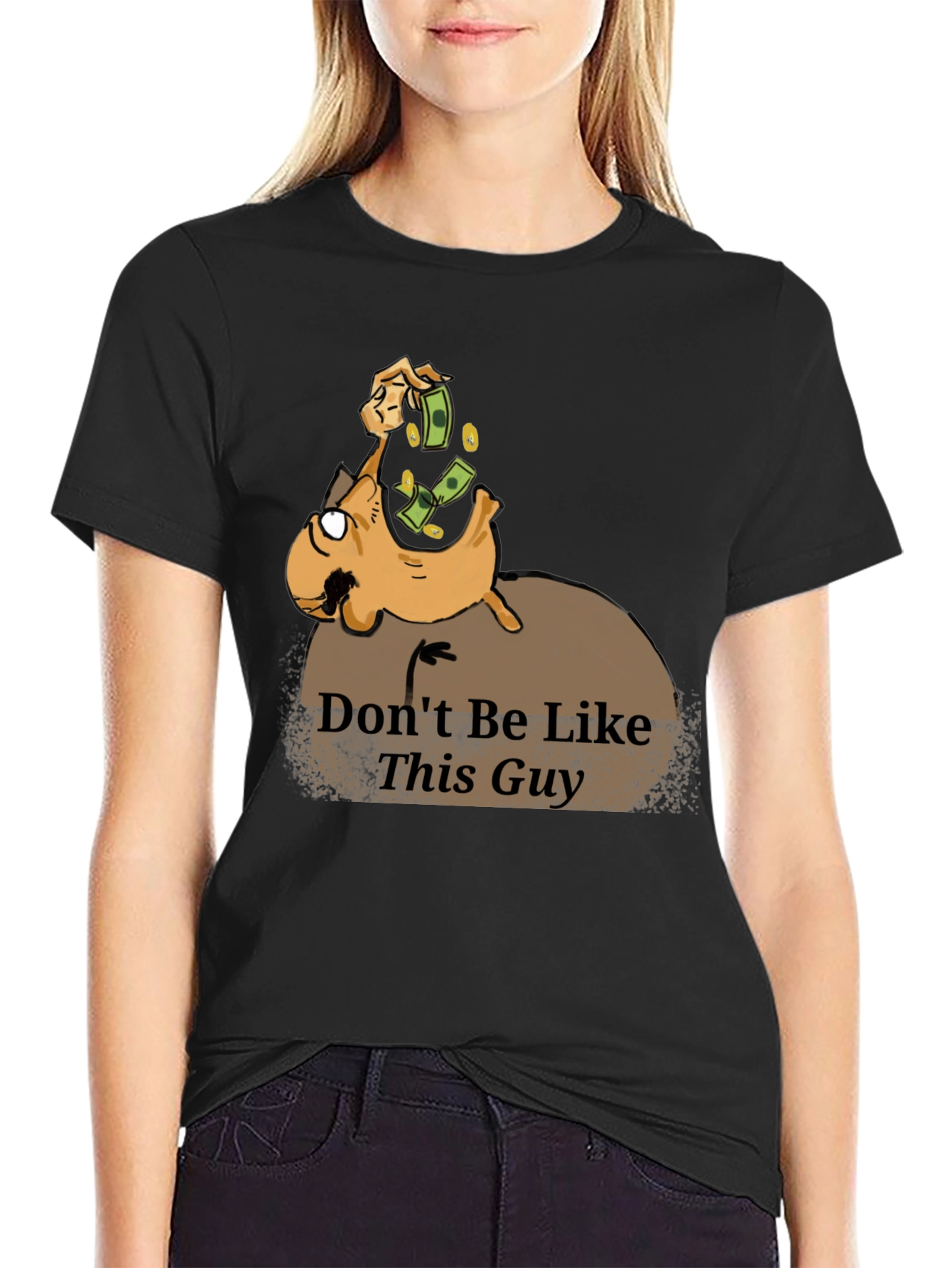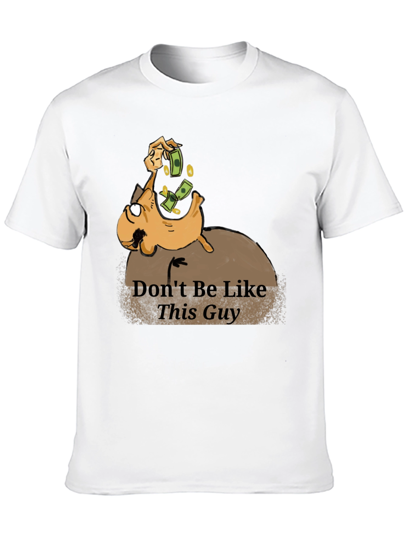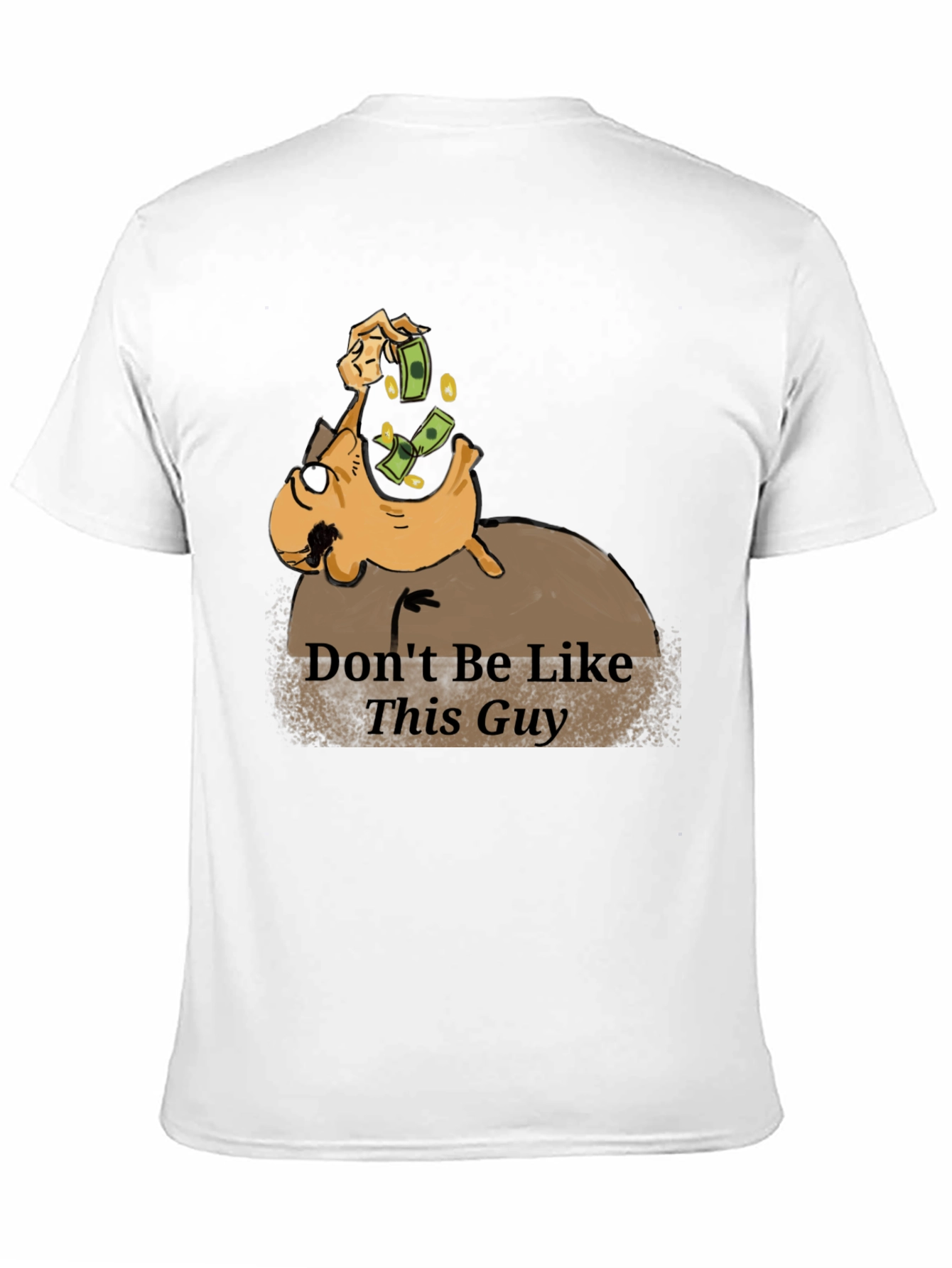 This black graphic t-shirt features a unique and humorous design with the phrase 'Don't Be Like This Guy'. The cartoon image shows a character weighed down with money, cautioning against greed. Made from a comfortable-looking fabric, this tee is perfect for casual wear. The shirt has a classic crew neck and short sleeves, offering a relaxed fit. It's ideal for anyone with a sense of humor who wants to make a statement. Wear it while hanging out with friends, running errands, or just lounging at home. Get yours today!