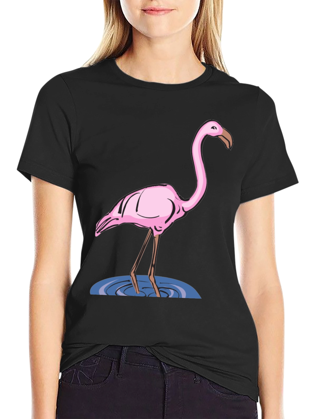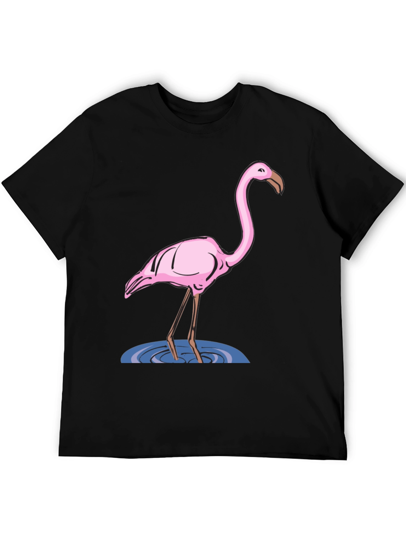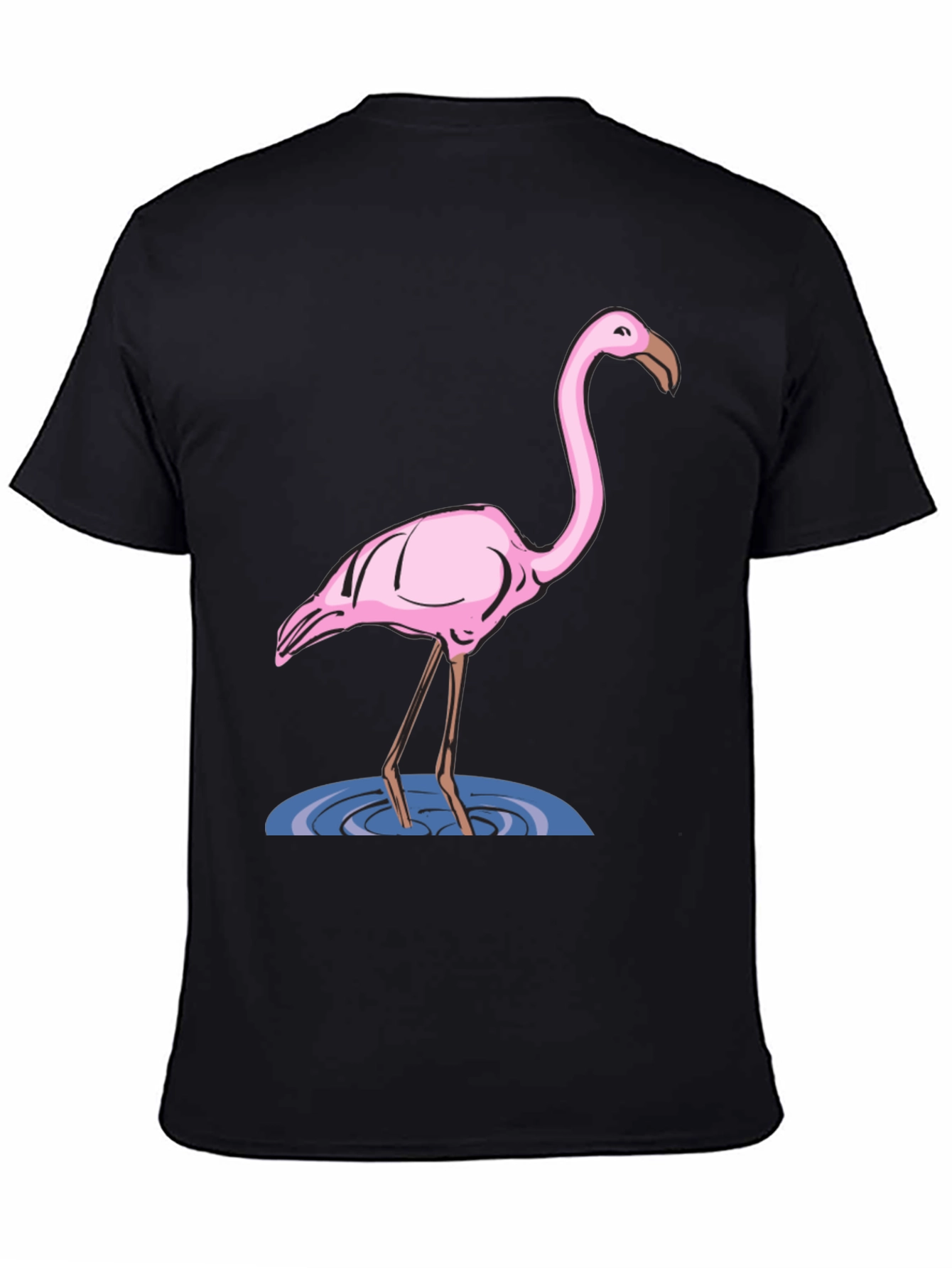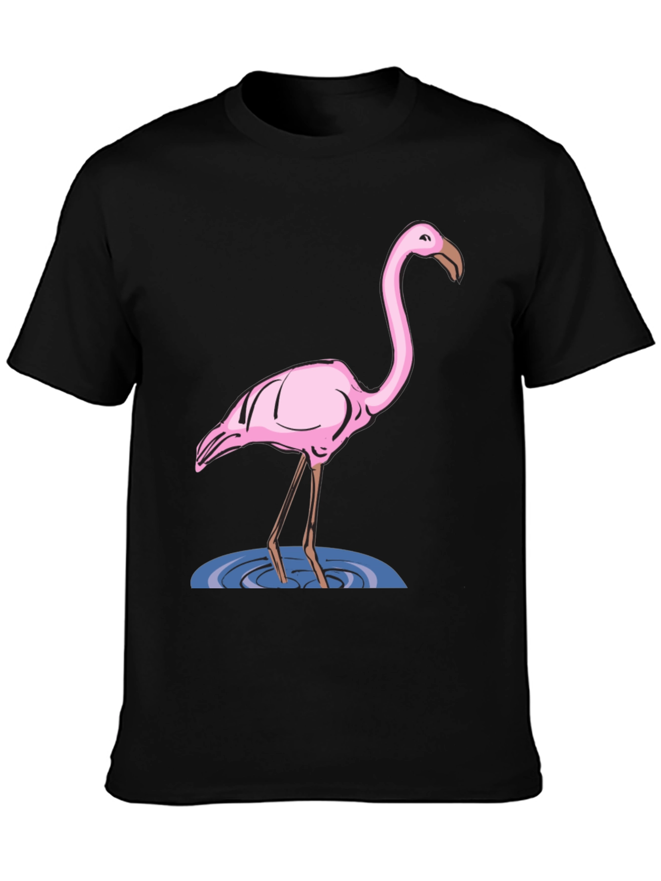 Flaunt your love for nature with this stylish black cotton t-shirt. This tee features a vibrant graphic of a pink flamingo wading in blue water, creating a fun and eye-catching design. The classic crew neck and short sleeves offer a comfortable and versatile fit. Made from soft, breathable cotton, this t-shirt is perfect for everyday wear. Whether you're heading to the beach, running errands, or simply relaxing at home, this flamingo tee will add a touch of tropical charm to your wardrobe. A great gift for bird lovers!