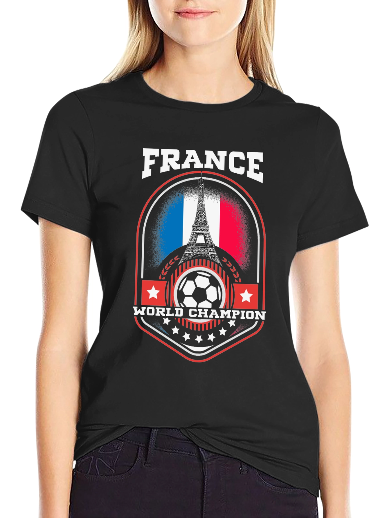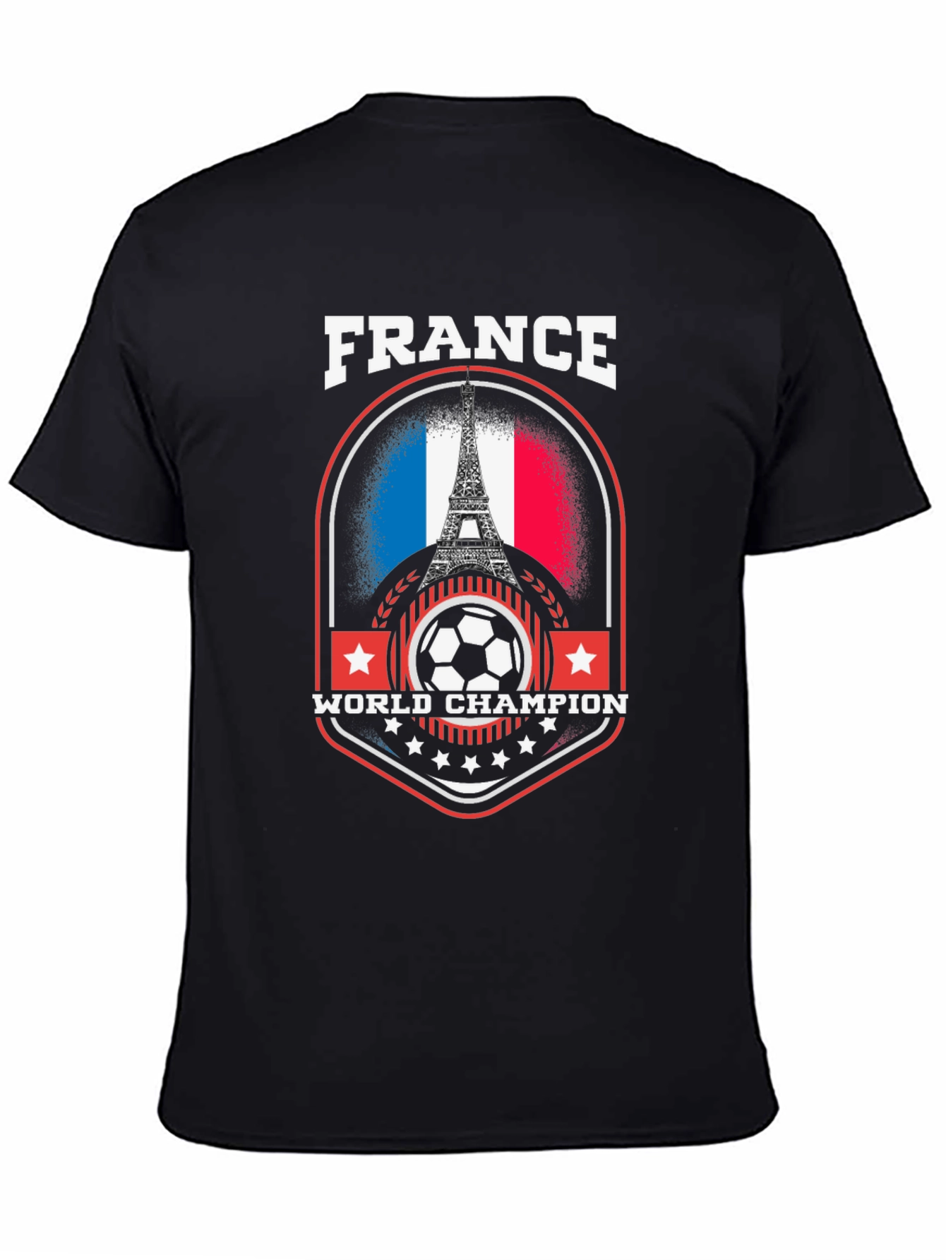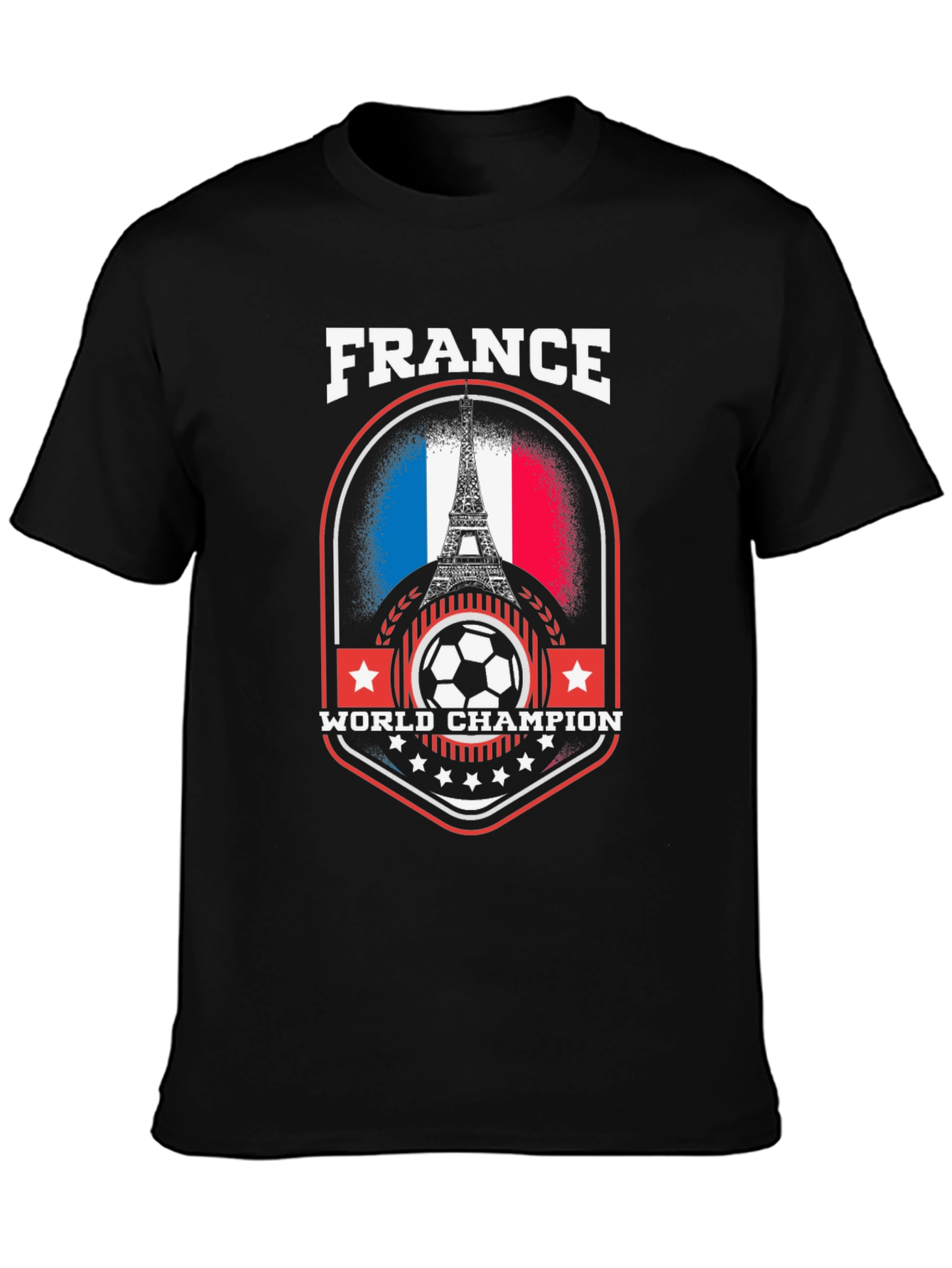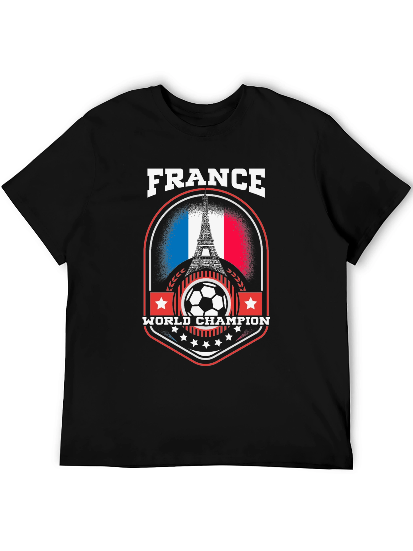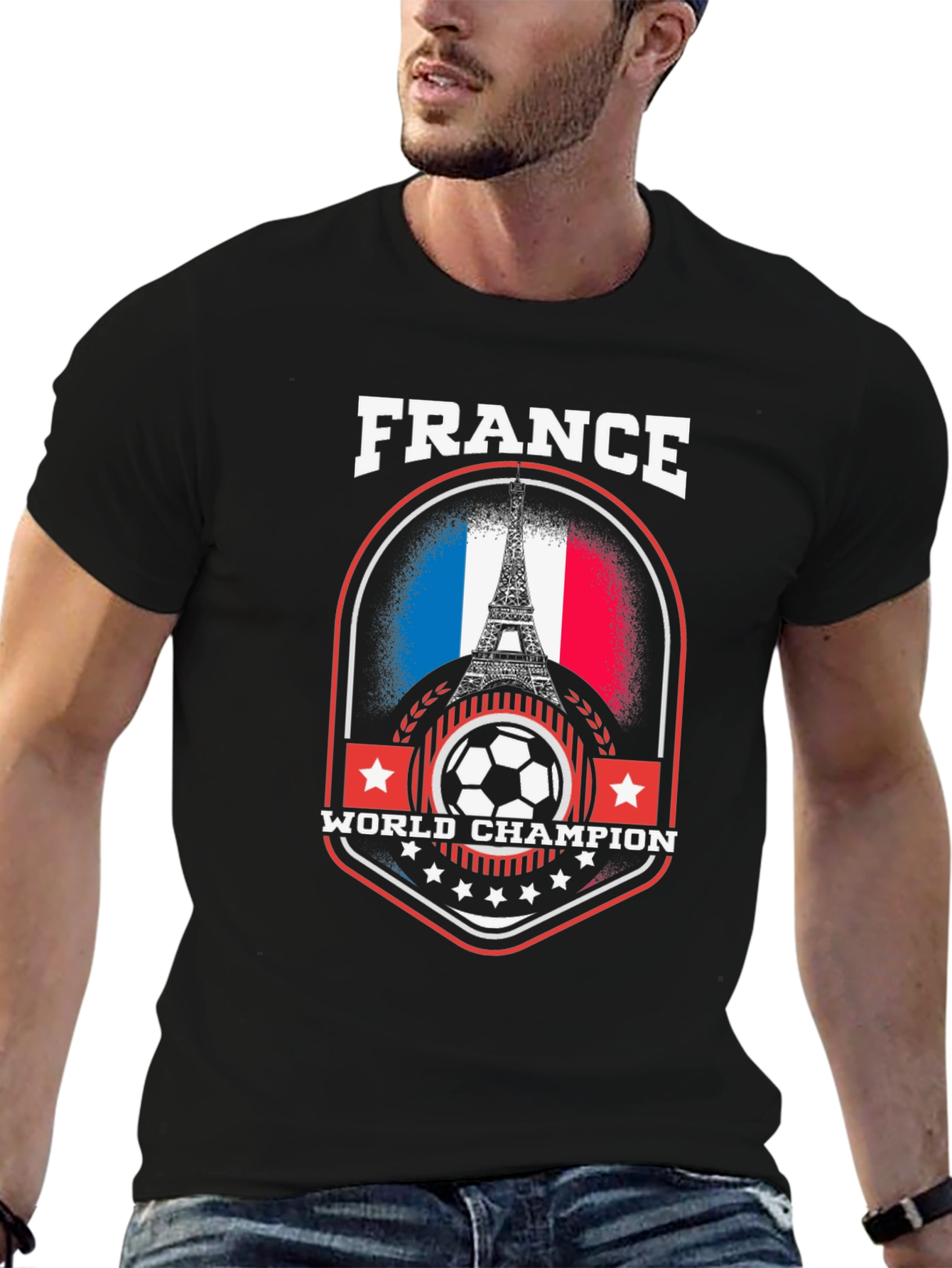 Show your support for France with this stylish black graphic tee. The shirt features a bold design with the word "FRANCE" at the top, above an emblem featuring the Eiffel Tower, the French flag colors, and a soccer ball. Beneath the ball, the words "WORLD CHAMPION" are displayed, and a row of stars complete the design. Made from comfortable fabric, this tee is perfect for casual wear, sporting events, or showing your national pride. A must-have for any France fan, it's sure to be a conversation starter and showcase your love for the team.