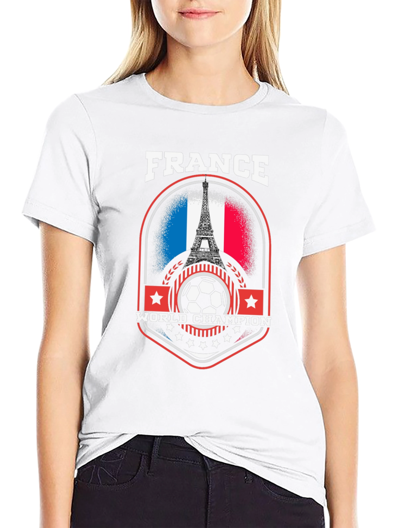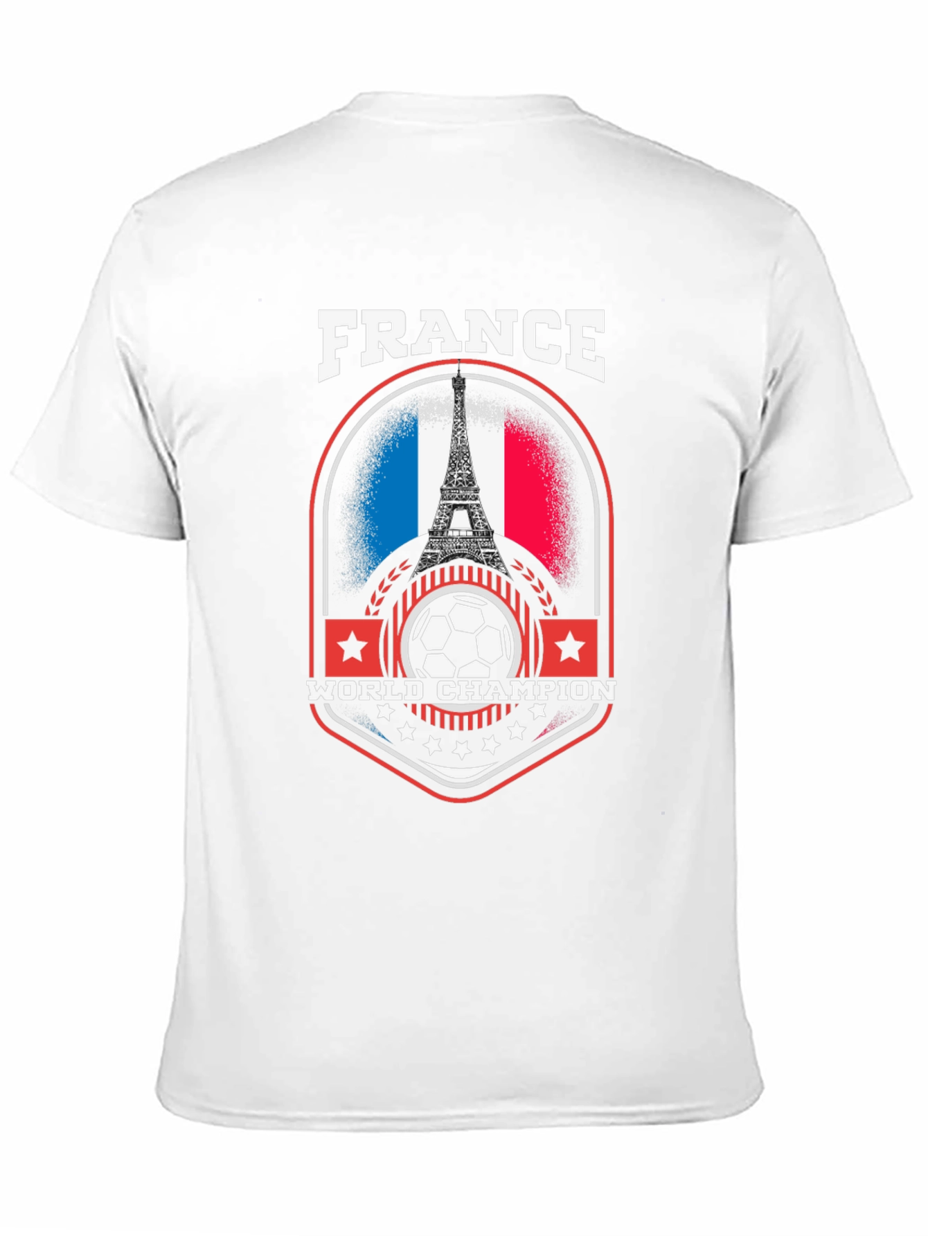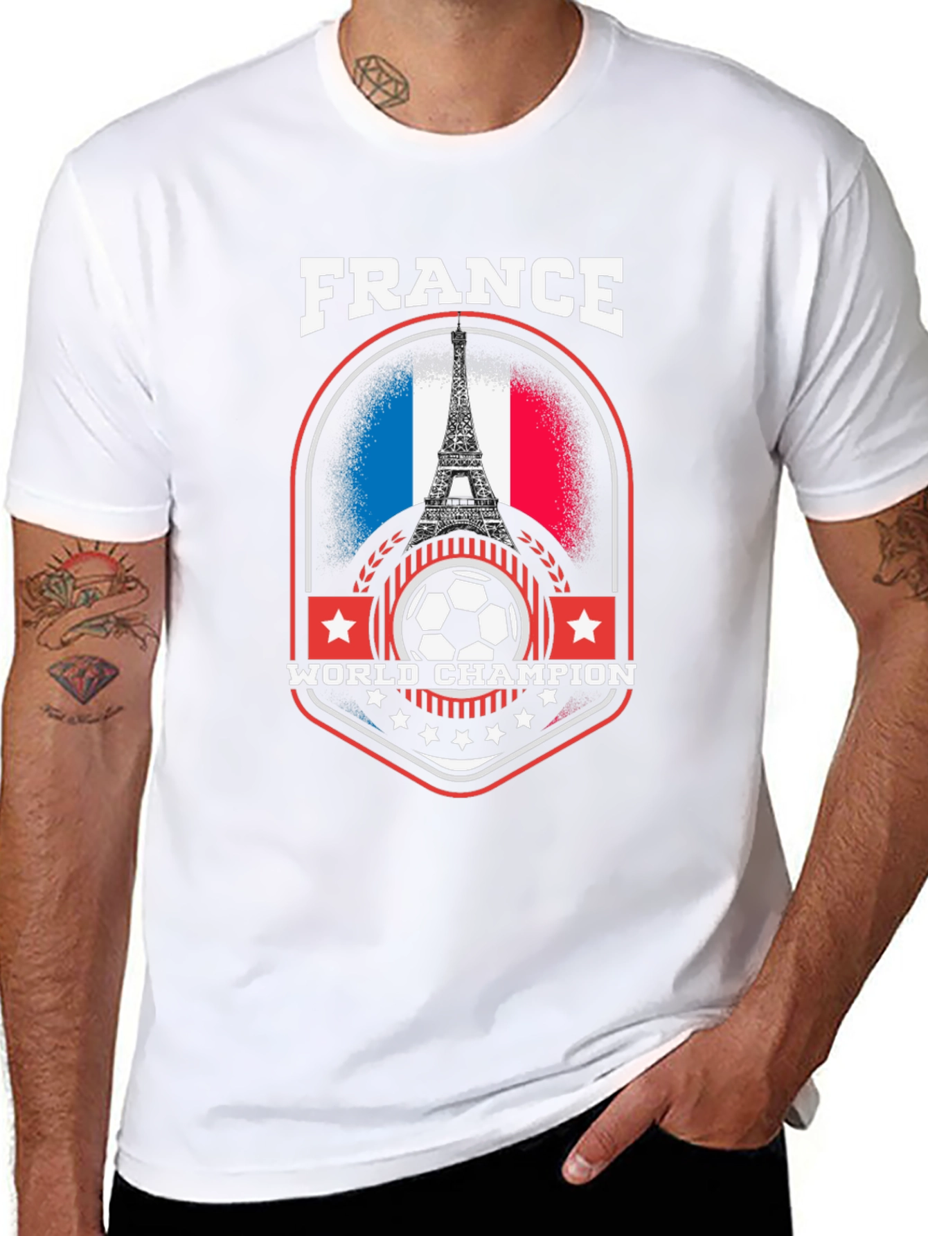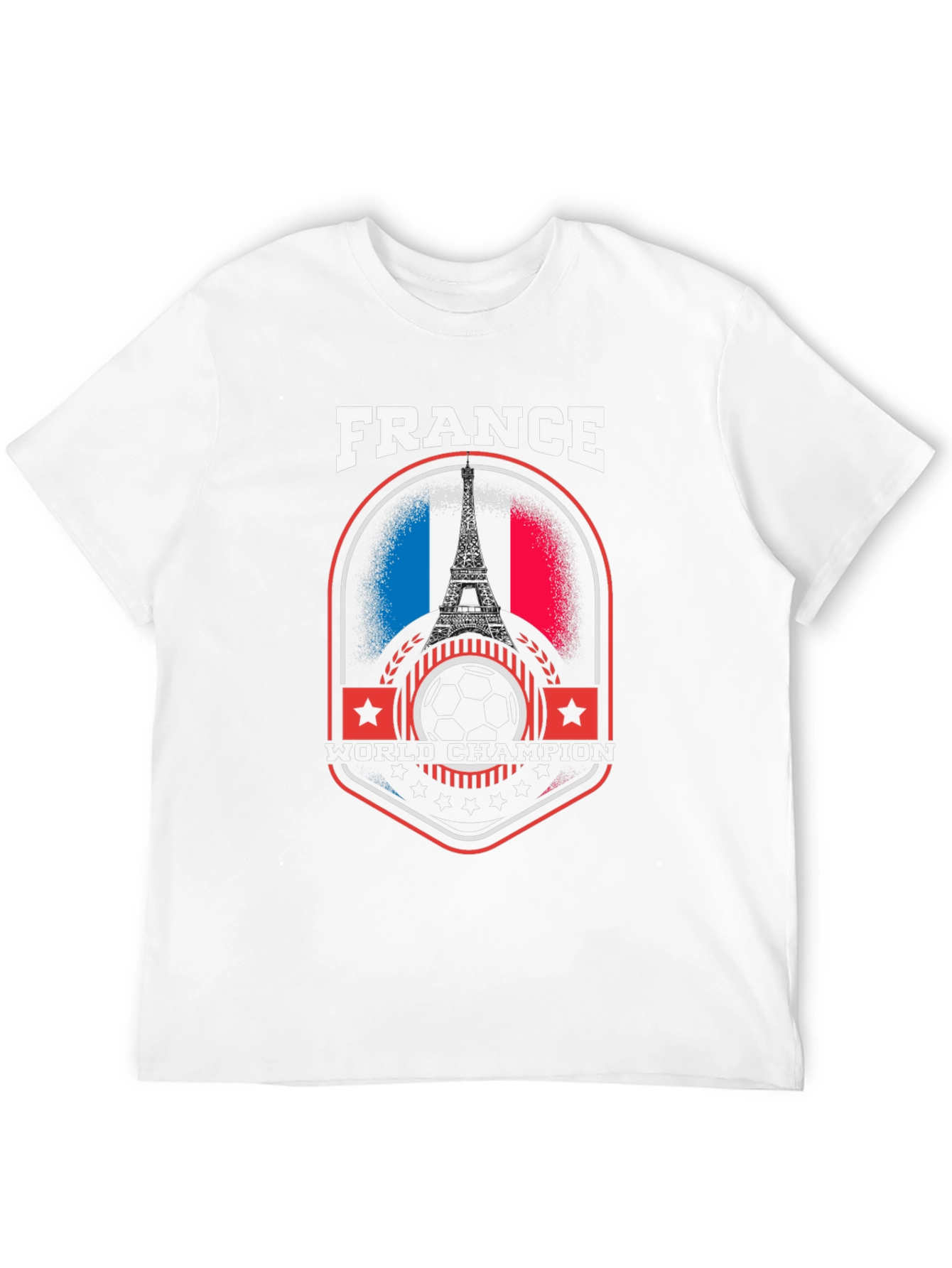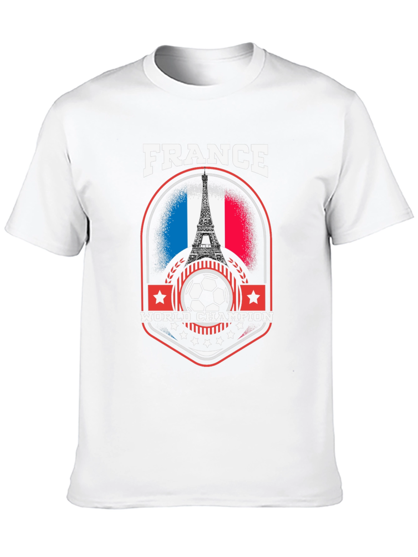 Show your support for France with this stylish black graphic tee. The shirt features a bold design with the word "FRANCE" at the top, above an emblem featuring the Eiffel Tower, the French flag colors, and a soccer ball. Beneath the ball, the words "WORLD CHAMPION" are displayed, and a row of stars complete the design. Made from comfortable fabric, this tee is perfect for casual wear, sporting events, or showing your national pride. A must-have for any France fan, it's sure to be a conversation starter and showcase your love for the team.