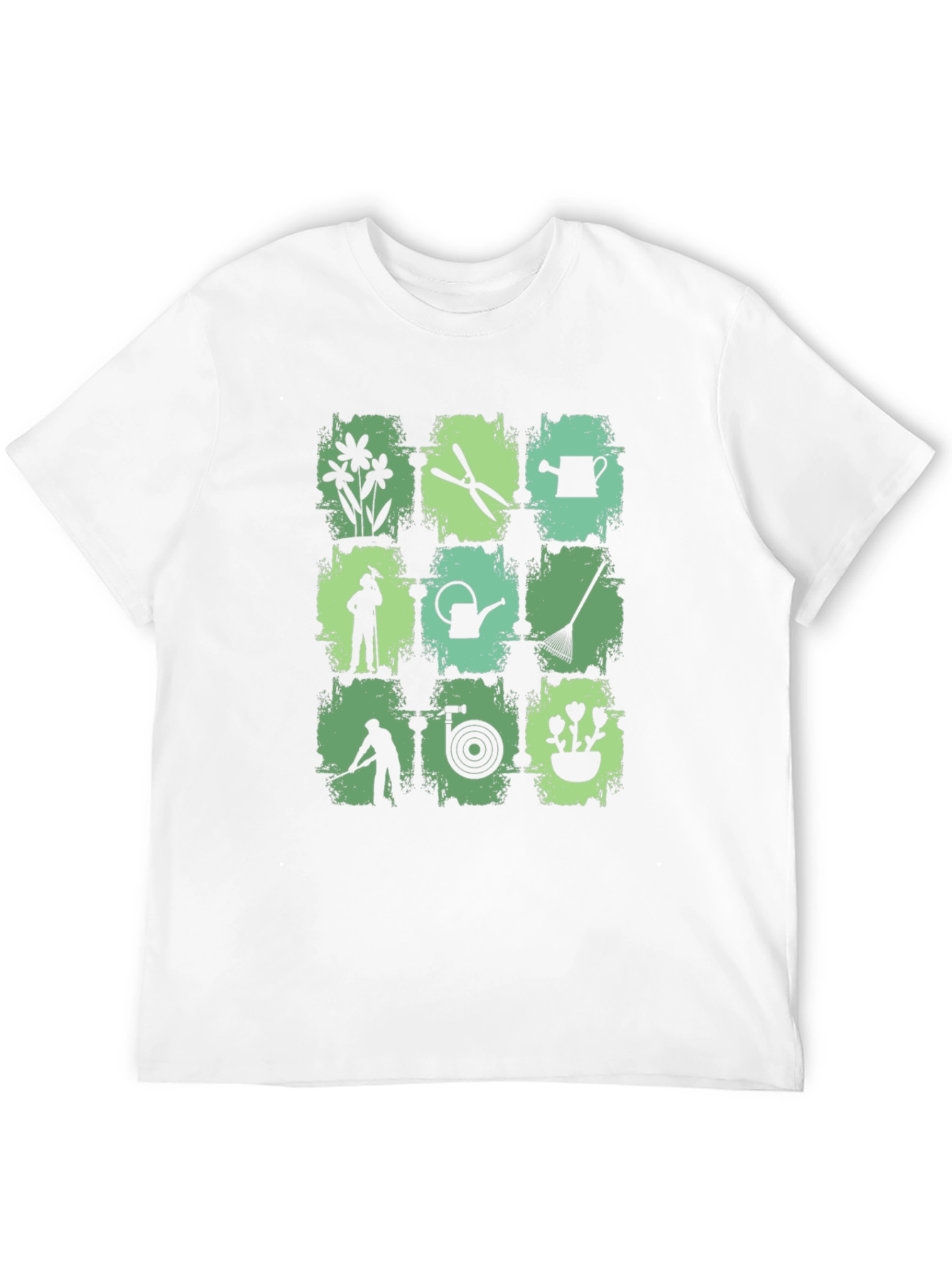 Show off your love for gardening with this stylish and unique black t-shirt. This comfortable crew neck tee features a cool graphic print with various gardening tools and silhouettes, including flowers, watering cans, shears, and gardeners in action. The design is arranged in a stylish grid pattern with distressed green squares, creating a vintage-inspired look. Made from soft, breathable fabric, this t-shirt is perfect for casual wear, gardening enthusiasts, or anyone who appreciates a touch of nature in their wardrobe. It’s an ideal gift for birthdays, holidays, or just because. Get yours today!