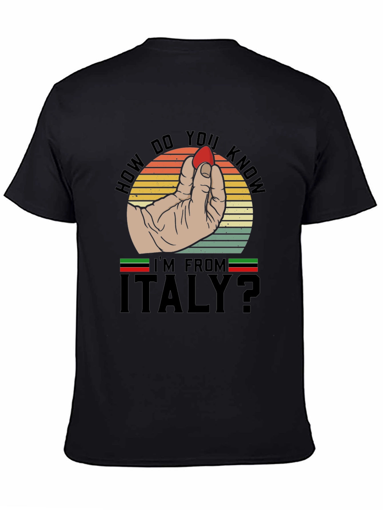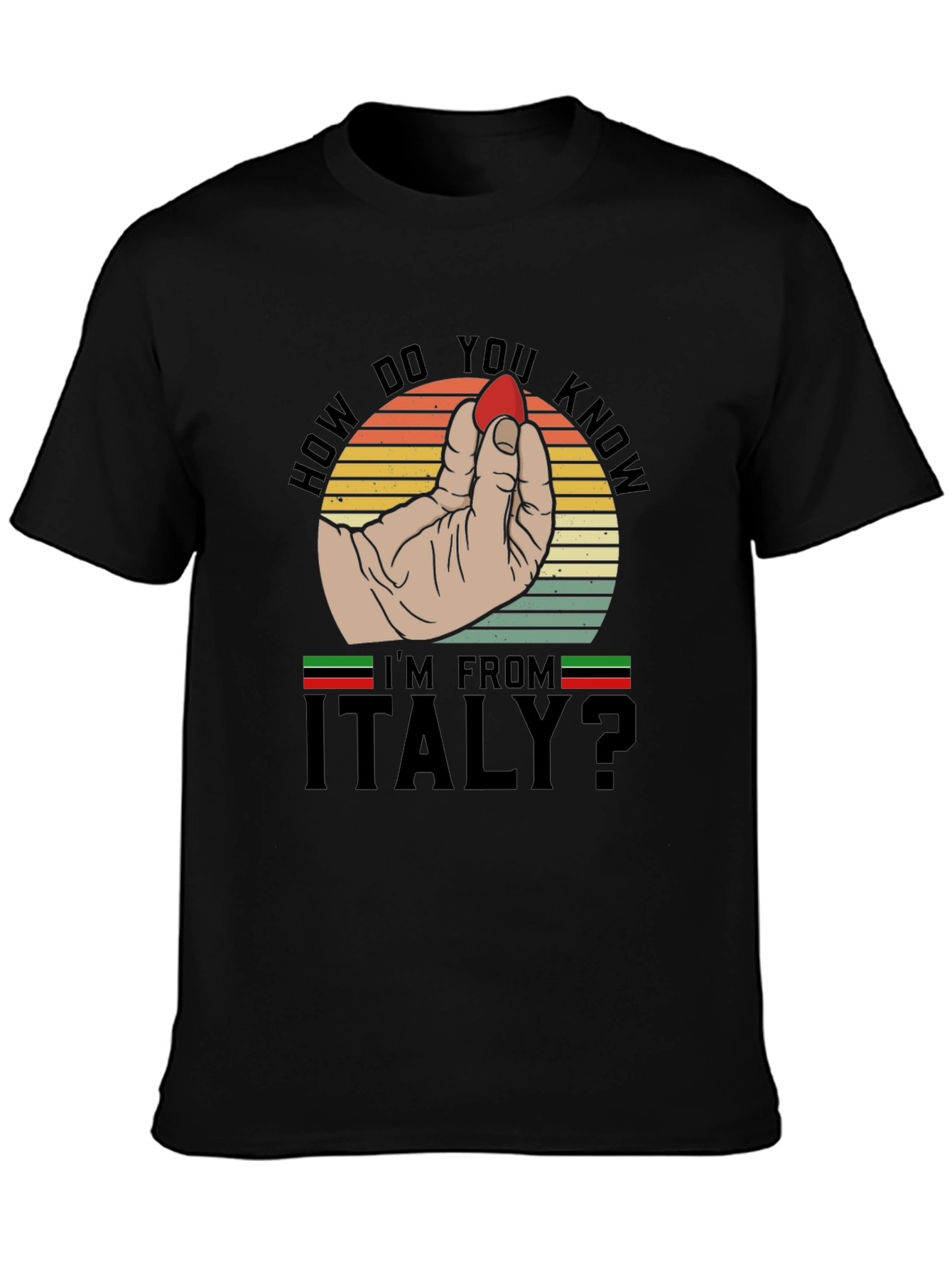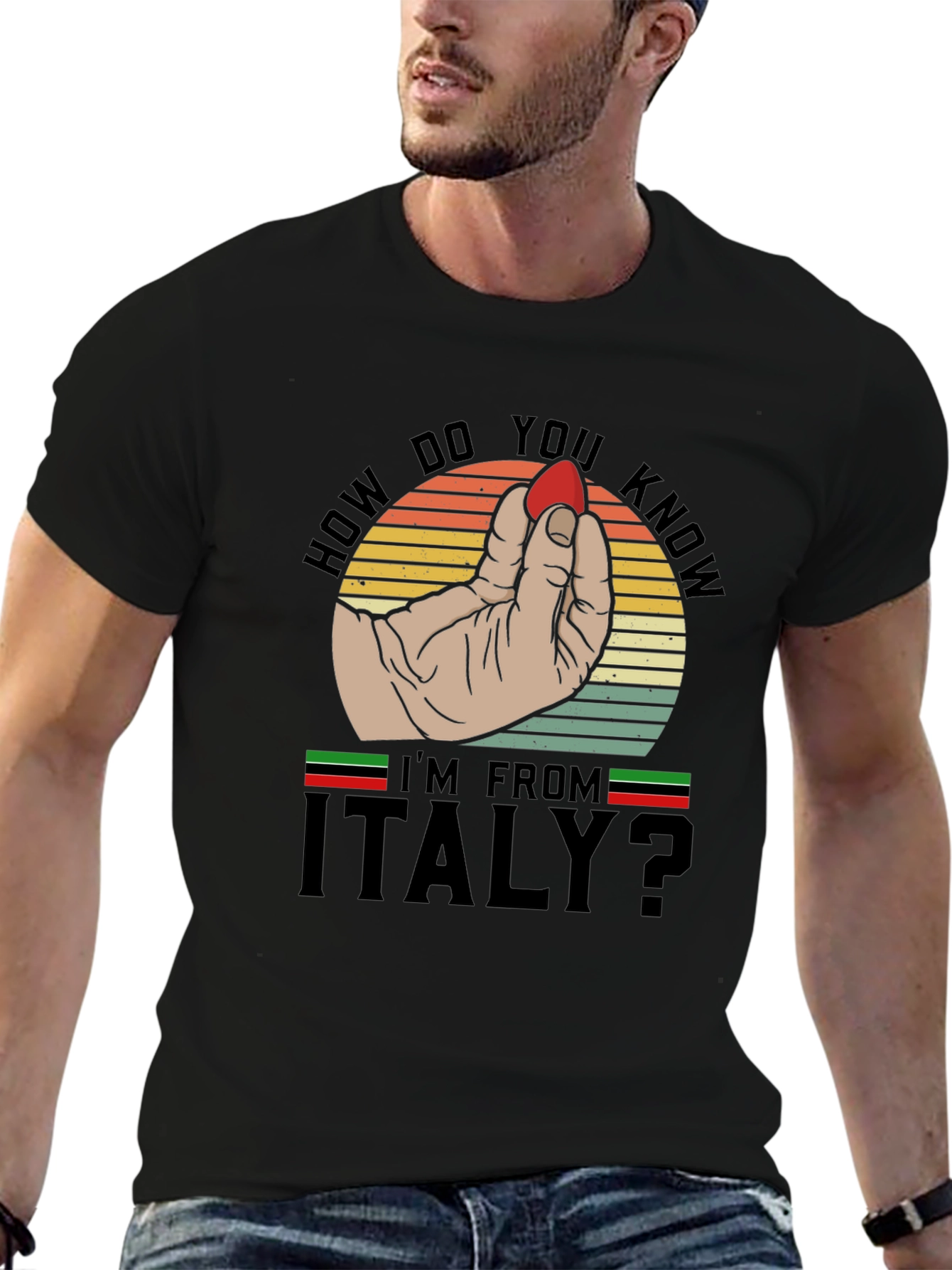 Show off your Italian pride with this unique and humorous t-shirt. The design features a classic Italian hand gesture holding a red object, set against a retro sunset background. The text "HOW DO YOU KNOW I'M FROM ITALY?" playfully asks the question. The colors of the Italian flag accent the design. Made from comfortable black fabric, this tee is perfect for casual wear, family gatherings, or to spark conversation wherever you go. Available in various sizes, it makes a great gift for the Italian in your life or anyone who loves Italian culture. This shirt is sure to bring smiles and connect you with fellow enthusiasts of Italy.