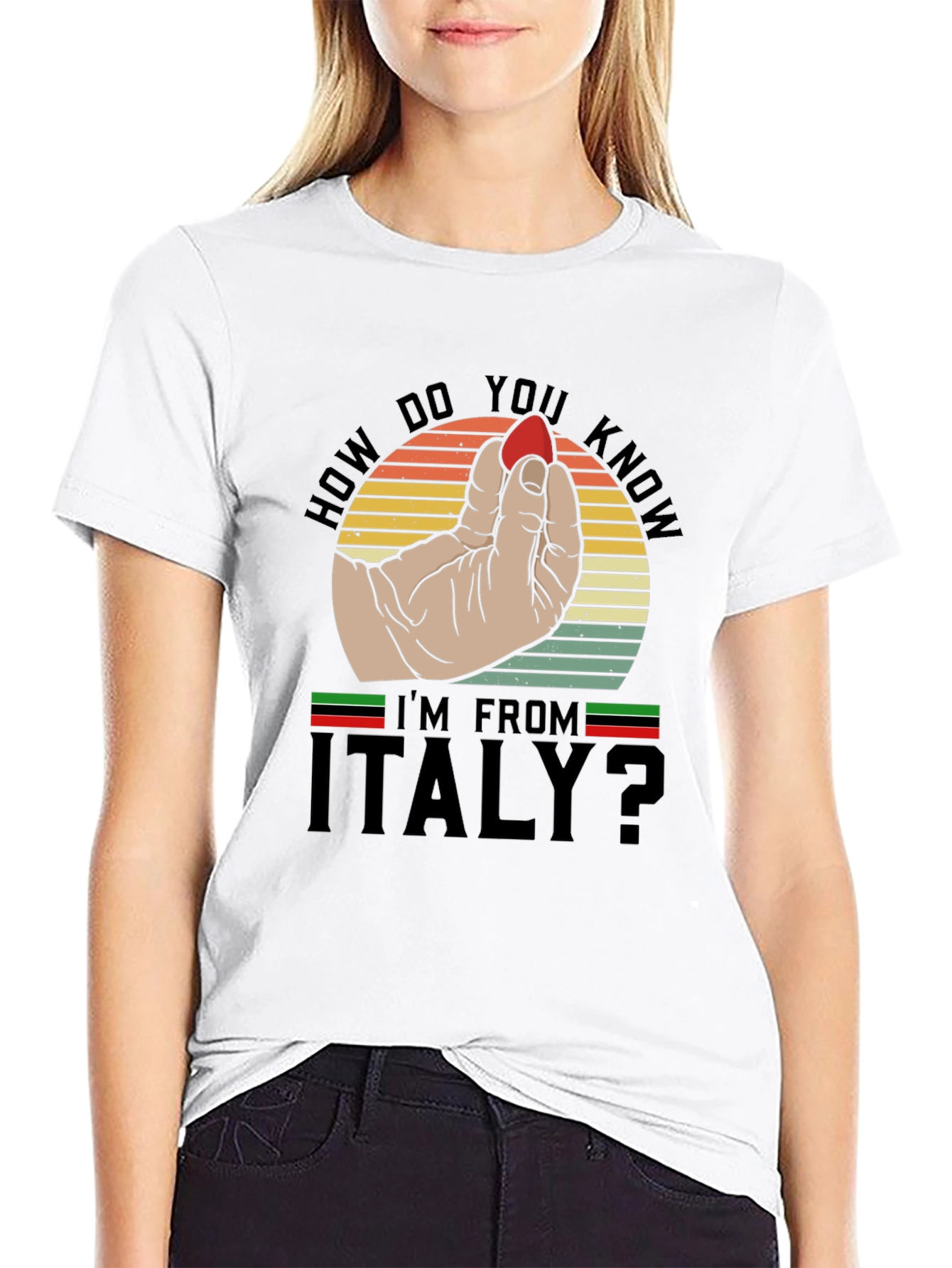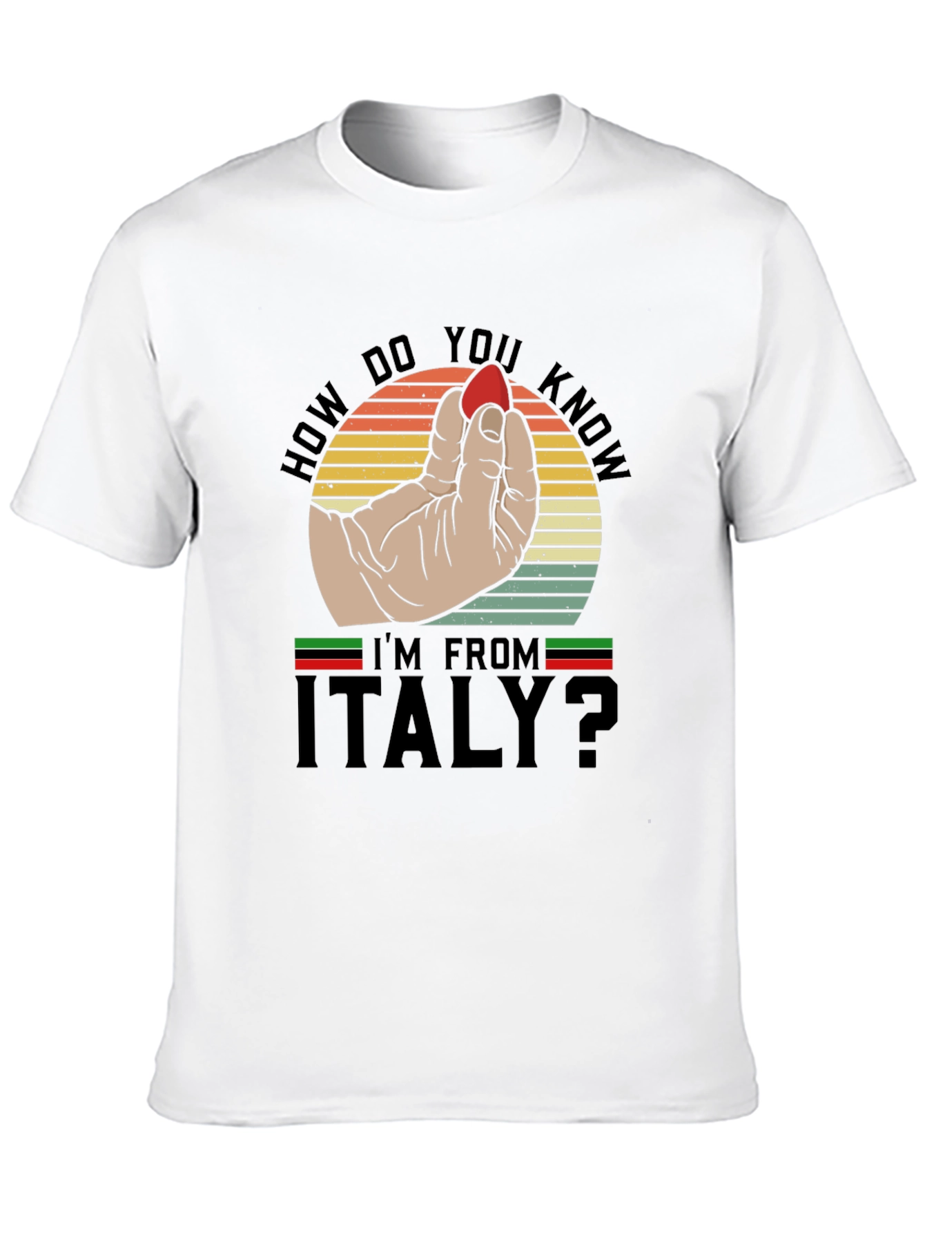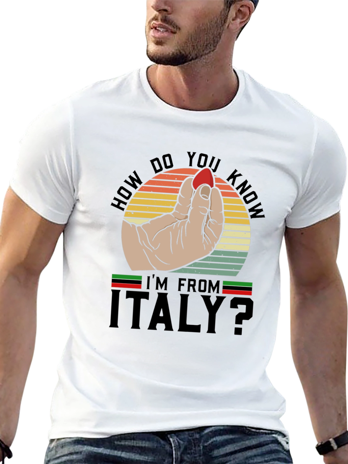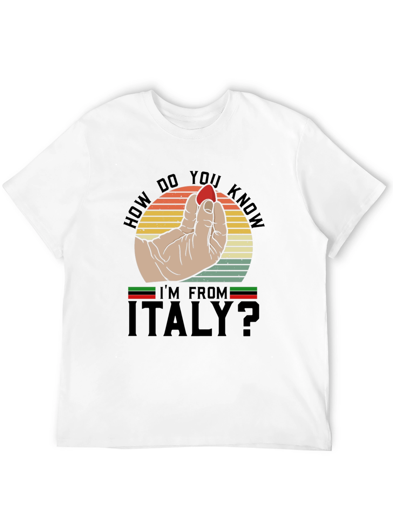 Show off your Italian pride with this unique and humorous t-shirt. The design features a classic Italian hand gesture holding a red object, set against a retro sunset background. The text "HOW DO YOU KNOW I'M FROM ITALY?" playfully asks the question. The colors of the Italian flag accent the design. Made from comfortable black fabric, this tee is perfect for casual wear, family gatherings, or to spark conversation wherever you go. Available in various sizes, it makes a great gift for the Italian in your life or anyone who loves Italian culture. This shirt is sure to bring smiles and connect you with fellow enthusiasts of Italy.