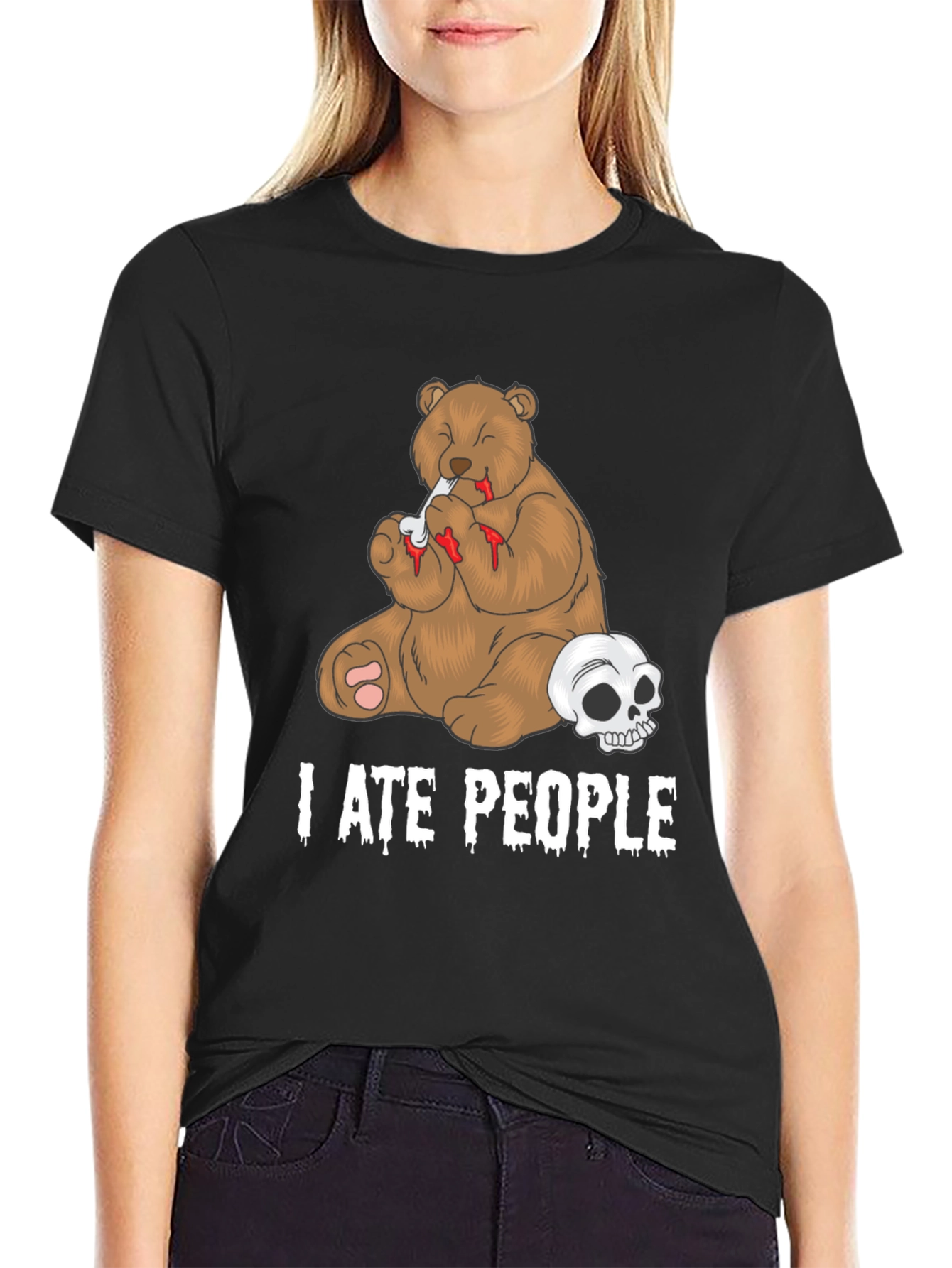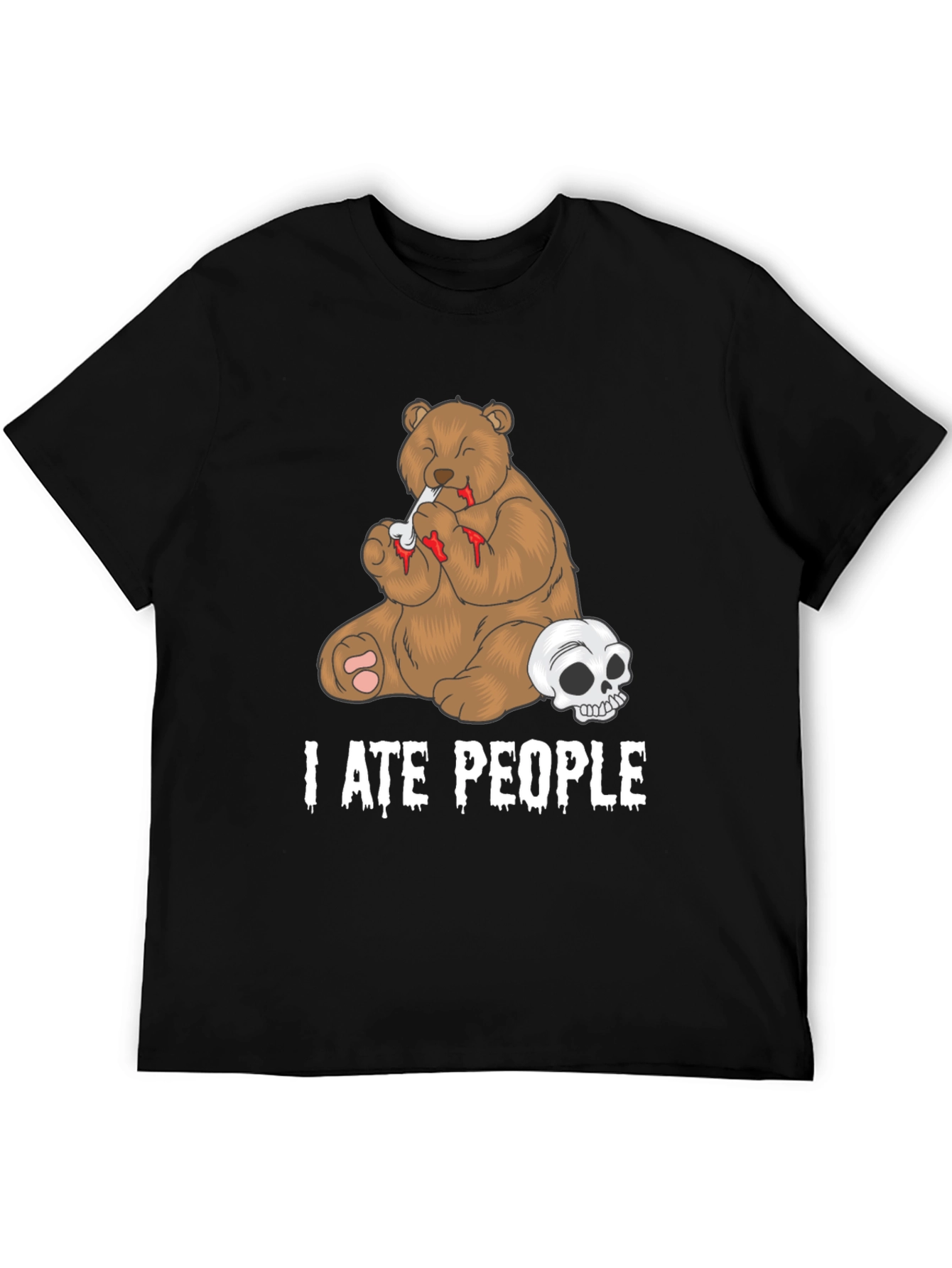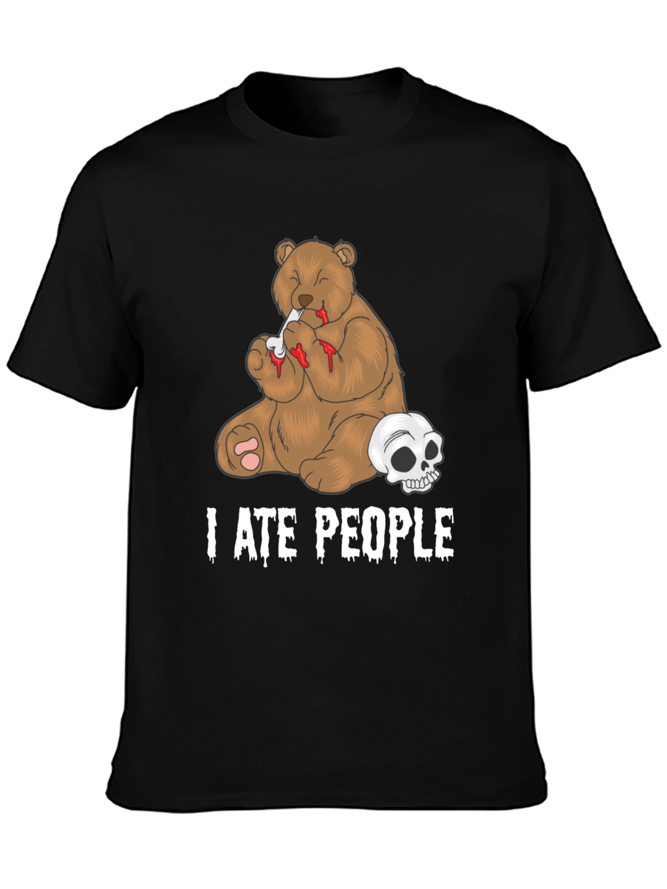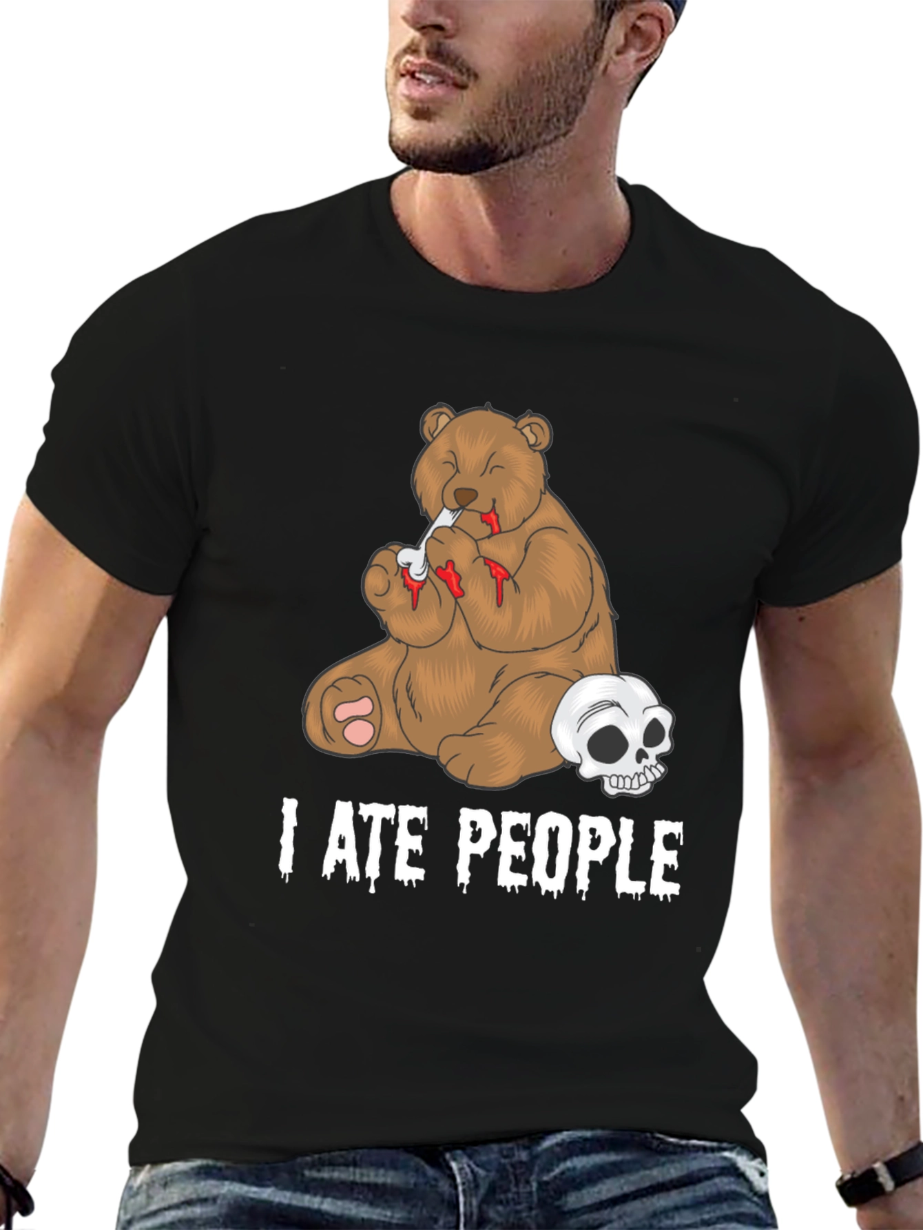 This black graphic tee features a cartoon bear, sitting beside a skull, enjoying a bloody bone. The humorous text reads "I ATE PEOPLE". Constructed from a comfortable-looking fabric, this shirt is suitable for casual wear or making a bold statement. The design is sure to attract attention and spark conversations. The unisex style and fit make it a versatile addition to any wardrobe. Perfect for those with a dark sense of humor, or anyone looking to add a touch of edgy style to their outfits.