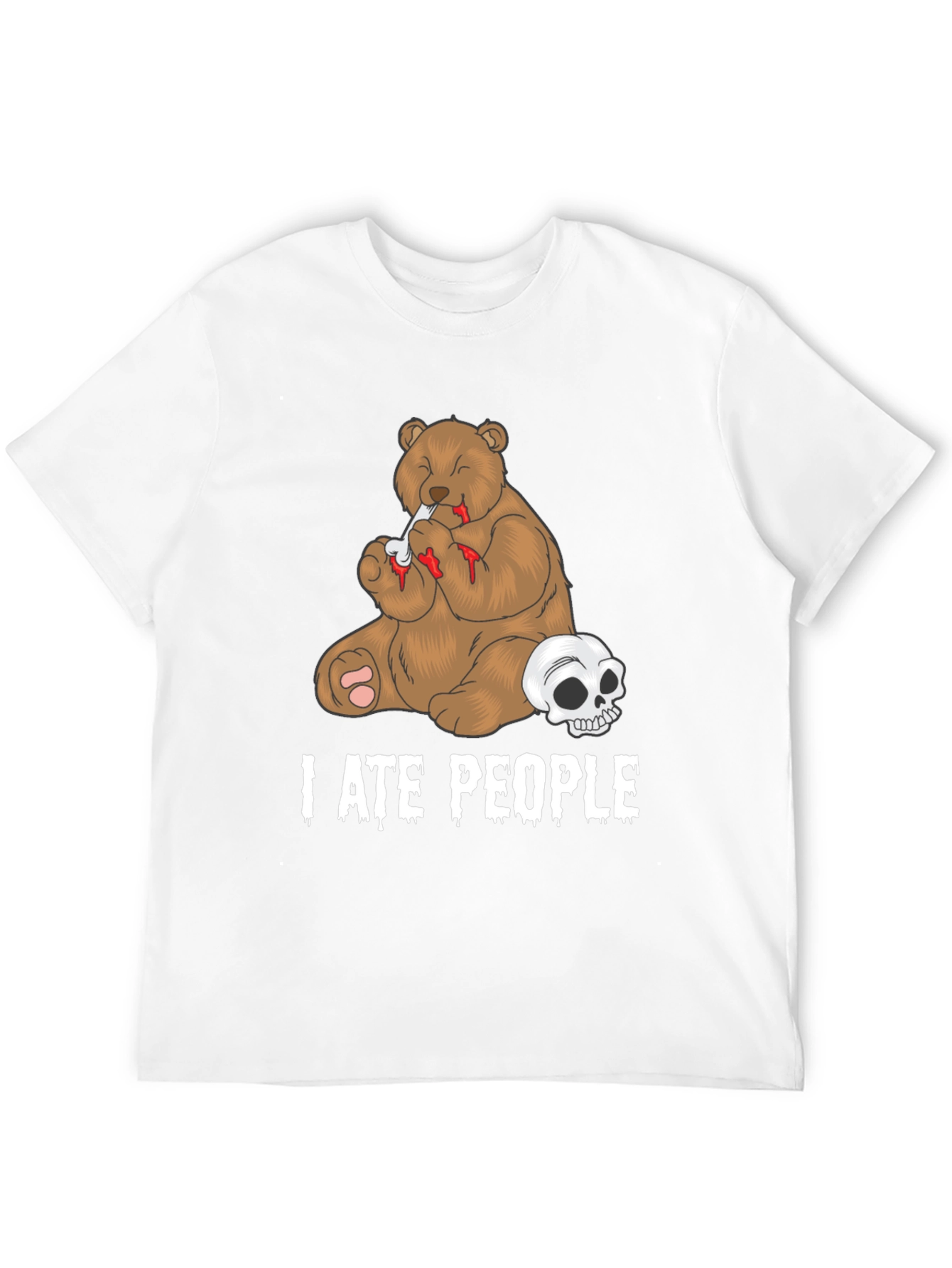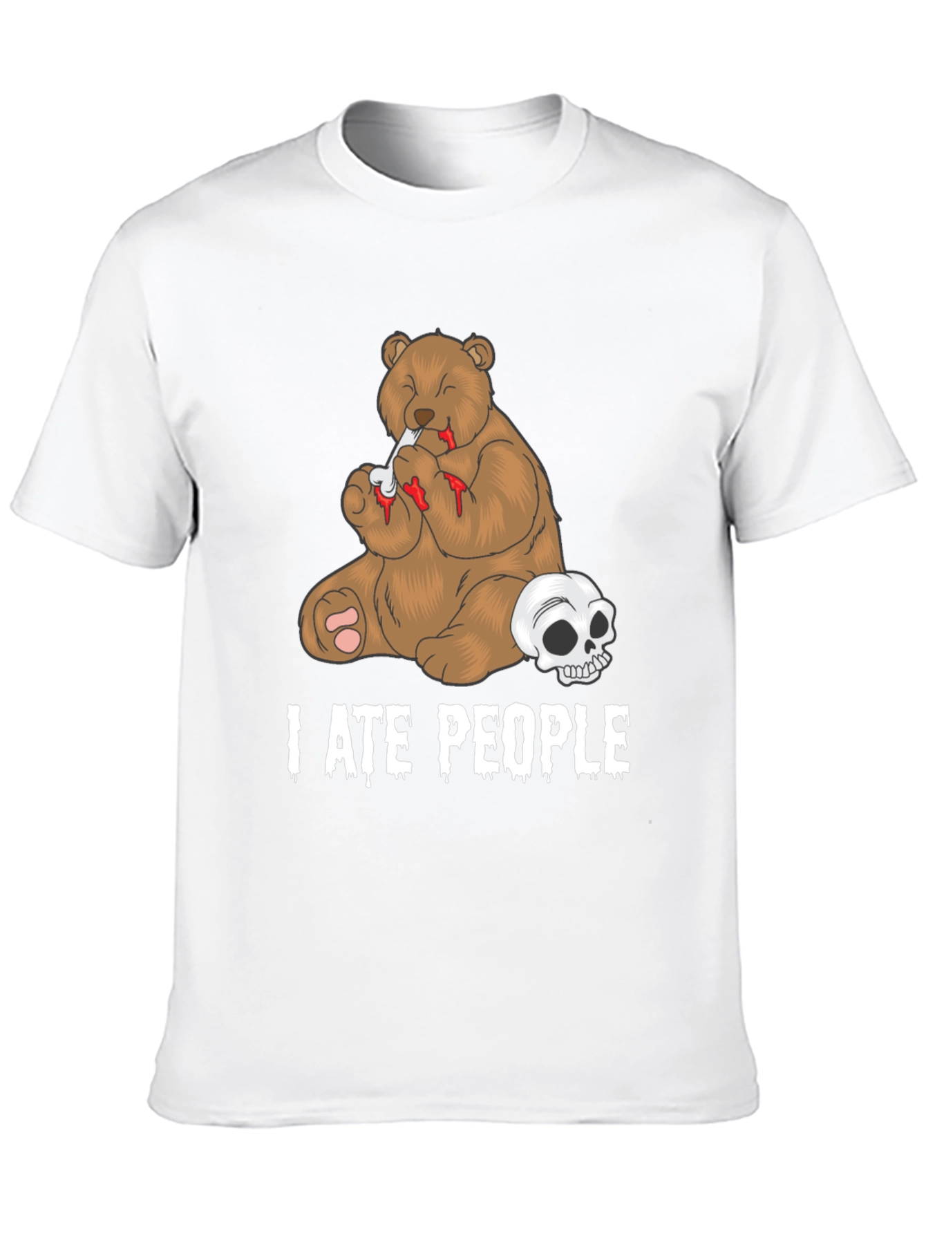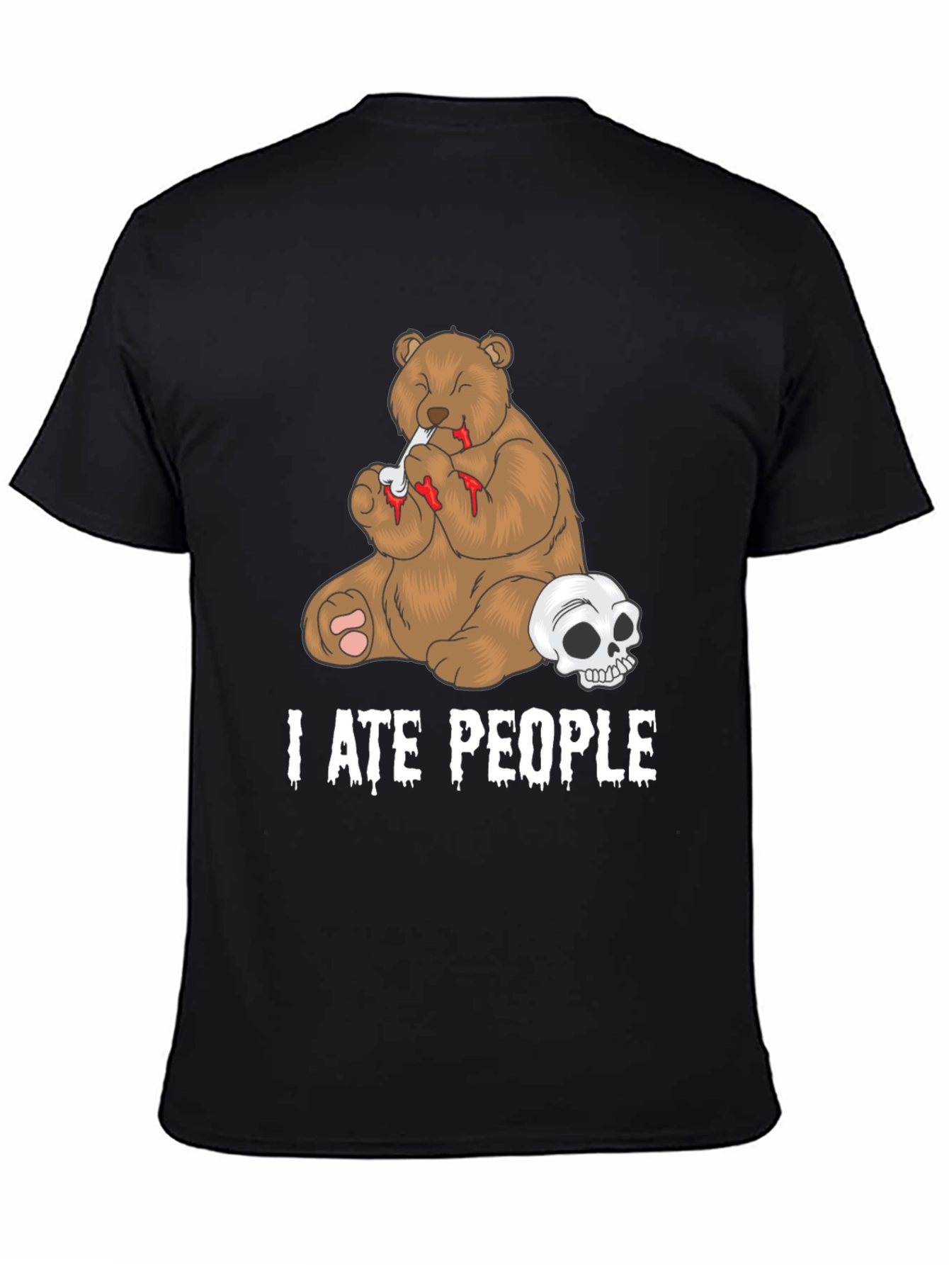 This black graphic tee features a cartoon bear, sitting beside a skull, enjoying a bloody bone. The humorous text reads "I ATE PEOPLE". Constructed from a comfortable-looking fabric, this shirt is suitable for casual wear or making a bold statement. The design is sure to attract attention and spark conversations. The unisex style and fit make it a versatile addition to any wardrobe. Perfect for those with a dark sense of humor, or anyone looking to add a touch of edgy style to their outfits.