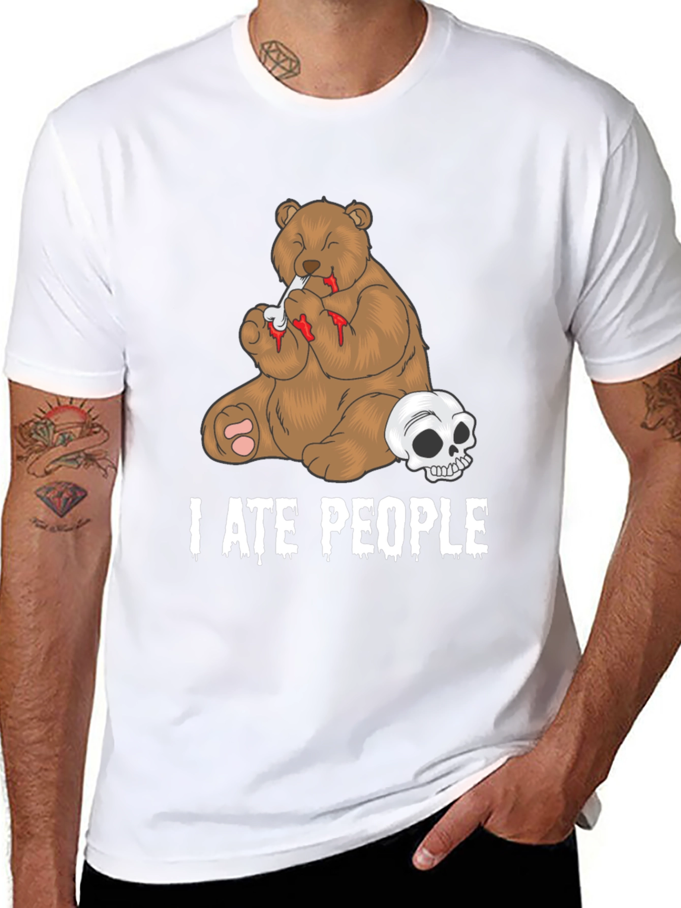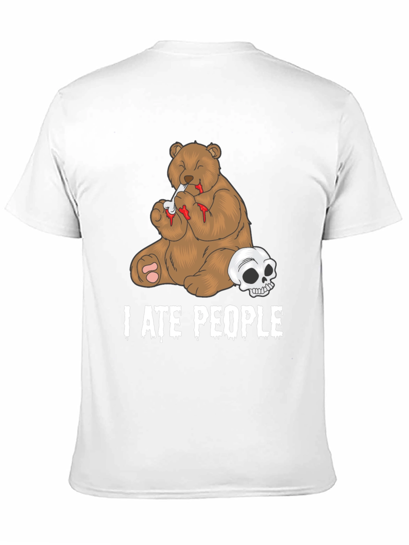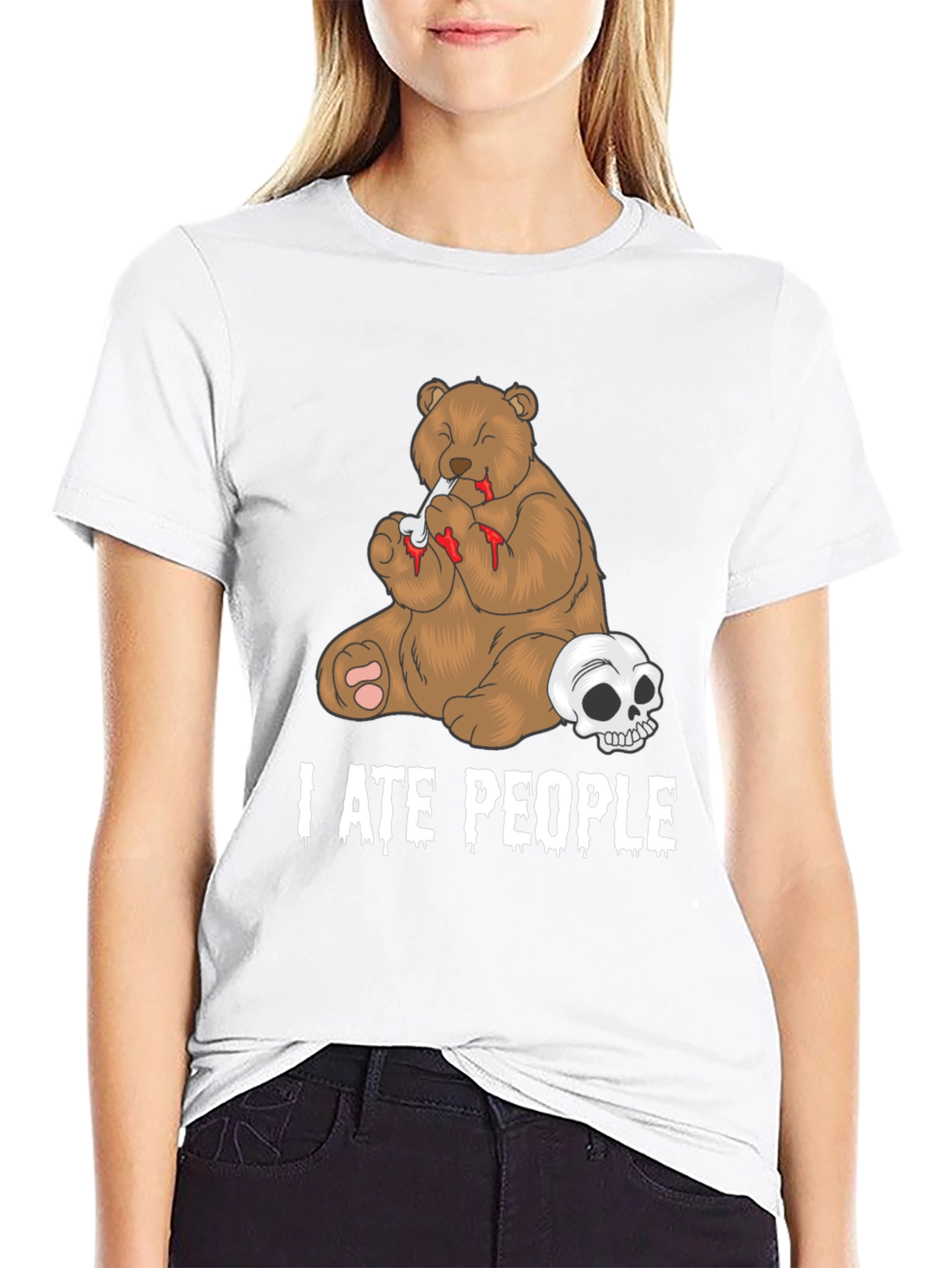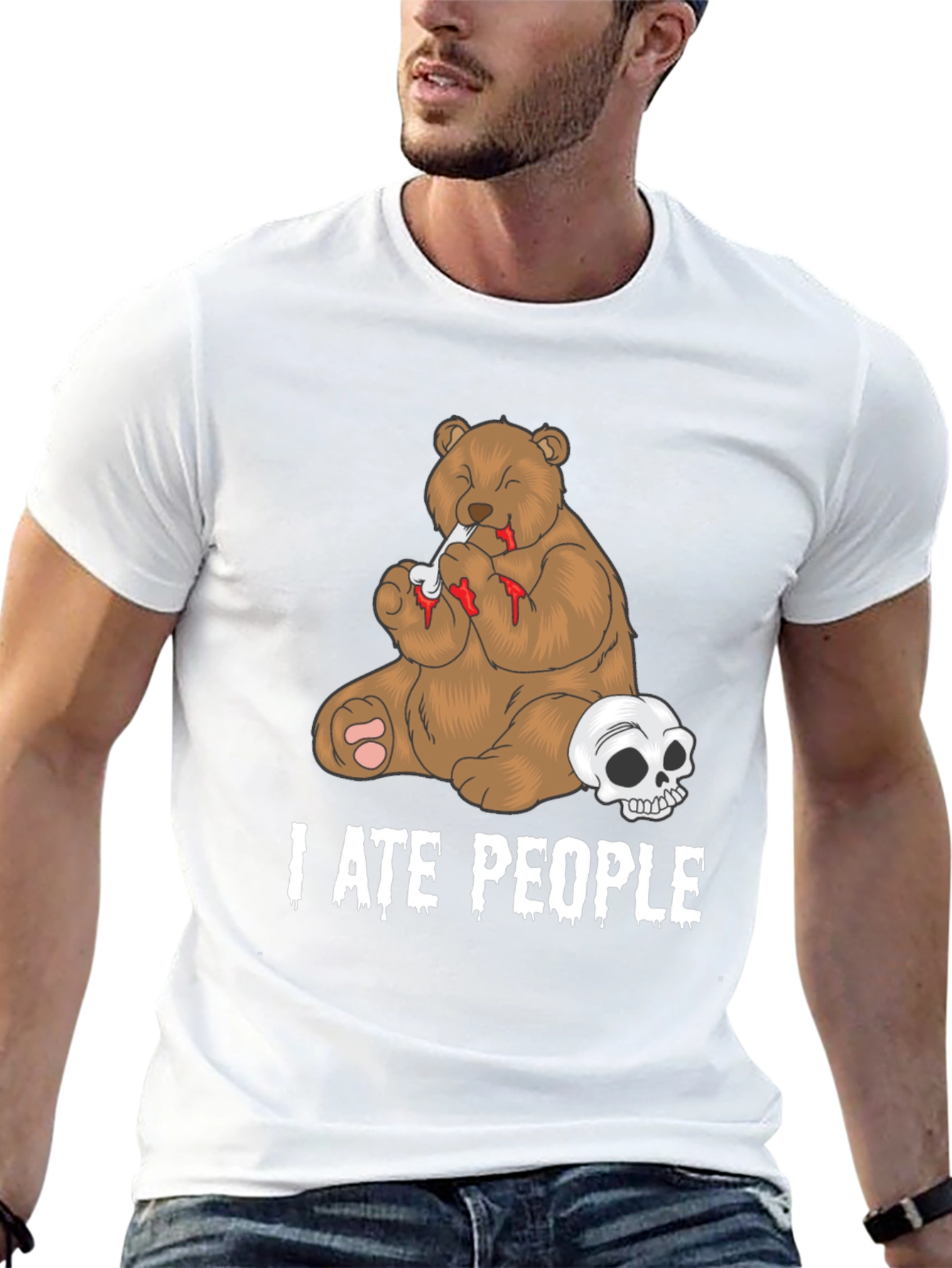 This black graphic tee features a cartoon bear, sitting beside a skull, enjoying a bloody bone. The humorous text reads "I ATE PEOPLE". Constructed from a comfortable-looking fabric, this shirt is suitable for casual wear or making a bold statement. The design is sure to attract attention and spark conversations. The unisex style and fit make it a versatile addition to any wardrobe. Perfect for those with a dark sense of humor, or anyone looking to add a touch of edgy style to their outfits.