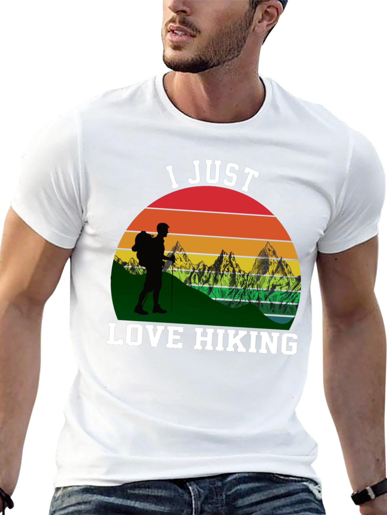 This black t-shirt features a vibrant, eye-catching graphic that speaks to the outdoor enthusiast. A silhouette of a hiker with a backpack and trekking poles stands against a backdrop of mountains, a colorful sunset, and lush green hills. The phrase "I JUST LOVE HIKING" is boldly printed above and below the nature scene. Made from a comfortable and durable fabric, this tee is perfect for casual wear, hiking adventures, or as a thoughtful gift for someone who loves the great outdoors. Its classic fit makes it a versatile addition to any wardrobe. Show off your passion for hiking with this unique and stylish t-shirt.
