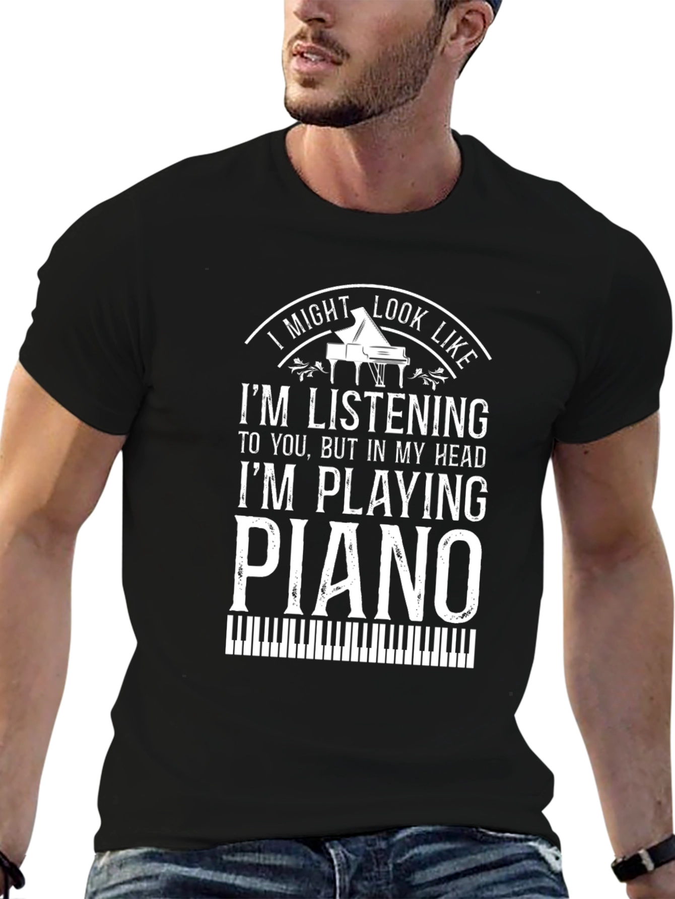 Show off your love for music with this stylish black t-shirt. The design features a white graphic with the words "I Might Look Like I'm Listening To You But In My Head I'm Playing Piano," along with an illustration of a piano. The t-shirt is made from a soft, comfortable fabric, perfect for everyday wear. Ideal for musicians, piano players, or anyone who appreciates a clever and unique design. Makes a great gift for the music lover in your life. Wear it to rehearsals, concerts, or just around town to express your passion for music.