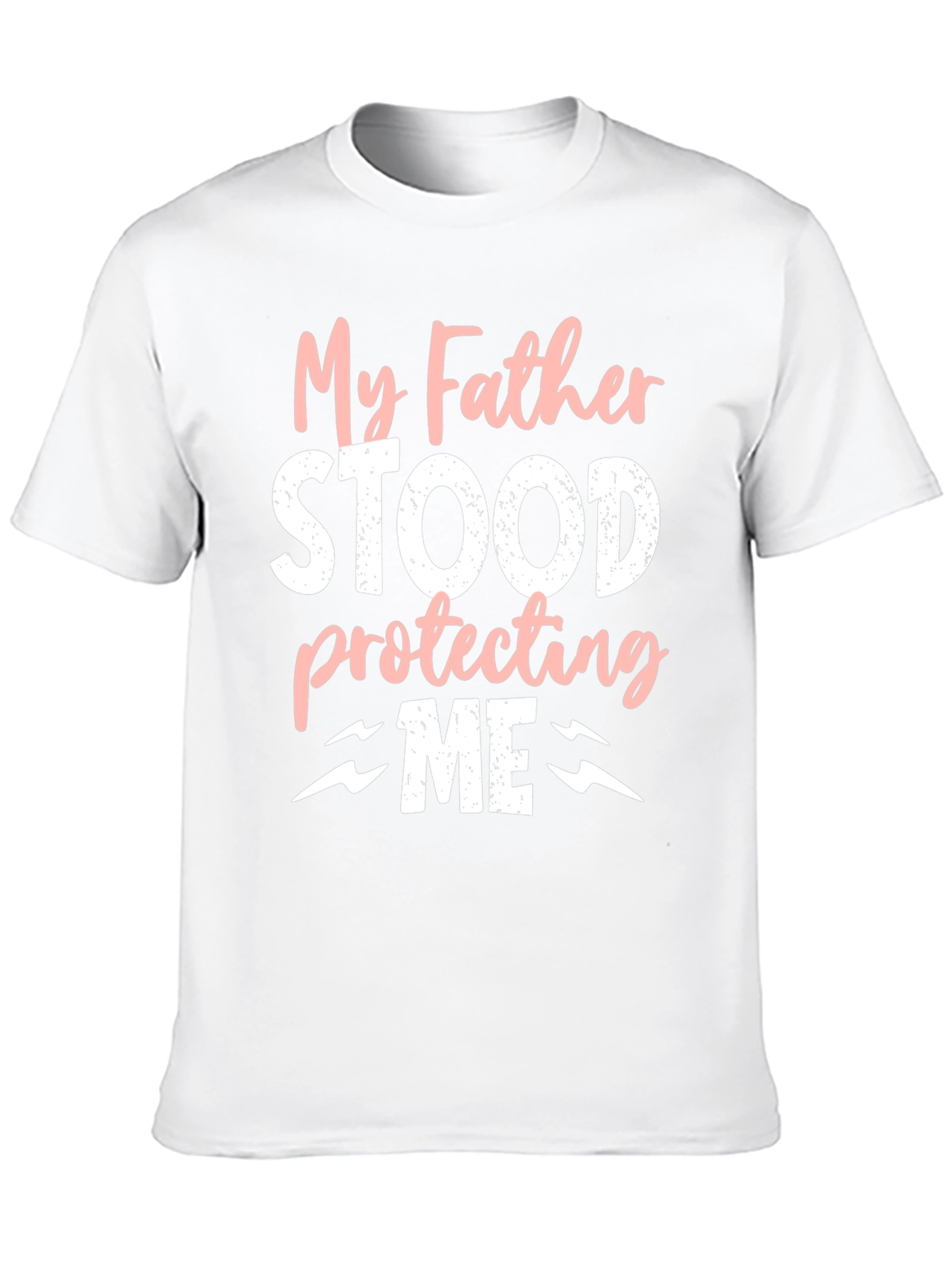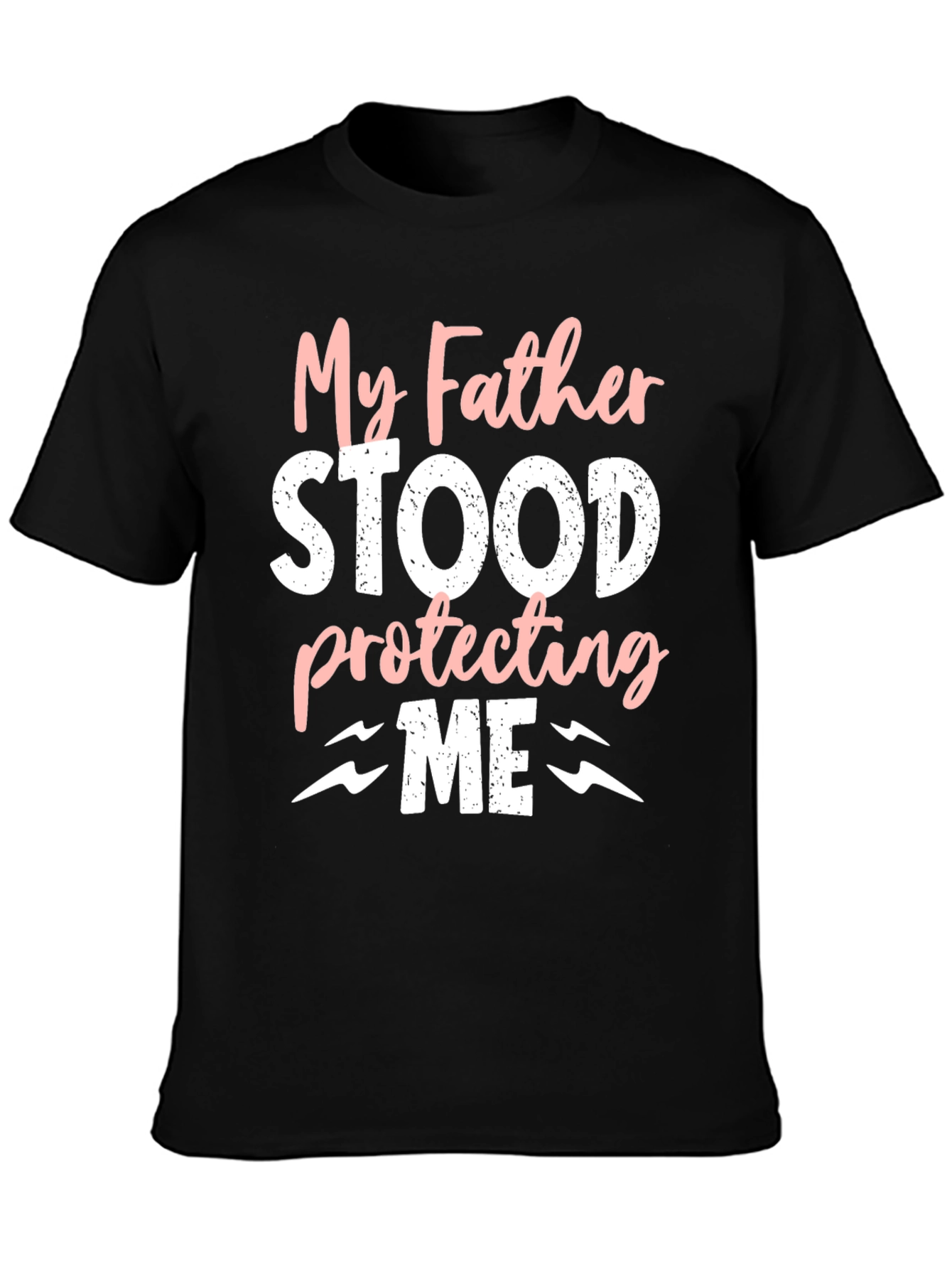 Show your appreciation with this sentimental black graphic tee. It features a heartfelt design with "My Father STOOD protecting ME" printed in bold white and peach lettering. Perfect for Father's Day, birthdays, or just to express your love. The short-sleeved shirt offers a comfortable fit for everyday wear. Give dad a gift that will be treasured for years to come. This shirt is versatile and makes a statement. Buy this for your dad today and bring a smile to his face!