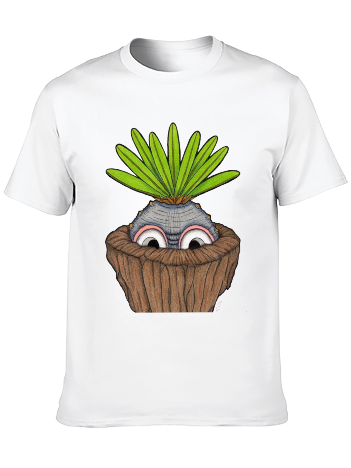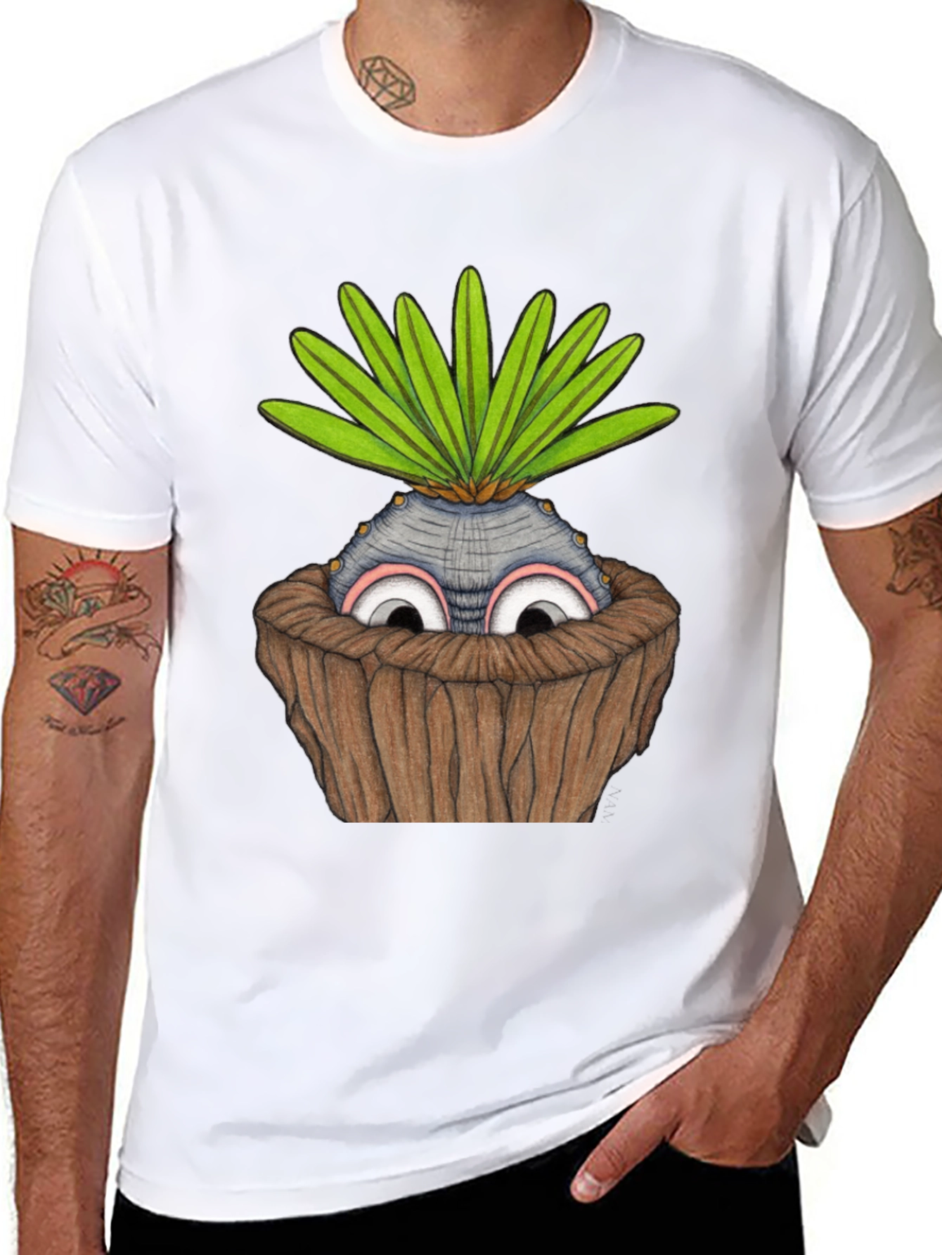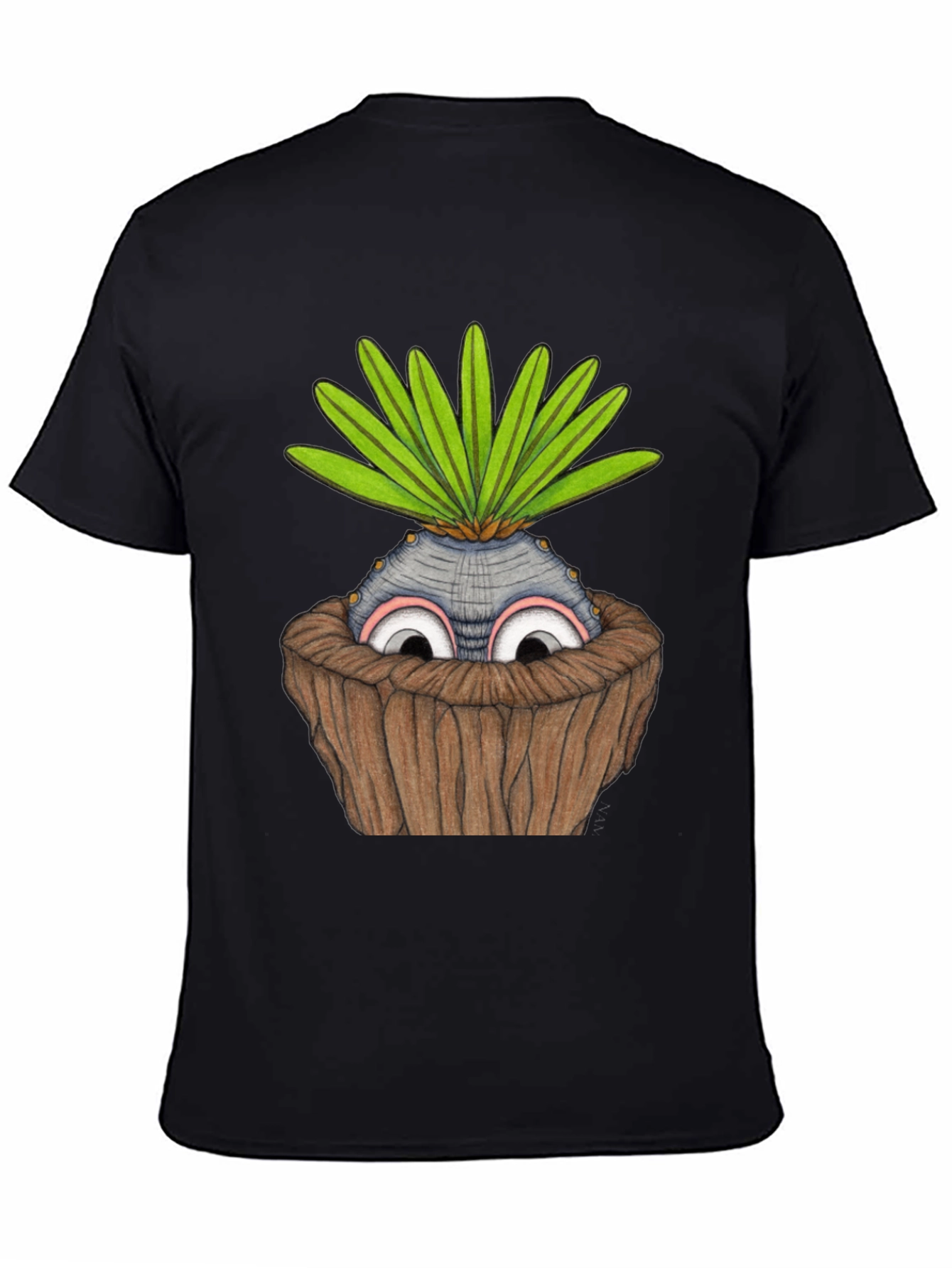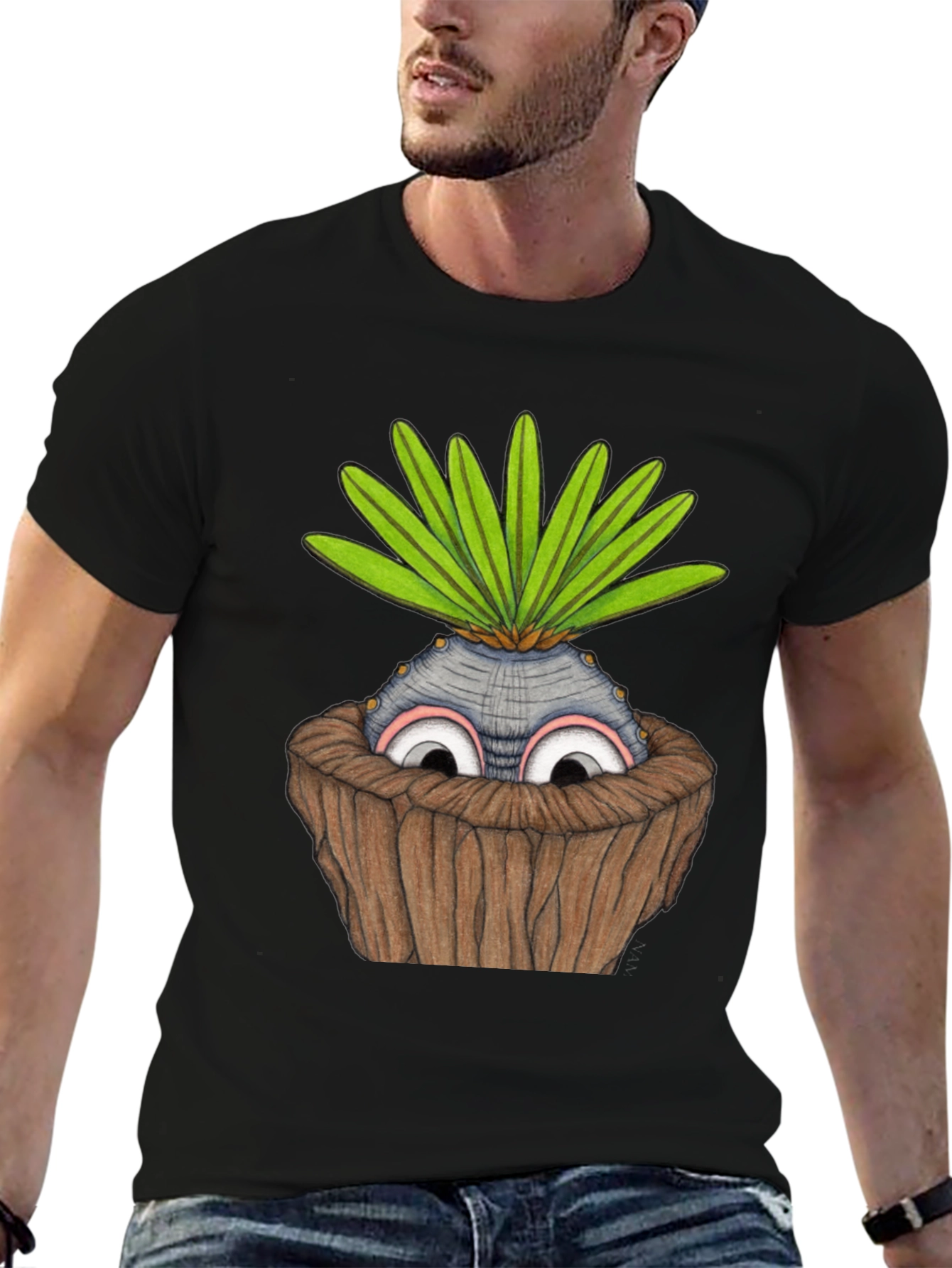 Show off your love for quirky designs with this eye-catching black t-shirt. Featuring a unique illustration of a plant-like creature with big, expressive eyes peeking out from a pot, this shirt is sure to spark conversation. The design is printed on a comfortable, classic-fit black tee, making it a versatile addition to your wardrobe. Perfect for casual outings, gaming sessions, or as a fun gift for fans of unique and imaginative artwork. Add a touch of whimsy to your everyday style with this standout graphic tee. It's bound to turn heads and bring smiles wherever you go!