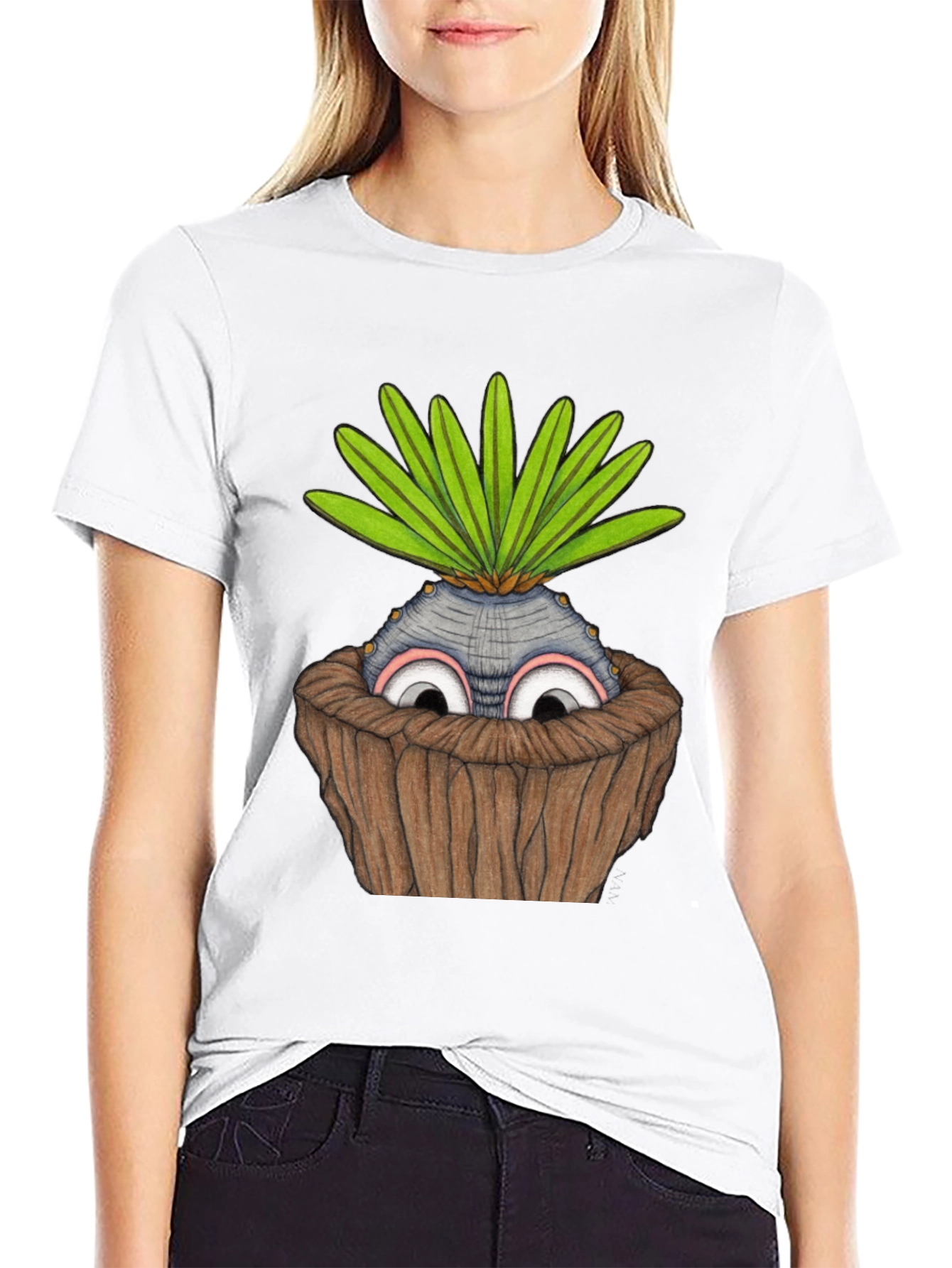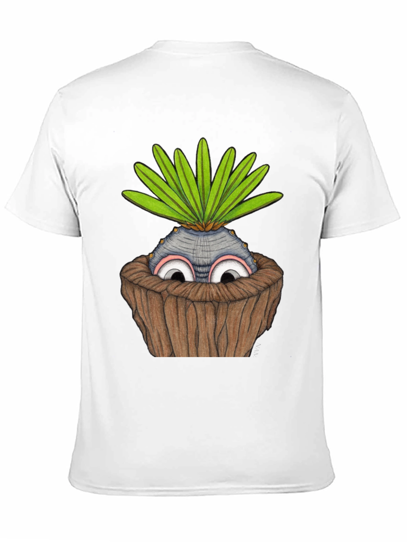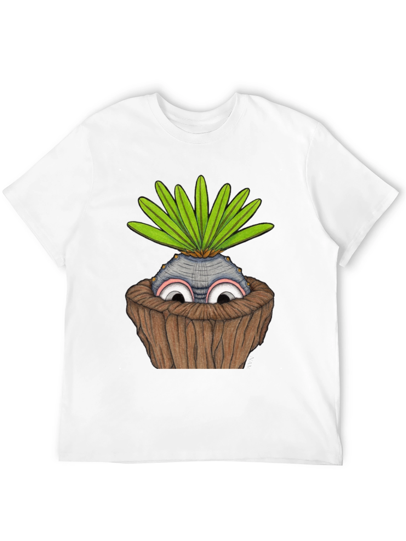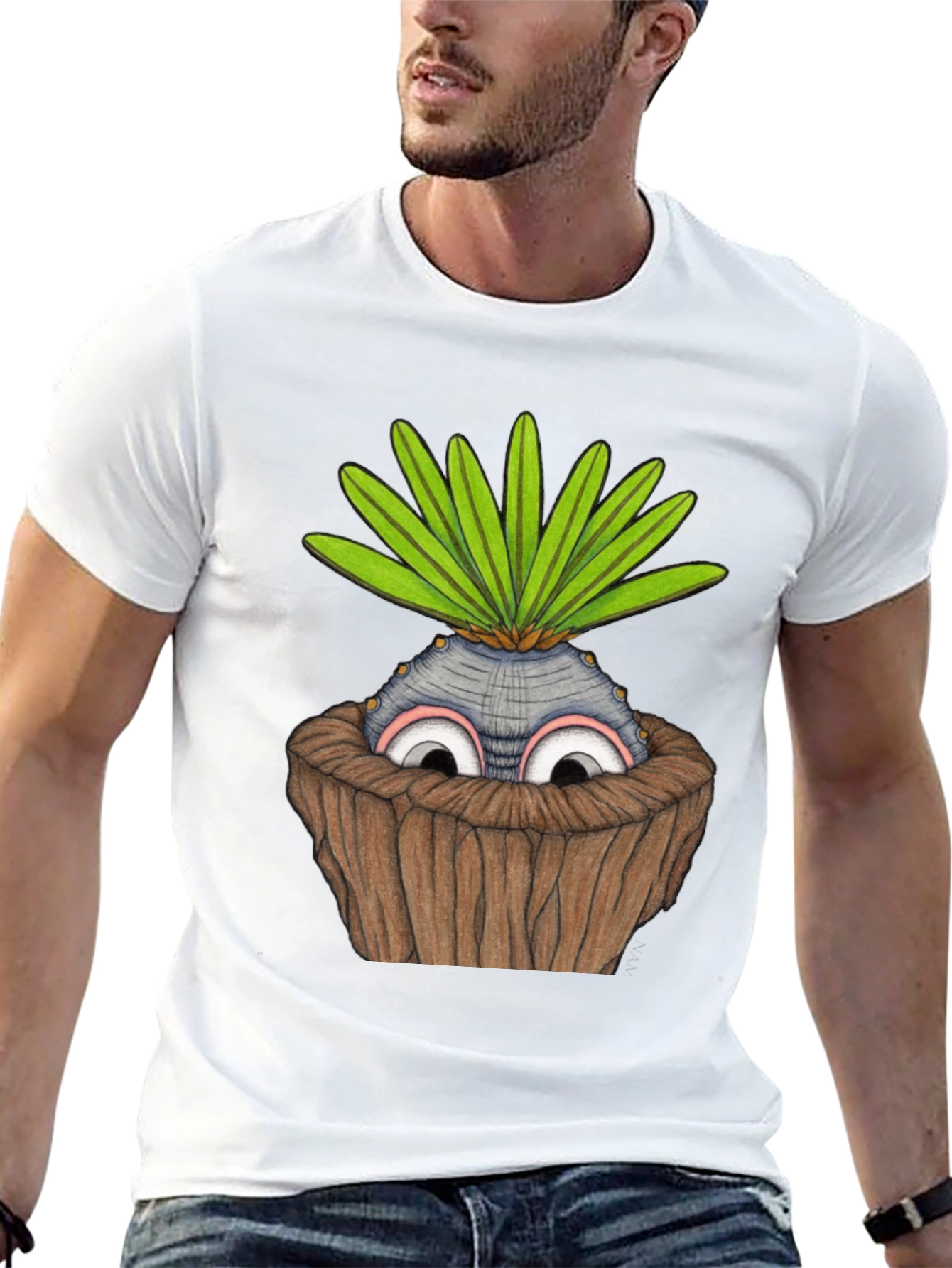 Show off your love for quirky designs with this eye-catching black t-shirt. Featuring a unique illustration of a plant-like creature with big, expressive eyes peeking out from a pot, this shirt is sure to spark conversation. The design is printed on a comfortable, classic-fit black tee, making it a versatile addition to your wardrobe. Perfect for casual outings, gaming sessions, or as a fun gift for fans of unique and imaginative artwork. Add a touch of whimsy to your everyday style with this standout graphic tee. It's bound to turn heads and bring smiles wherever you go!