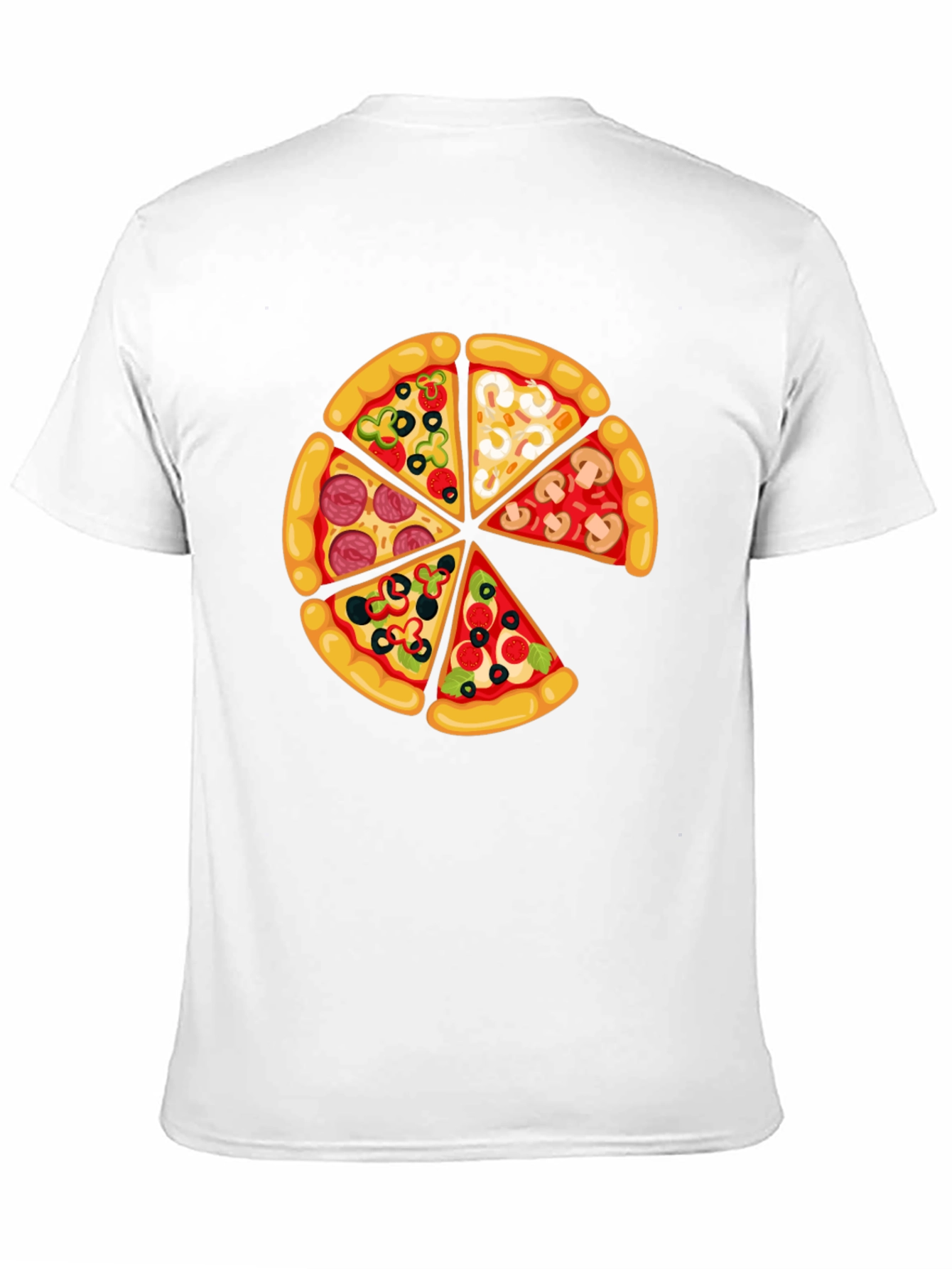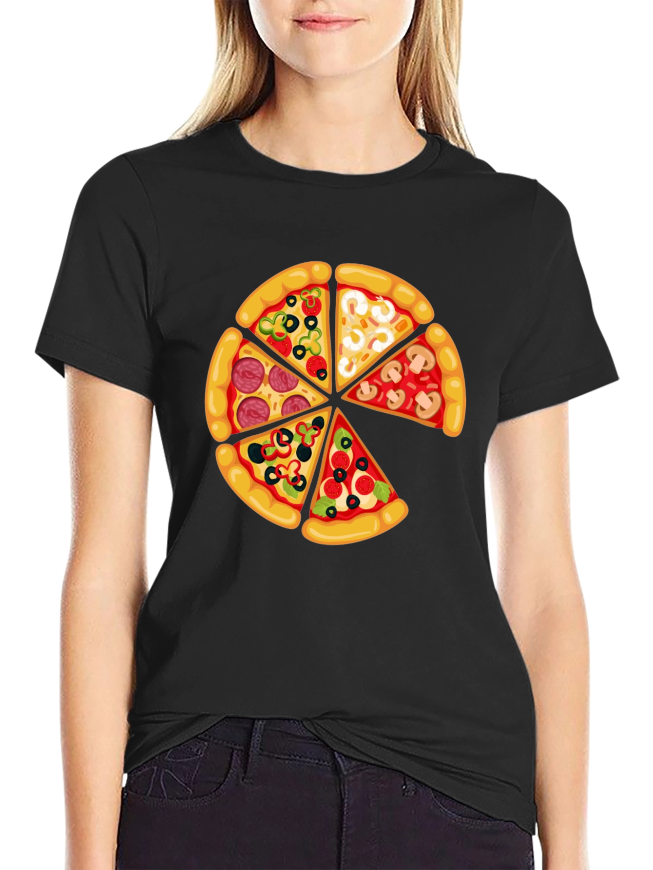 Show off your love for pizza with this eye-catching black t-shirt. The shirt features a vibrant graphic of a whole pizza pie made up of different flavor slices. Made from what appears to be a soft and comfortable fabric, this tee is perfect for casual wear. Great for pizza lovers, casual outings, or as a fun gift. Get ready to spark conversations and cravings wherever you go with this unique shirt!