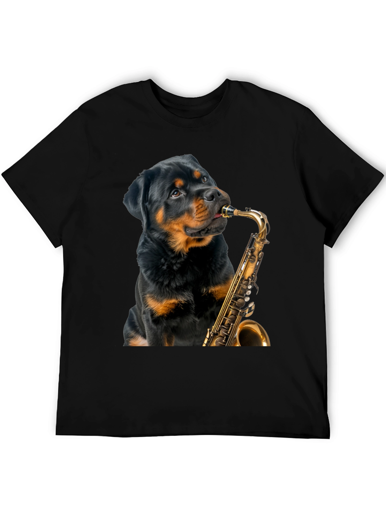 Show off your love for dogs and music with this unique t-shirt! This black tee features a high-quality print of an adorable Rottweiler puppy playing the saxophone. Made from comfortable, breathable fabric, this shirt is perfect for everyday wear. The detailed graphic captures the charm of the Rottweiler breed and the whimsy of a musical performance. Great for casual outings, music events, or simply lounging at home. Makes a great gift for dog lovers, musicians, or anyone with a sense of humor. Get yours today and let your style speak volumes!