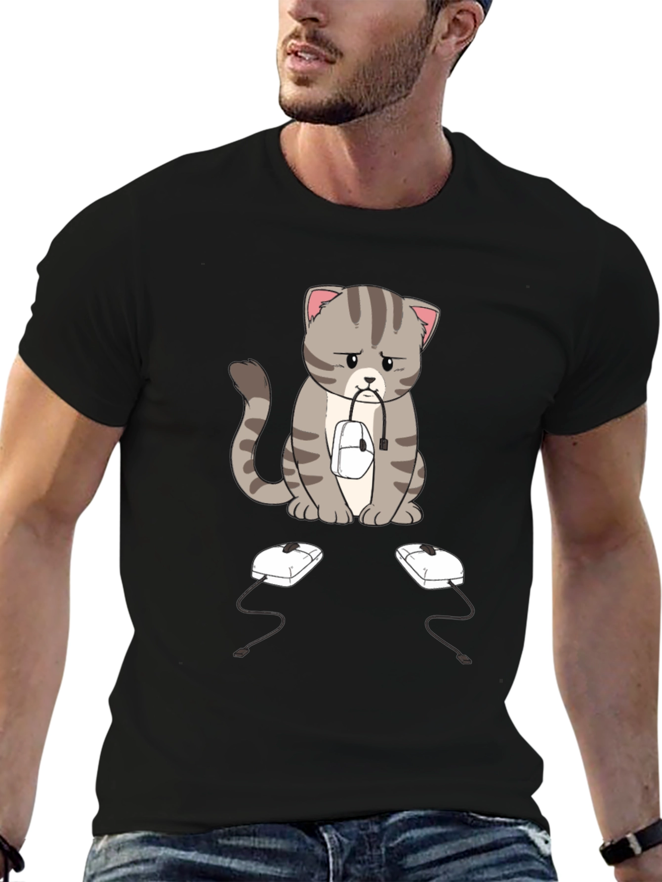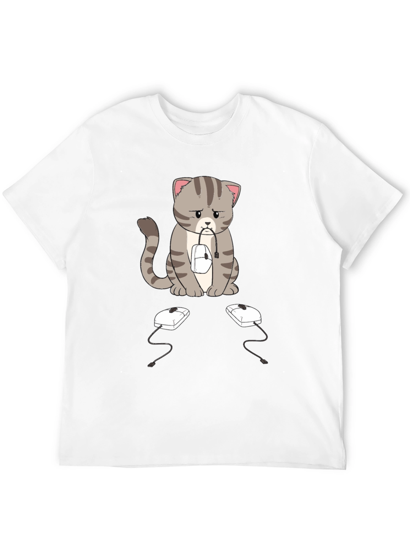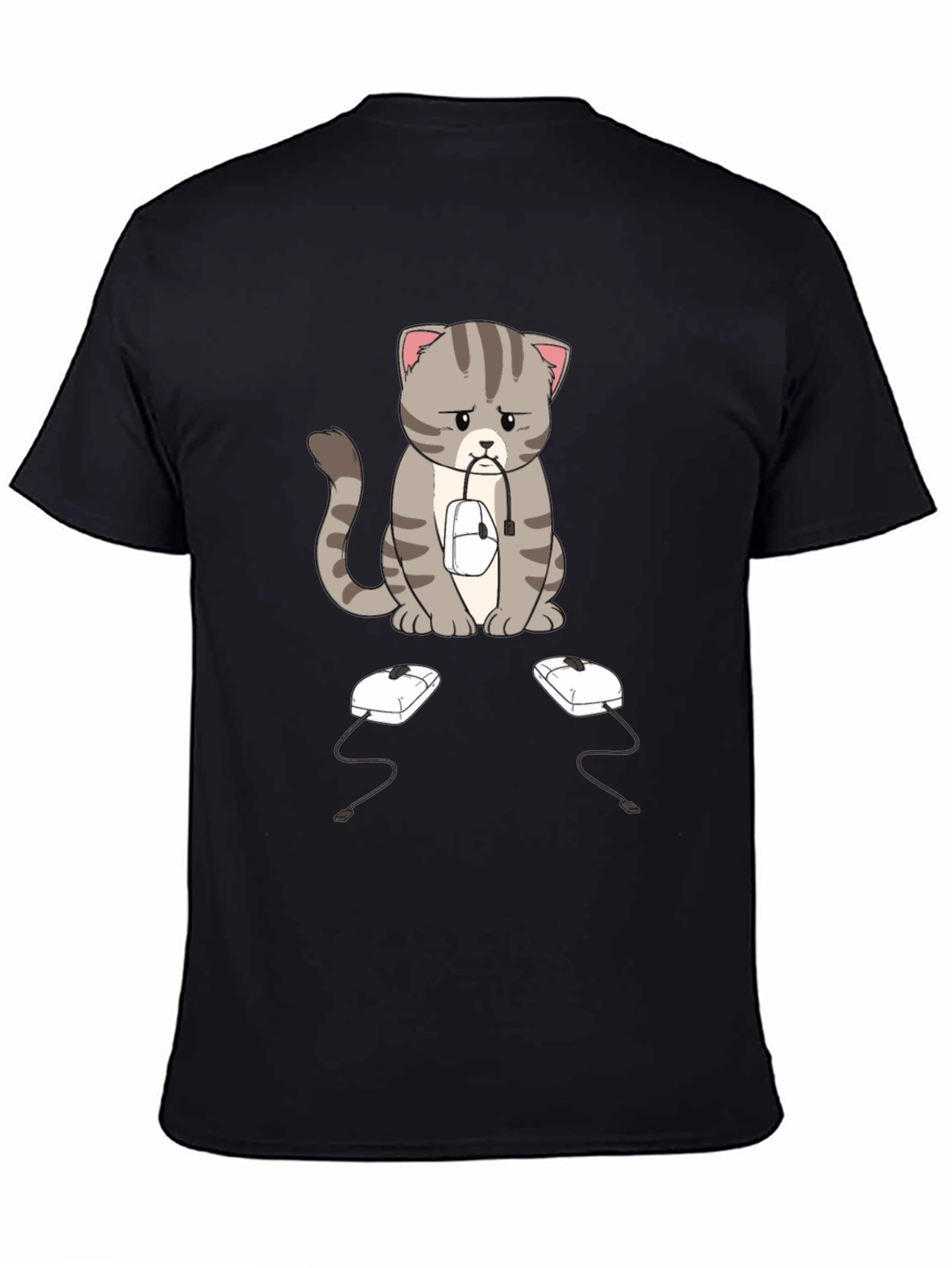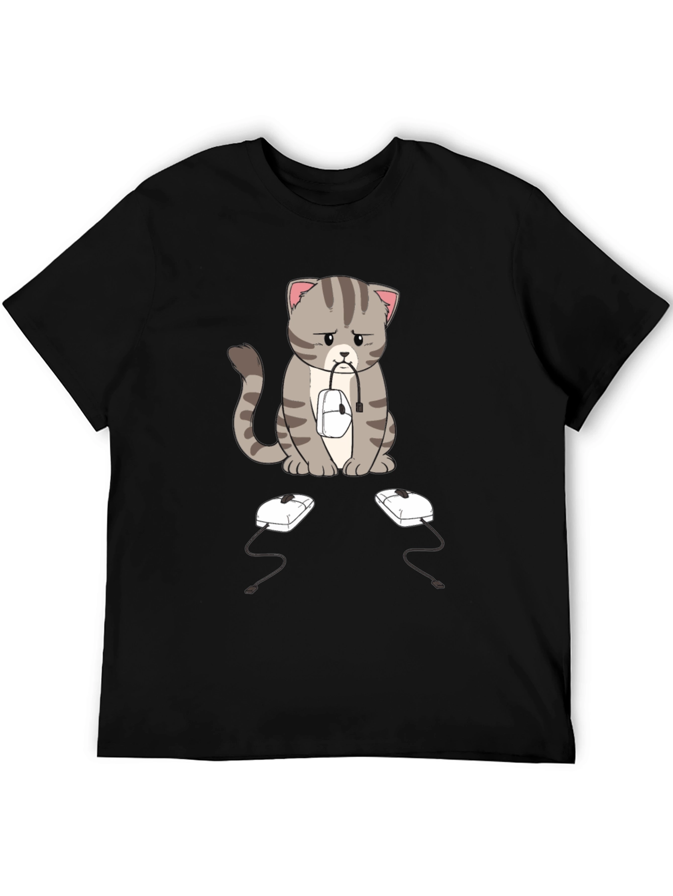 This black t-shirt features a sad-looking cartoon cat with gray stripes, sitting with a computer mouse in its mouth. Two more computer mice sit on the ground in front of it. The design is eye-catching and unique, perfect for cat lovers and tech enthusiasts alike. The shirt appears to be made of a soft, comfortable fabric, making it ideal for everyday wear. Whether you're working from home, gaming, or just relaxing, this shirt is sure to spark conversation and add a touch of humor to your wardrobe. A great gift idea!