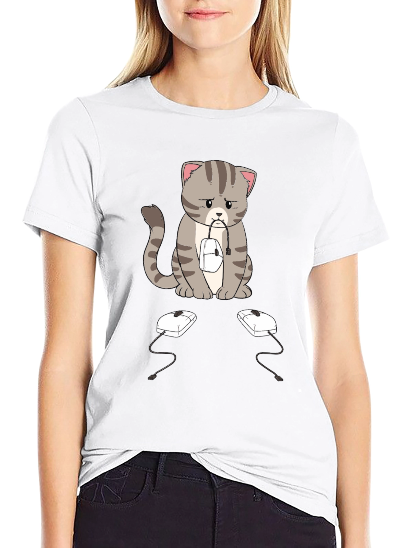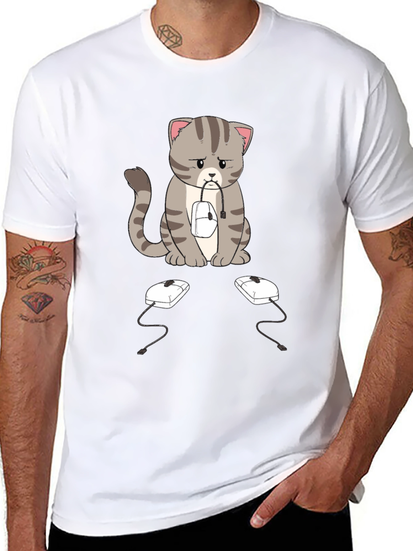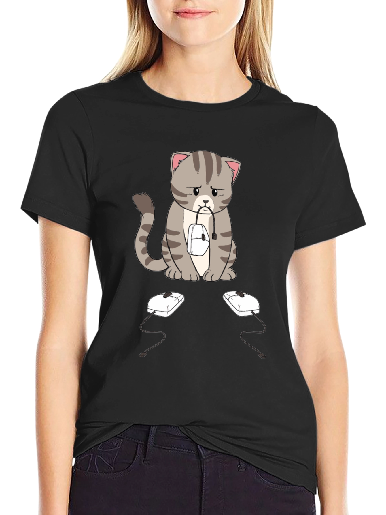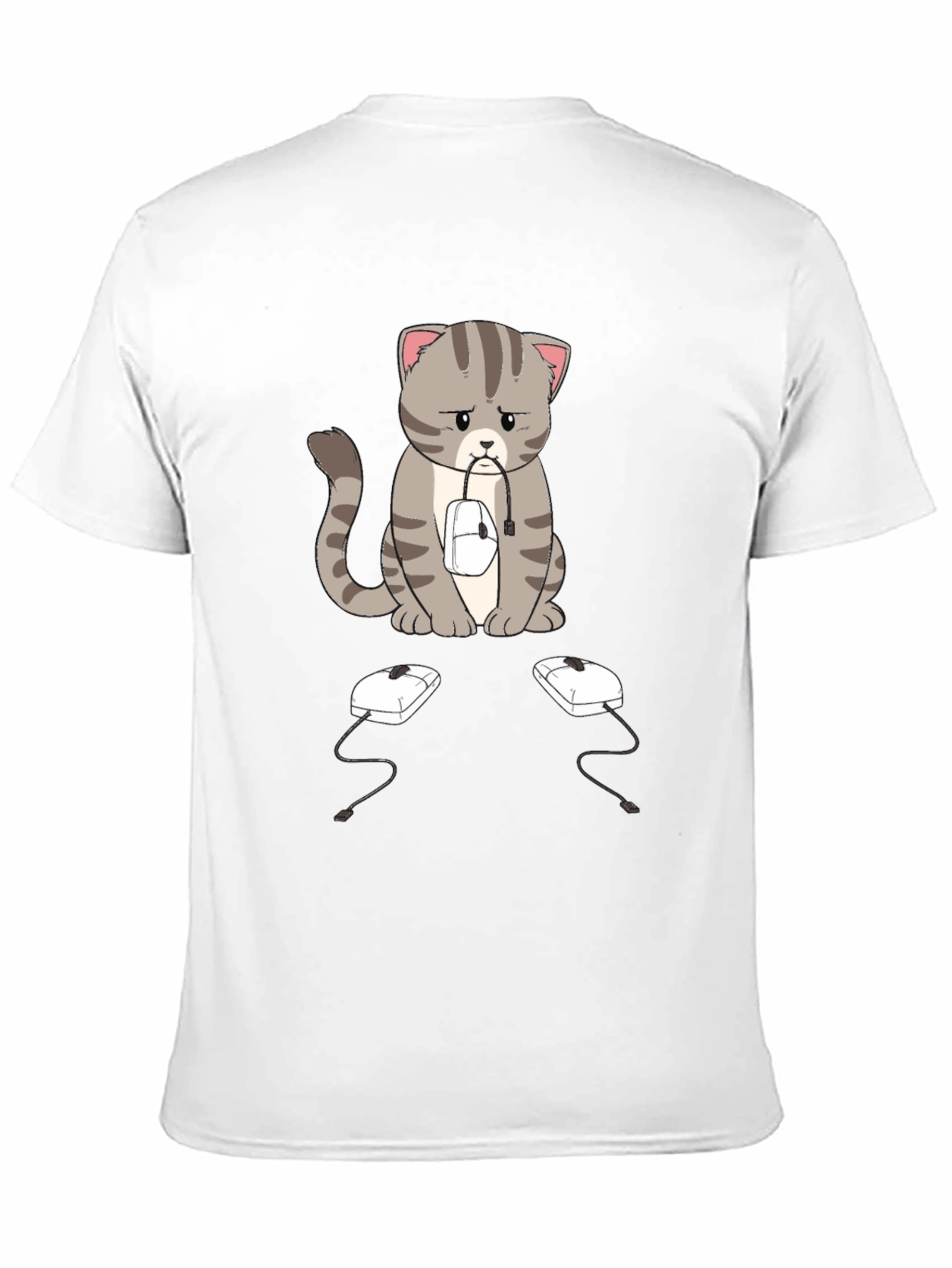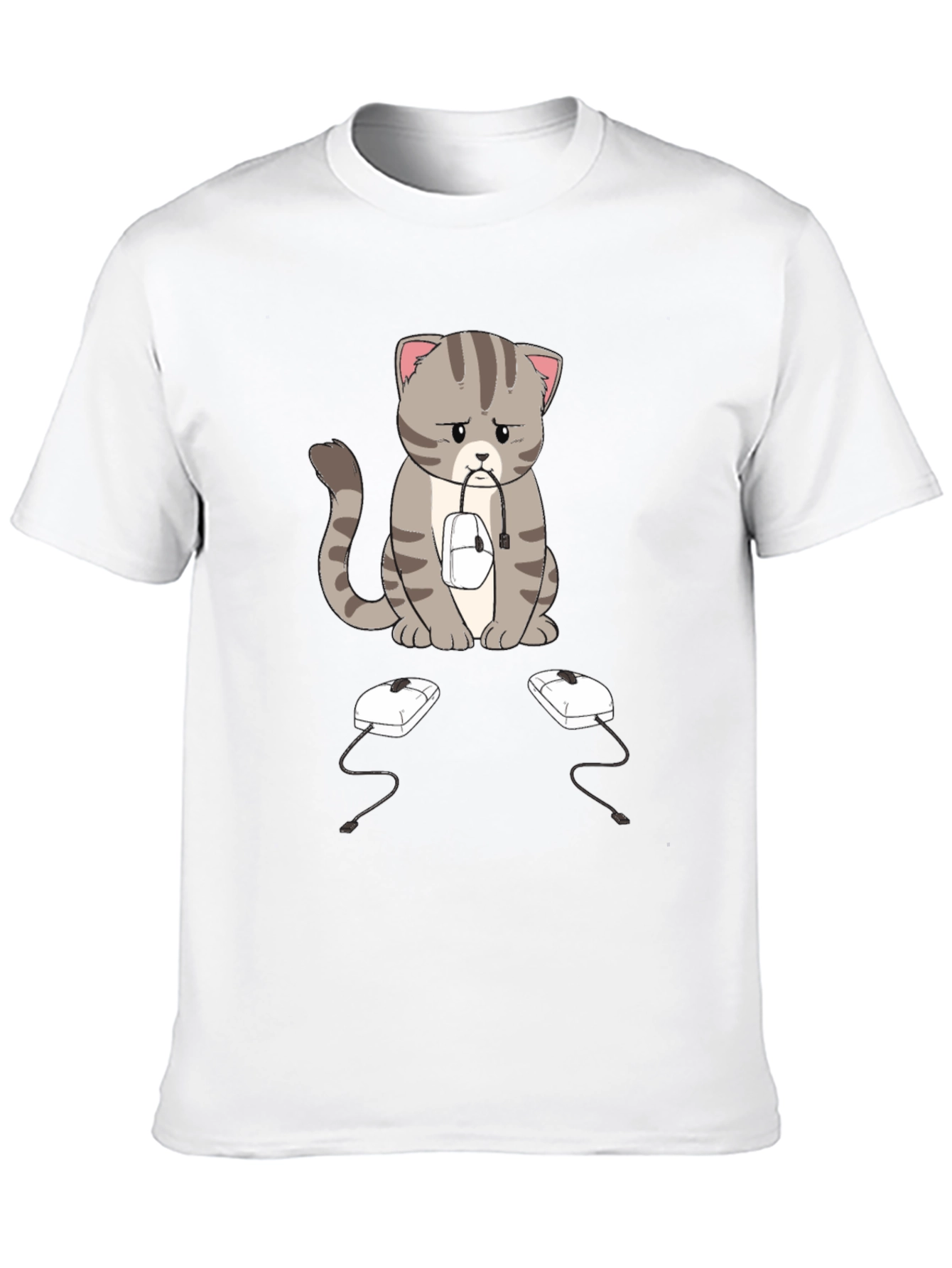 This black t-shirt features a sad-looking cartoon cat with gray stripes, sitting with a computer mouse in its mouth. Two more computer mice sit on the ground in front of it. The design is eye-catching and unique, perfect for cat lovers and tech enthusiasts alike. The shirt appears to be made of a soft, comfortable fabric, making it ideal for everyday wear. Whether you're working from home, gaming, or just relaxing, this shirt is sure to spark conversation and add a touch of humor to your wardrobe. A great gift idea!