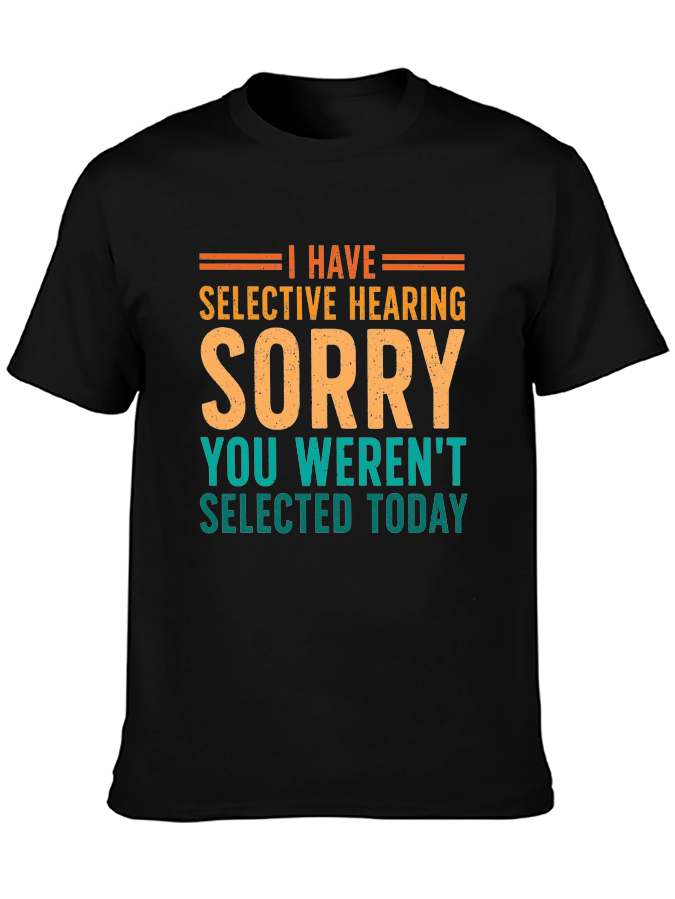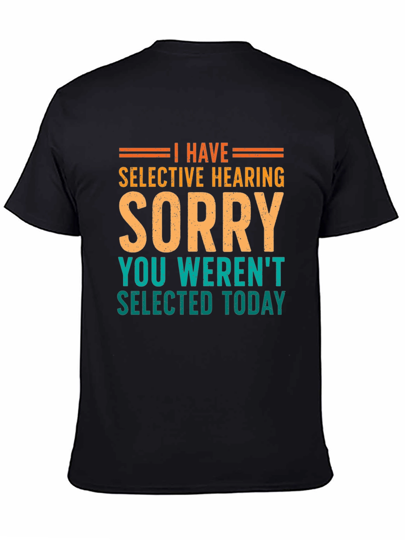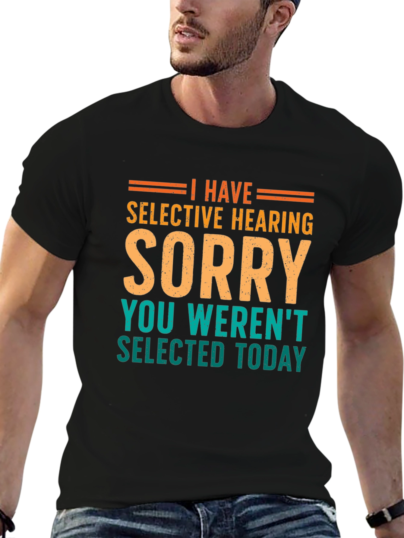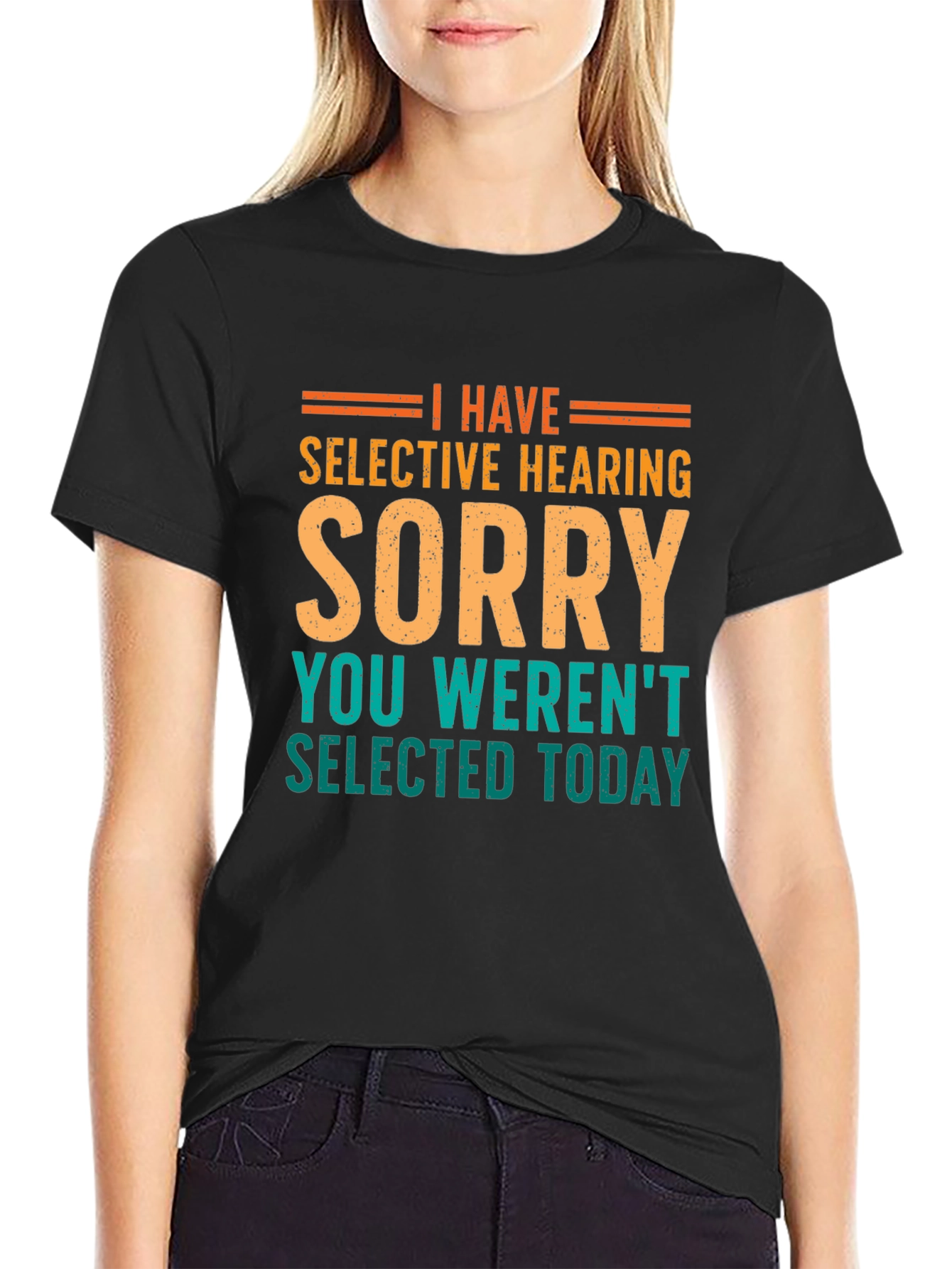 This black t-shirt features a humorous saying in orange and teal fonts. The message reads, "I HAVE SELECTIVE HEARING. SORRY YOU WEREN'T SELECTED TODAY." It is made from a soft-looking fabric, and it appears to be suitable for casual wear. The t-shirt is ideal for those with a sense of humor or anyone who wants to make a statement. This tee would be great to wear for running errands, lounging at home, or hanging out with friends.