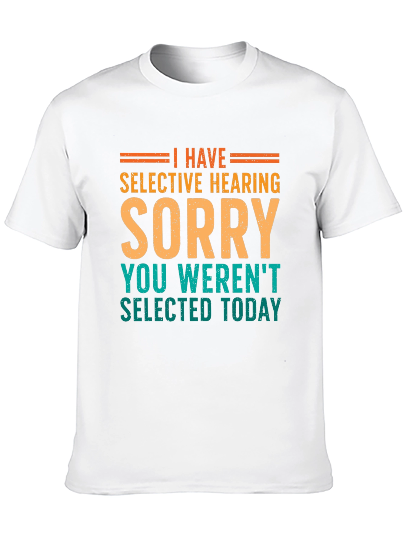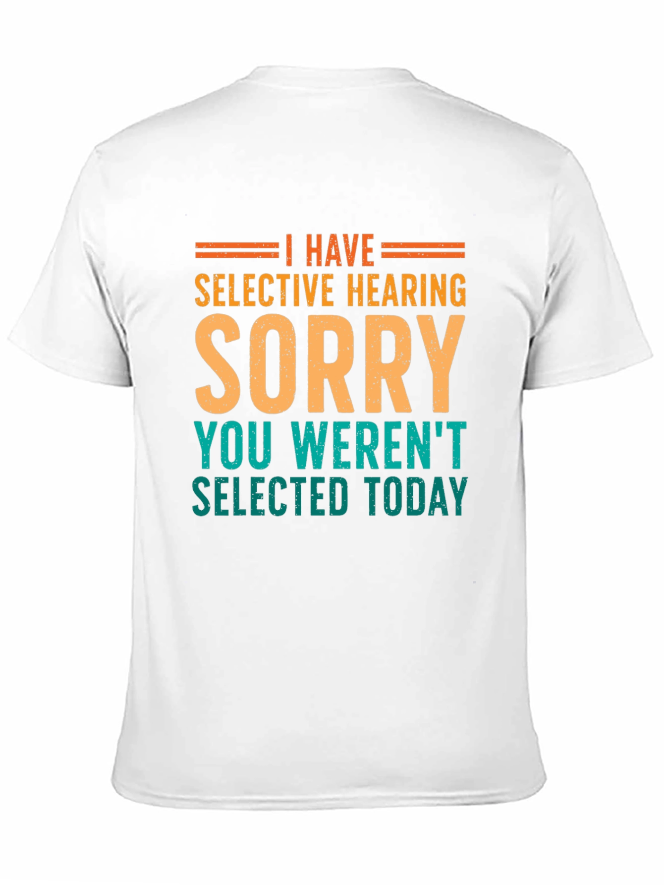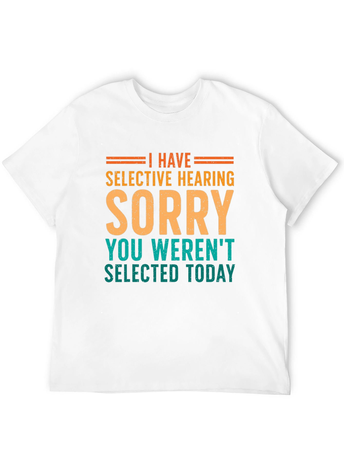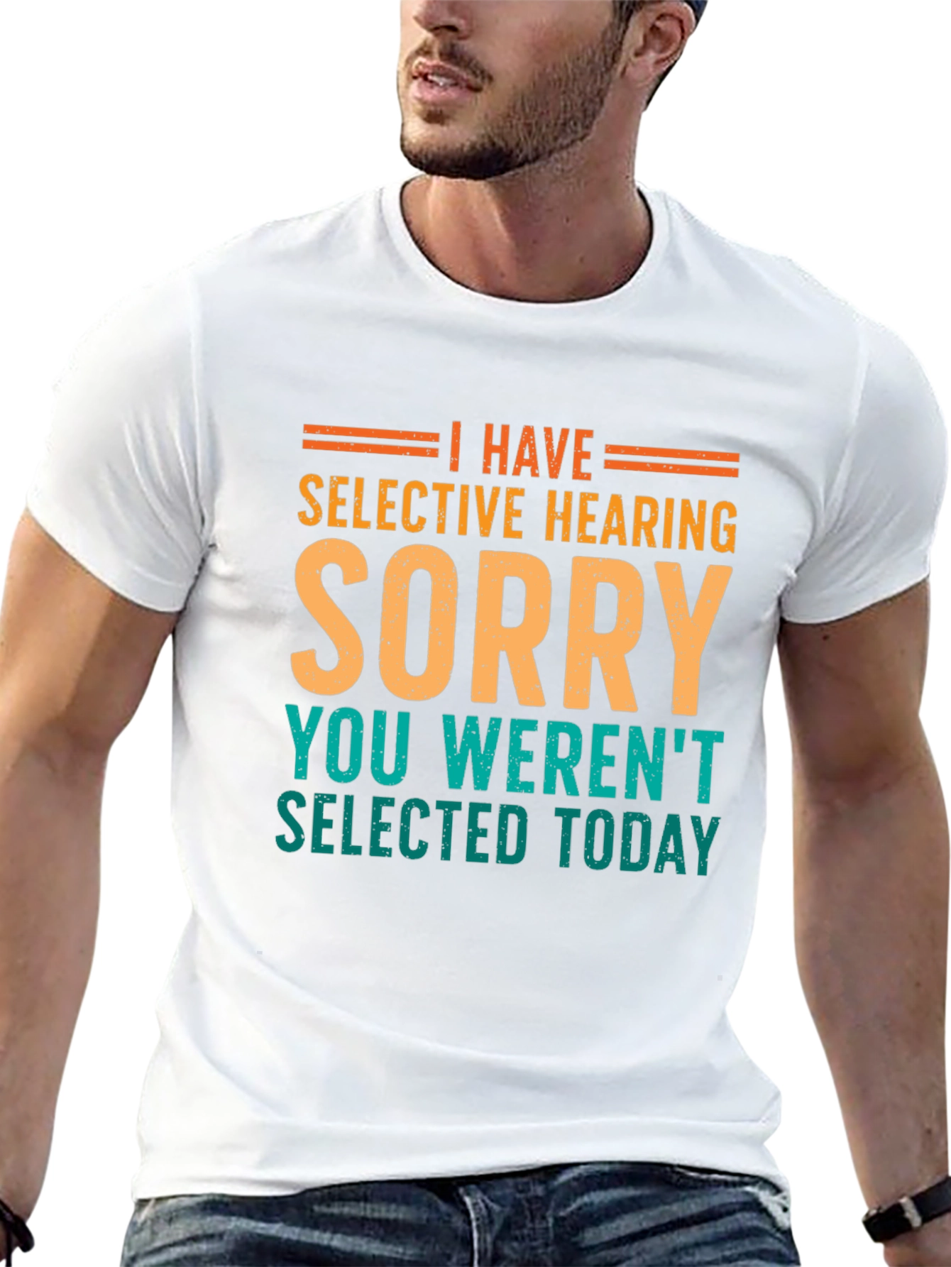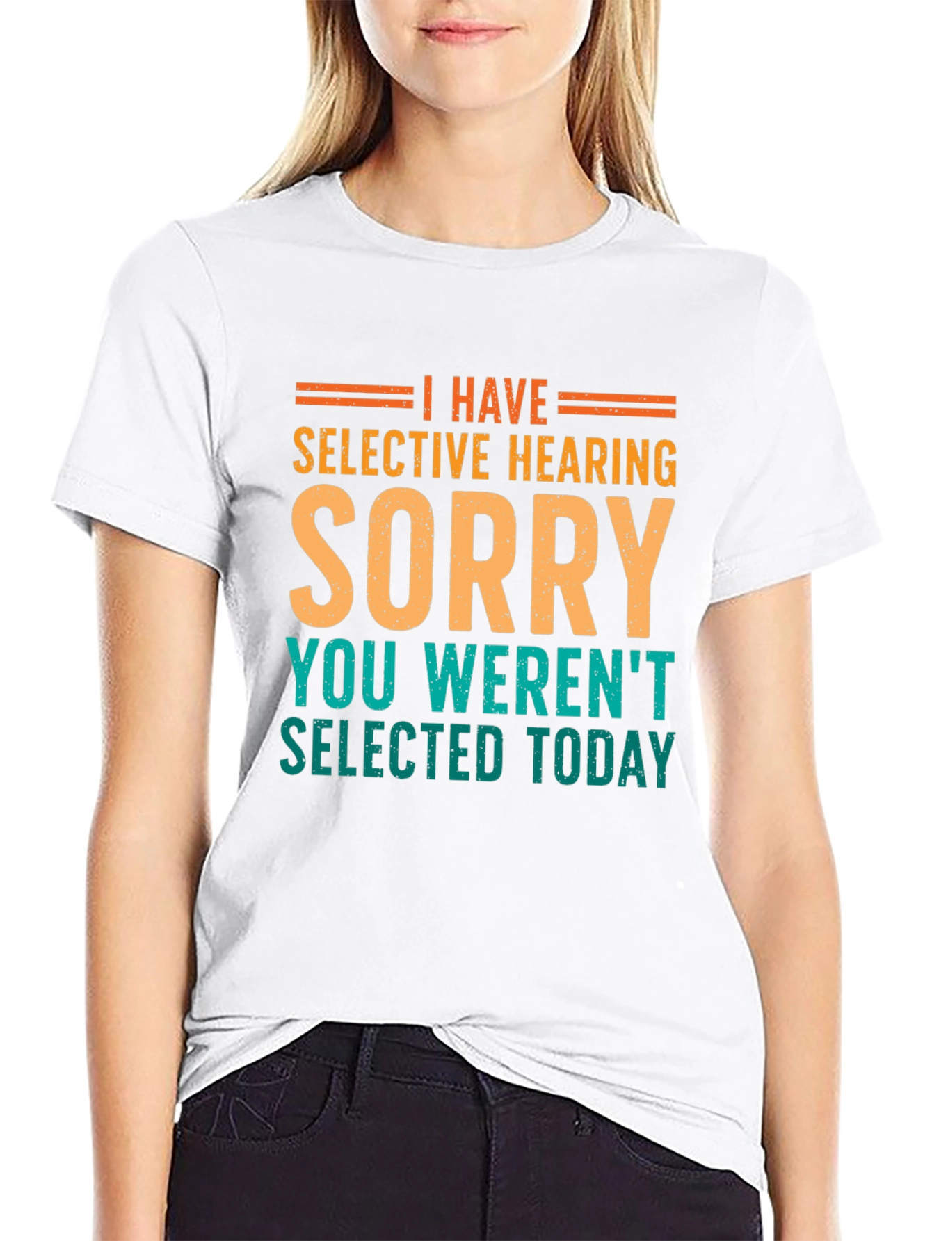 This black t-shirt features a humorous saying in orange and teal fonts. The message reads, "I HAVE SELECTIVE HEARING. SORRY YOU WEREN'T SELECTED TODAY." It is made from a soft-looking fabric, and it appears to be suitable for casual wear. The t-shirt is ideal for those with a sense of humor or anyone who wants to make a statement. This tee would be great to wear for running errands, lounging at home, or hanging out with friends.