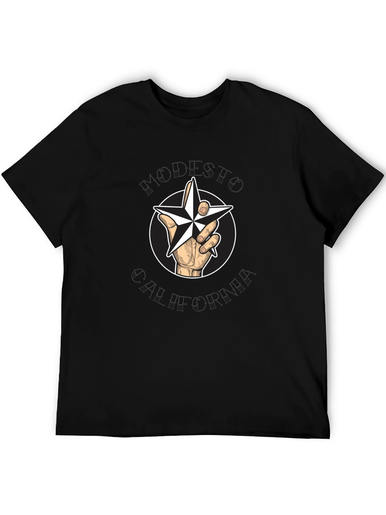 This stylish black t-shirt features a unique graphic print of a hand holding a star within a circular frame. The design provides a modern and edgy look. Made from comfortable, breathable cotton, this tee is perfect for everyday wear. The classic fit ensures a relaxed and flattering silhouette. Ideal for casual outings, concerts, or simply lounging at home, this t-shirt adds a touch of individuality to any outfit. The bold graphic makes it a great conversation starter. Upgrade your wardrobe with this eye-catching and versatile piece.