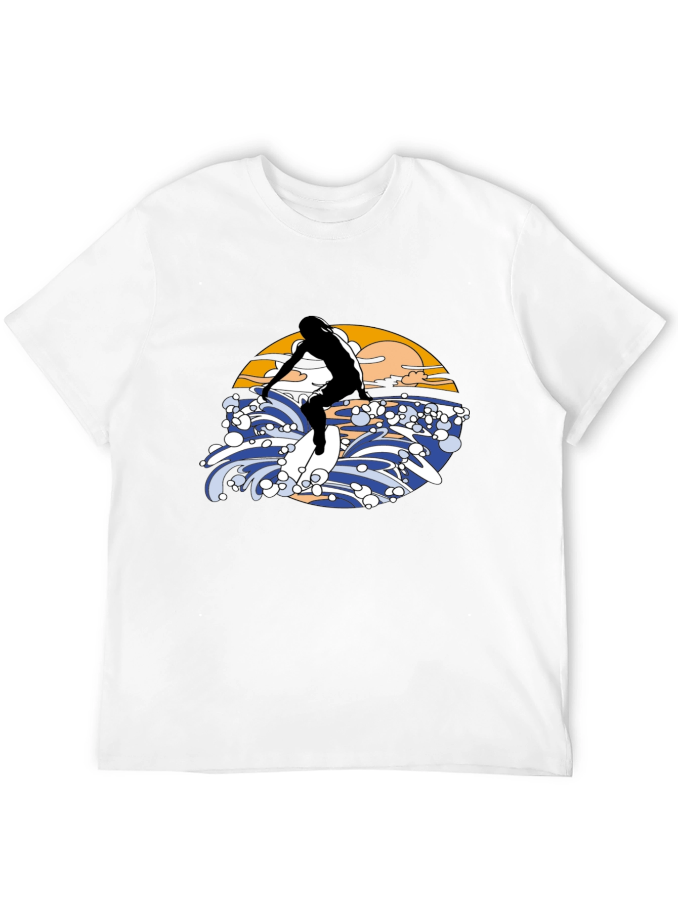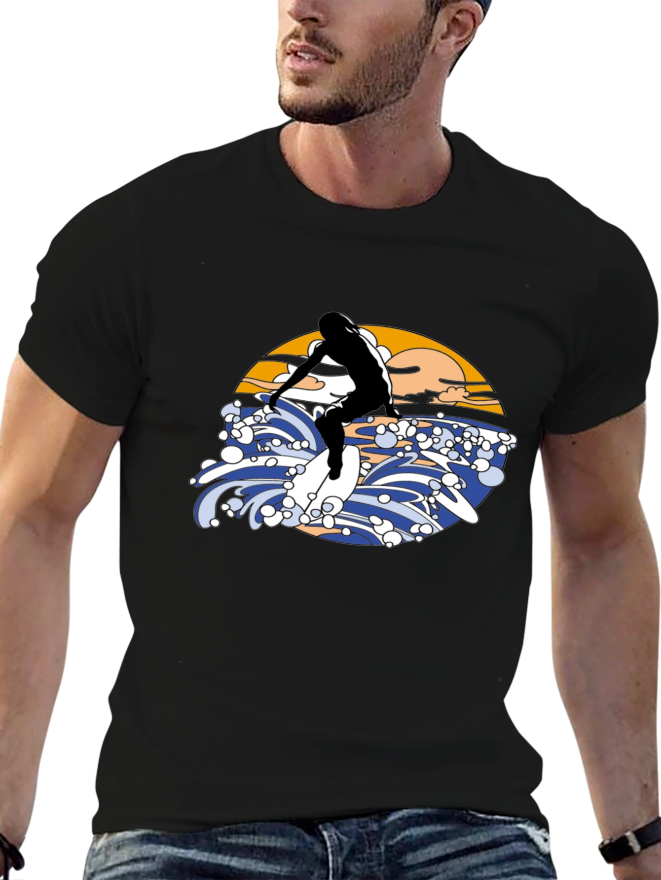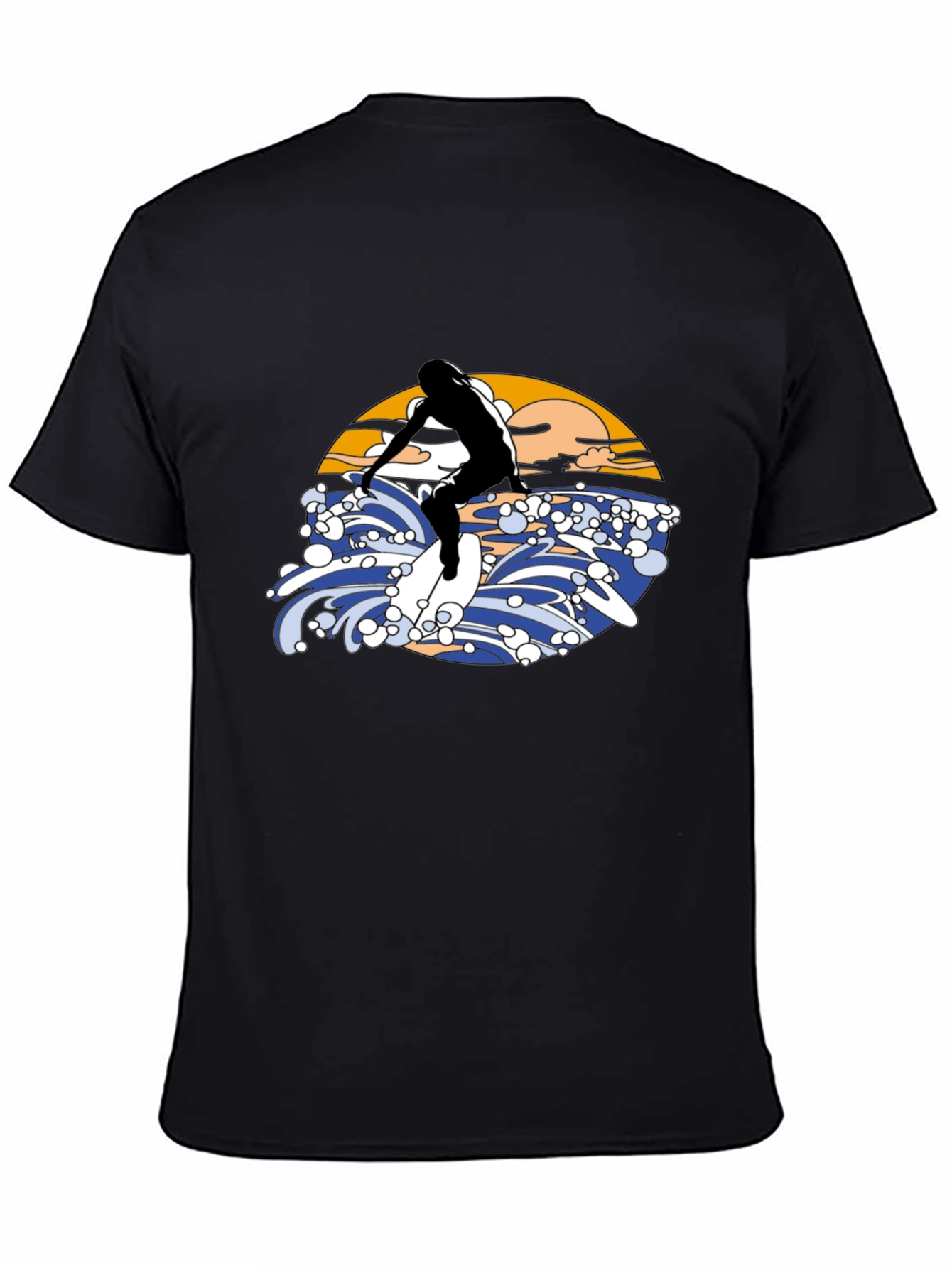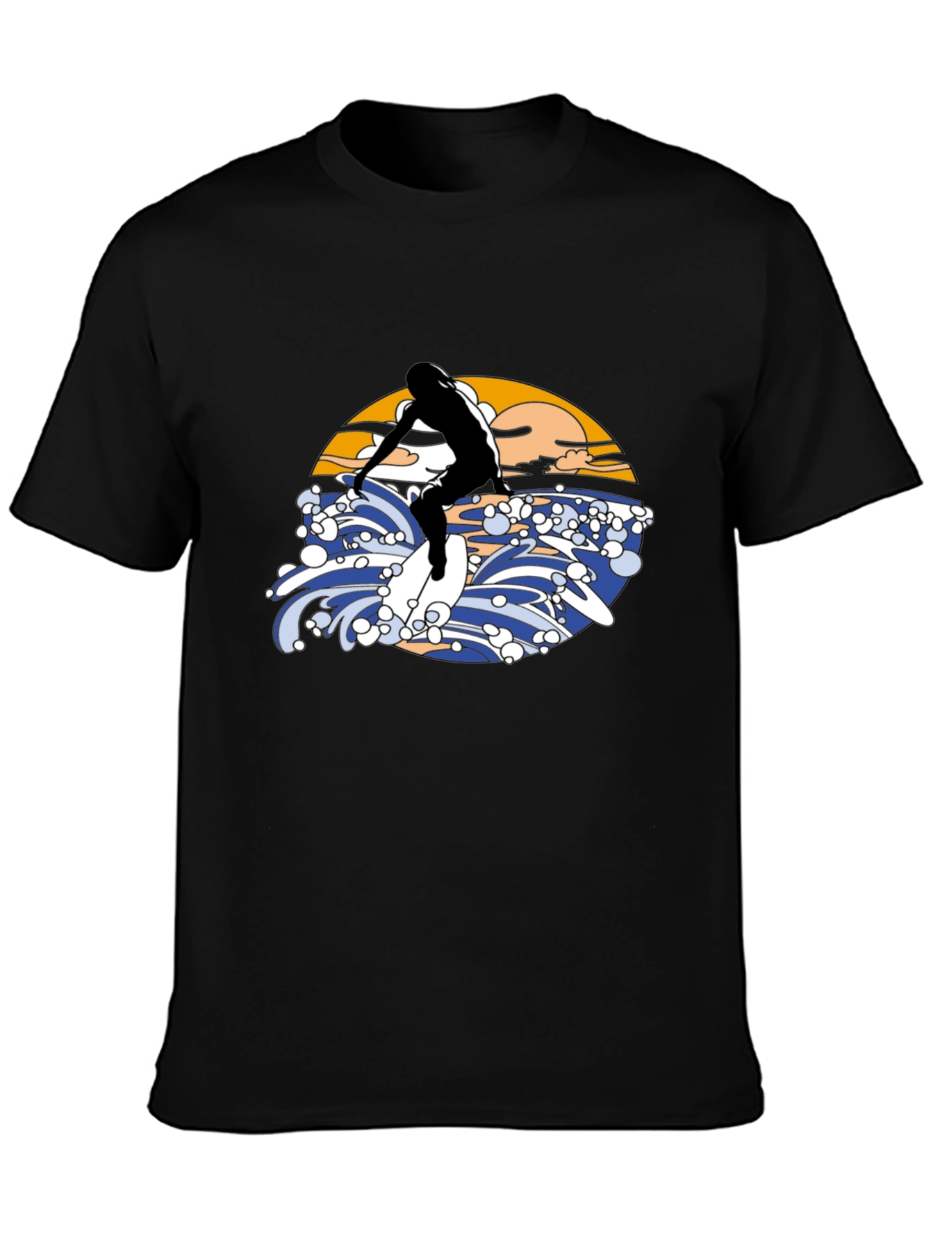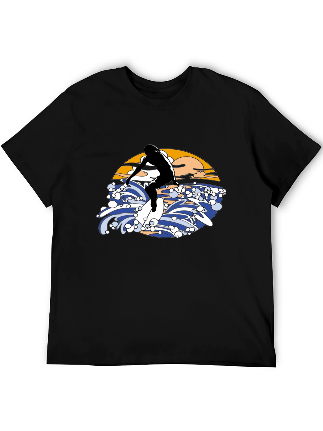 Ride the wave in style with this eye-catching black T-shirt! Featuring a bold graphic design of a surfer riding a wave, complete with a vibrant sunset backdrop. The illustration is rendered in a vintage aesthetic. Made from a comfortable material, this tee is perfect for casual wear, beach outings, or as a statement piece for any surf enthusiast. Stand out from the crowd and express your love for the ocean with this unique T-shirt. Available in various sizes.