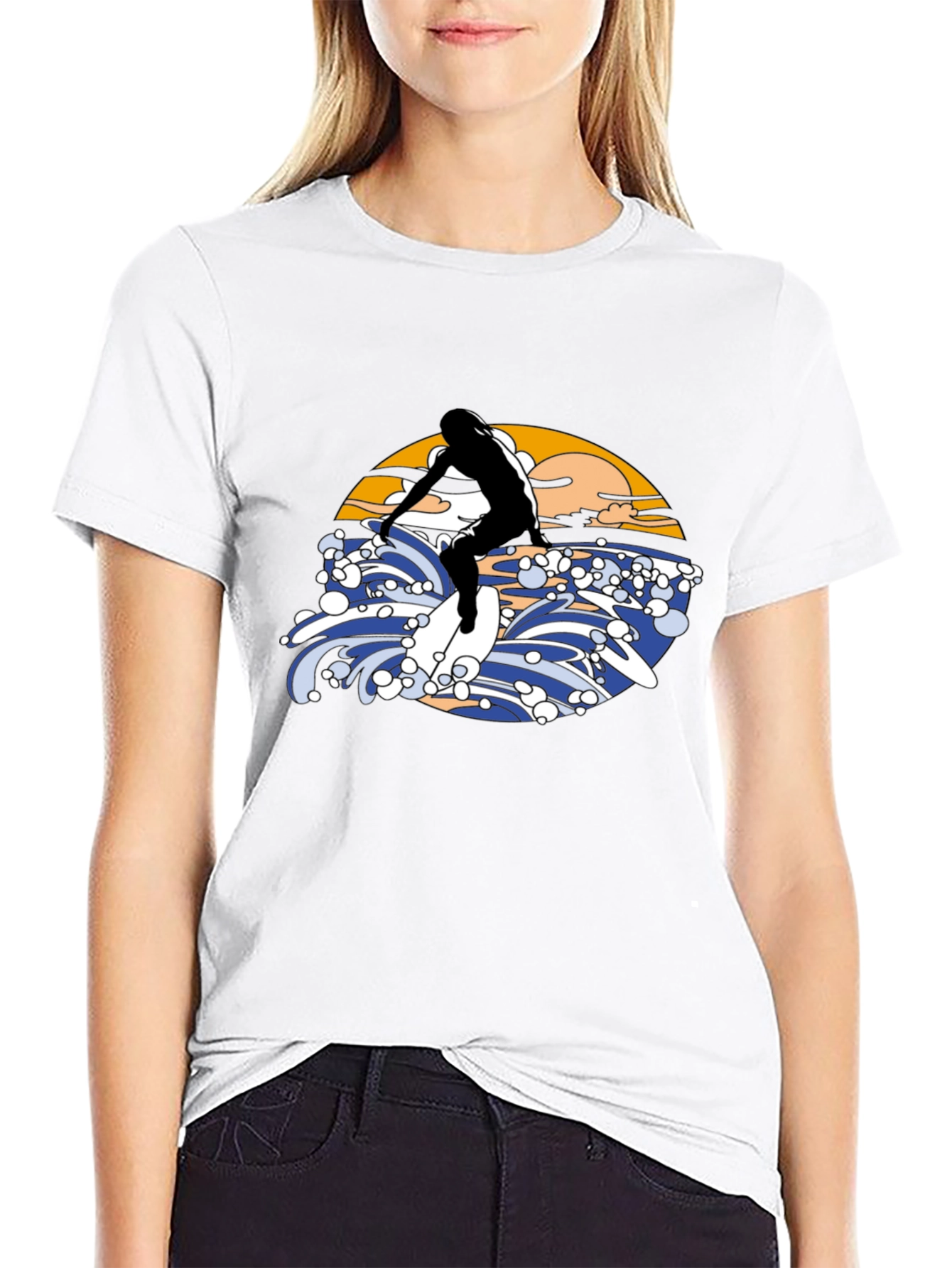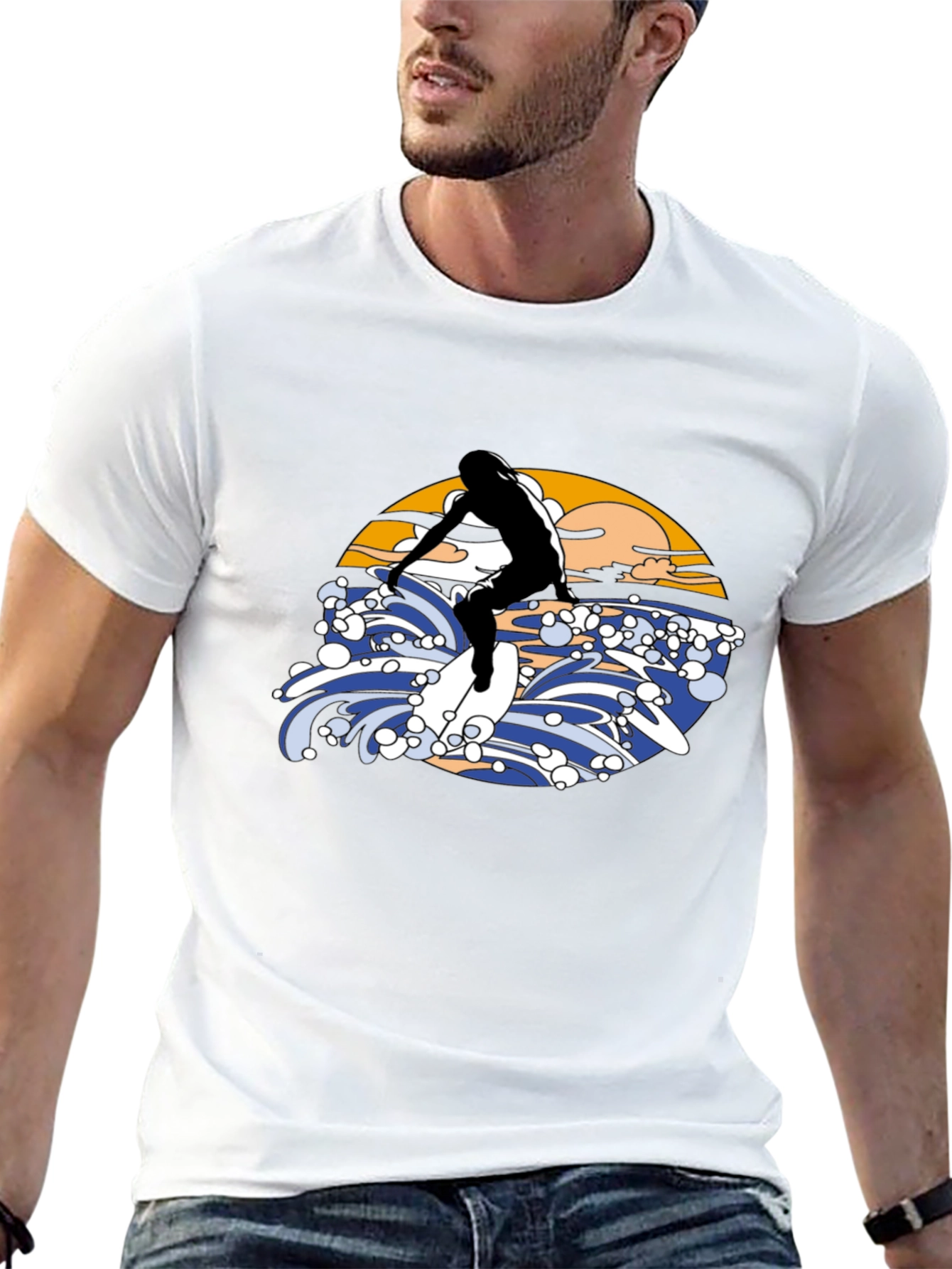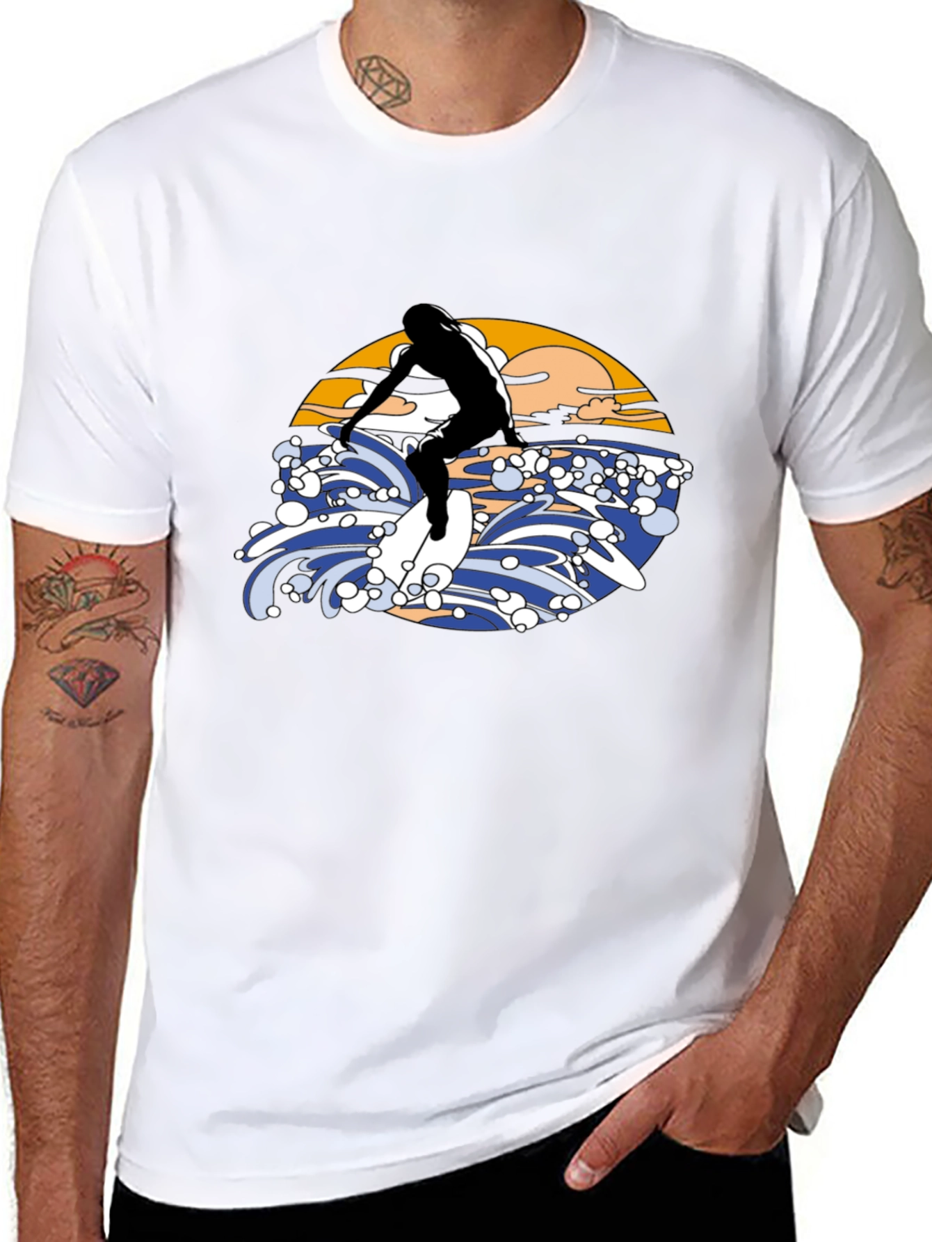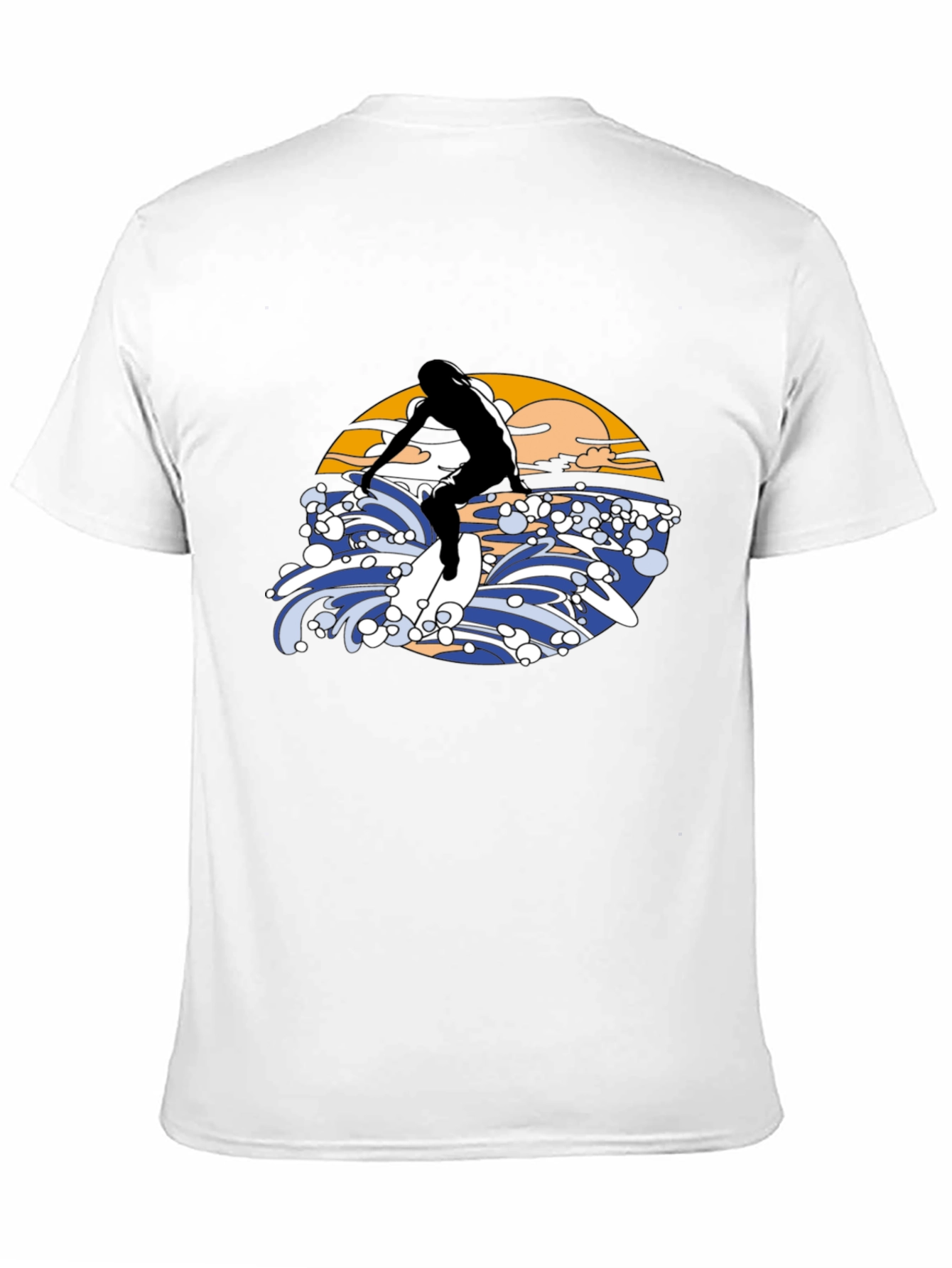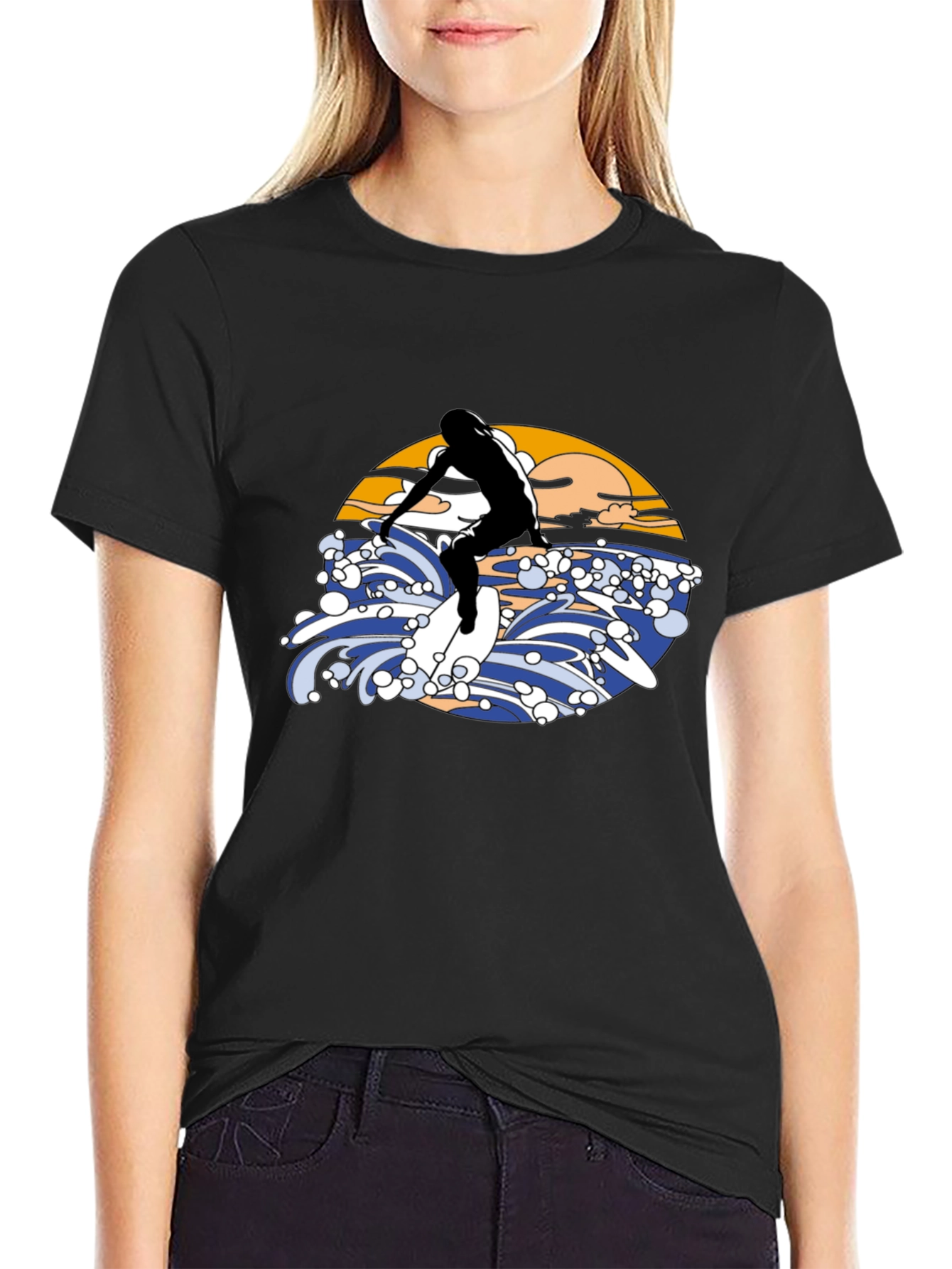 Ride the wave in style with this eye-catching black T-shirt! Featuring a bold graphic design of a surfer riding a wave, complete with a vibrant sunset backdrop. The illustration is rendered in a vintage aesthetic. Made from a comfortable material, this tee is perfect for casual wear, beach outings, or as a statement piece for any surf enthusiast. Stand out from the crowd and express your love for the ocean with this unique T-shirt. Available in various sizes.