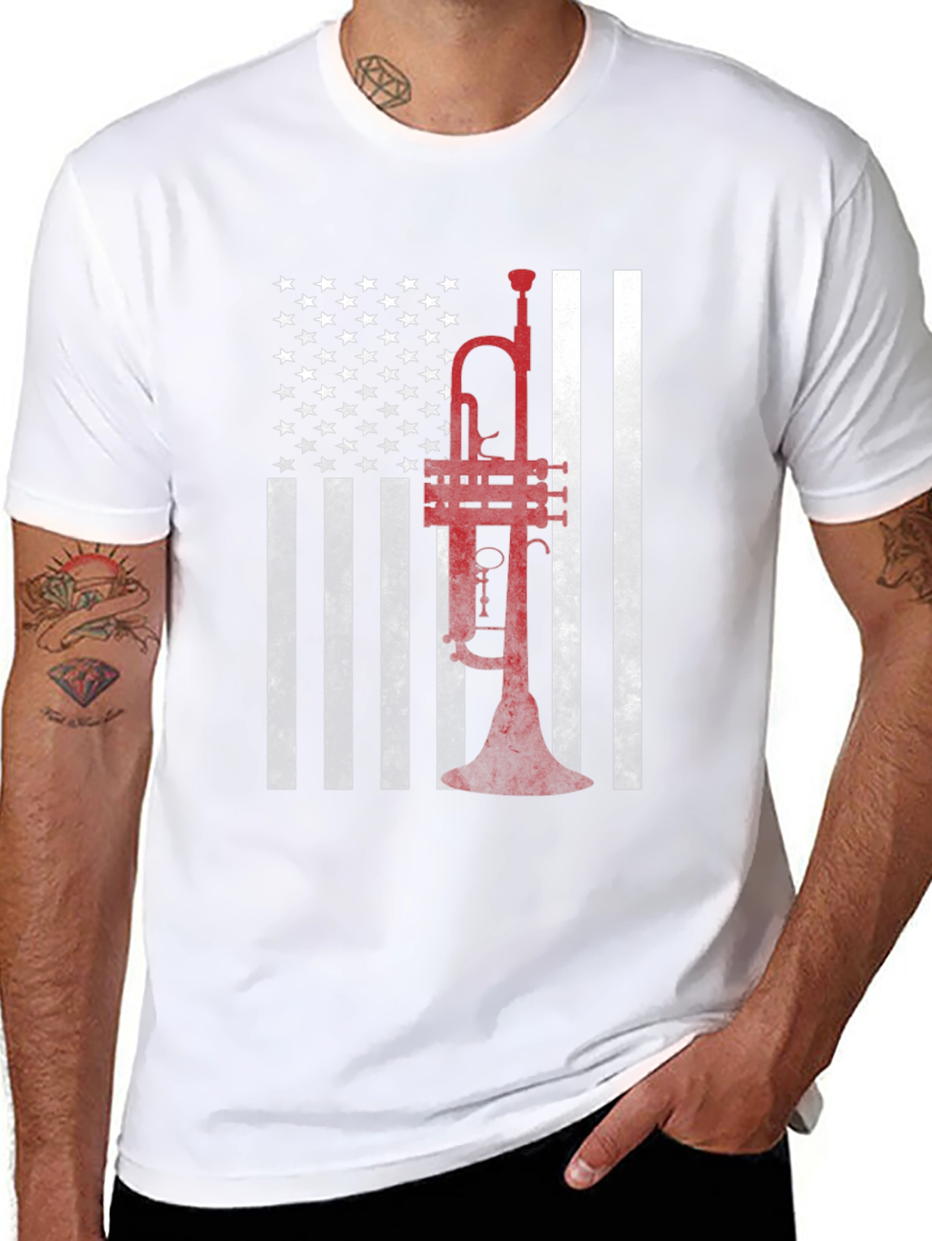 Show off your love for music and patriotism with this unique t-shirt. This black tee features a graphic design combining the American flag with a stylized trumpet. The distressed effect gives it a vintage feel. Made from a comfortable fabric, this shirt is perfect for casual wear, concerts, or music events. The eye-catching design is sure to spark conversation and express your passion for both music and country. Get yours today and wear your interests with pride!