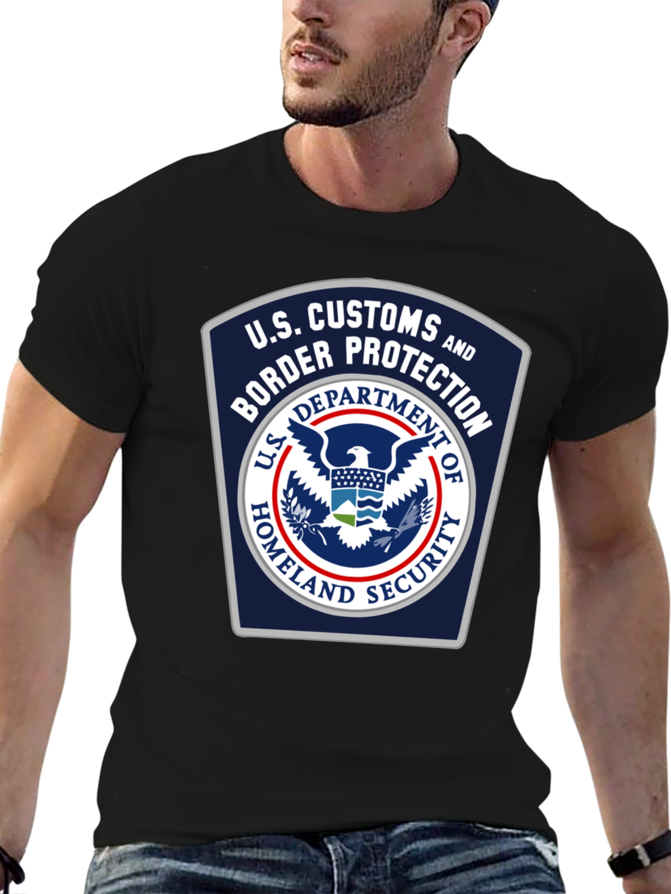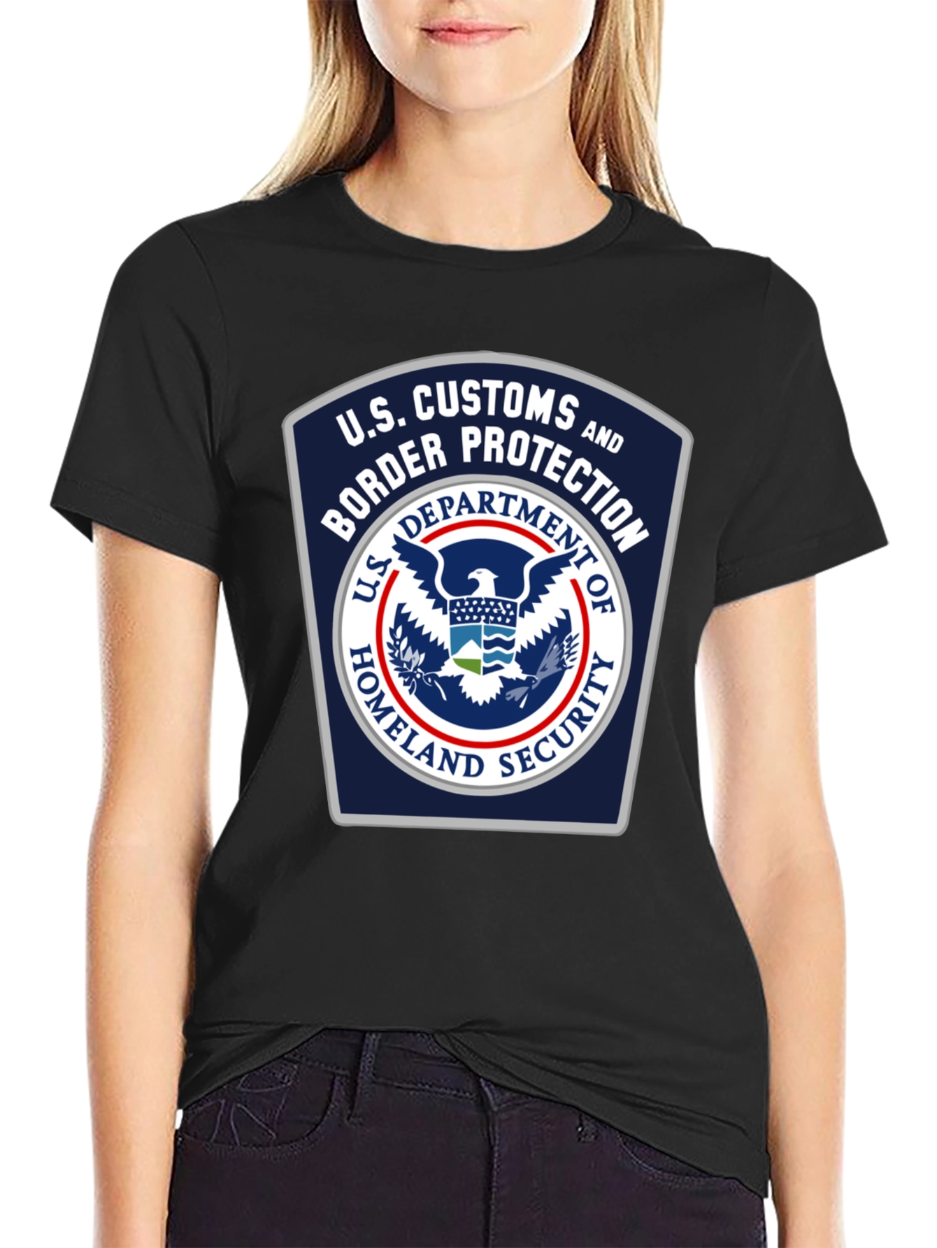 Show your support with this black U.S. Customs and Border Protection t-shirt. This striking tee features the official CBP logo prominently displayed on the chest. Made from what appears to be a comfortable and durable fabric, this shirt is perfect for everyday wear. The design includes the U.S. Customs and Border Protection seal with "U.S. Customs and Border Protection" arching above the seal. "Department of Homeland Security" arcs below. This classic design makes it a great way to show your pride or support for those serving to protect our borders. This stylish and meaningful t-shirt will quickly become a wardrobe favorite.
