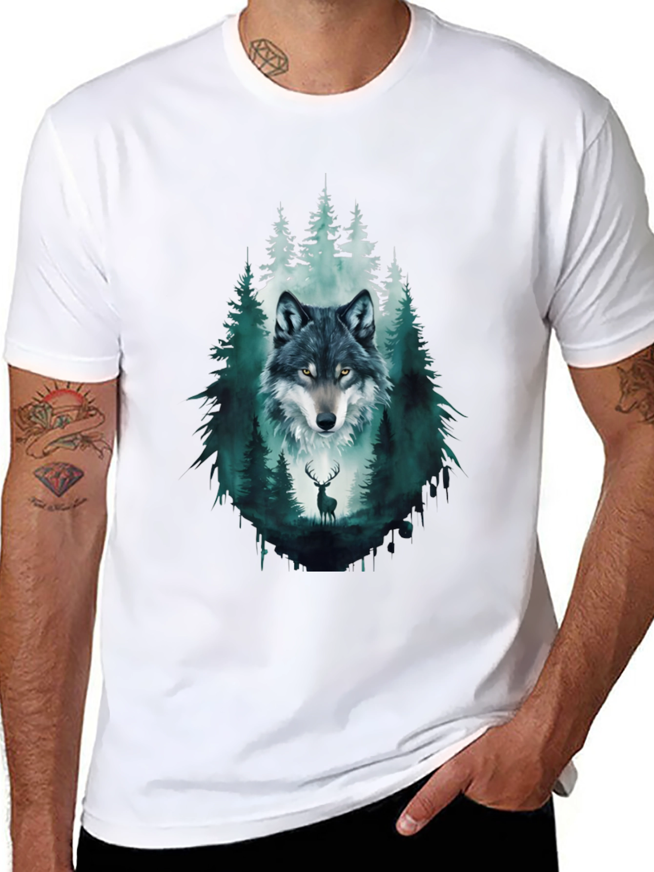 This eye-catching black t-shirt features a striking graphic design of a wolf in a forest setting. The detailed artwork combines the fierce presence of a wolf with a serene forest landscape, complete with pine trees and a silhouette of a deer in the background. Made from what appears to be a comfortable, breathable fabric, this tee is perfect for casual wear, outdoor adventures, or anyone who appreciates wildlife-inspired fashion. The bold print makes a statement, while the classic fit ensures all-day comfort. A must-have for nature lovers and fans of unique graphic tees.